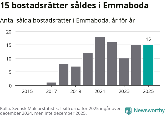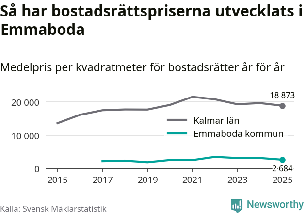När det gäller bostadsrätter i Emmaboda kommun såldes 15 under året. Snittet per kvadratmeter landade på omkring 2 700 kronor. Det är en minskning jämfört med förra året.