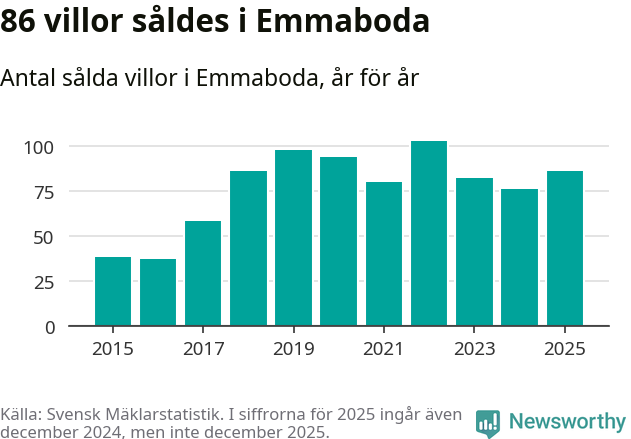 1,1 miljoner kronor är medelpriset för de villor som såldes i Emmaboda kommun under året, eller 9 126 kronor per kvadratmeter. Det innebär en prisökning med 14 procent på ett år. Det är det högsta årssnittet på åtminstone tio år. Bryter man upp siffrorna per kvartal har dock ännu högre villapriser noterats i Emmaboda vintern 2021/22.