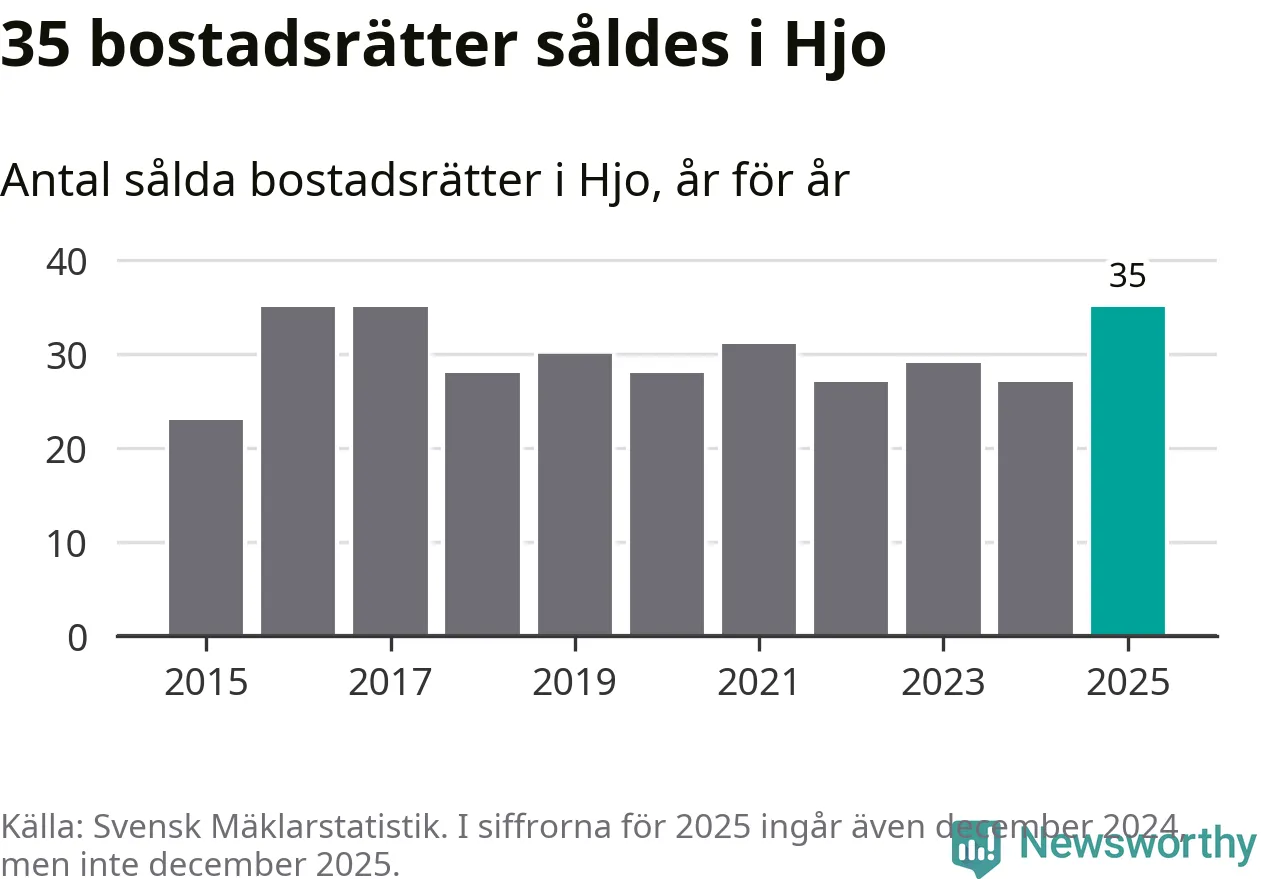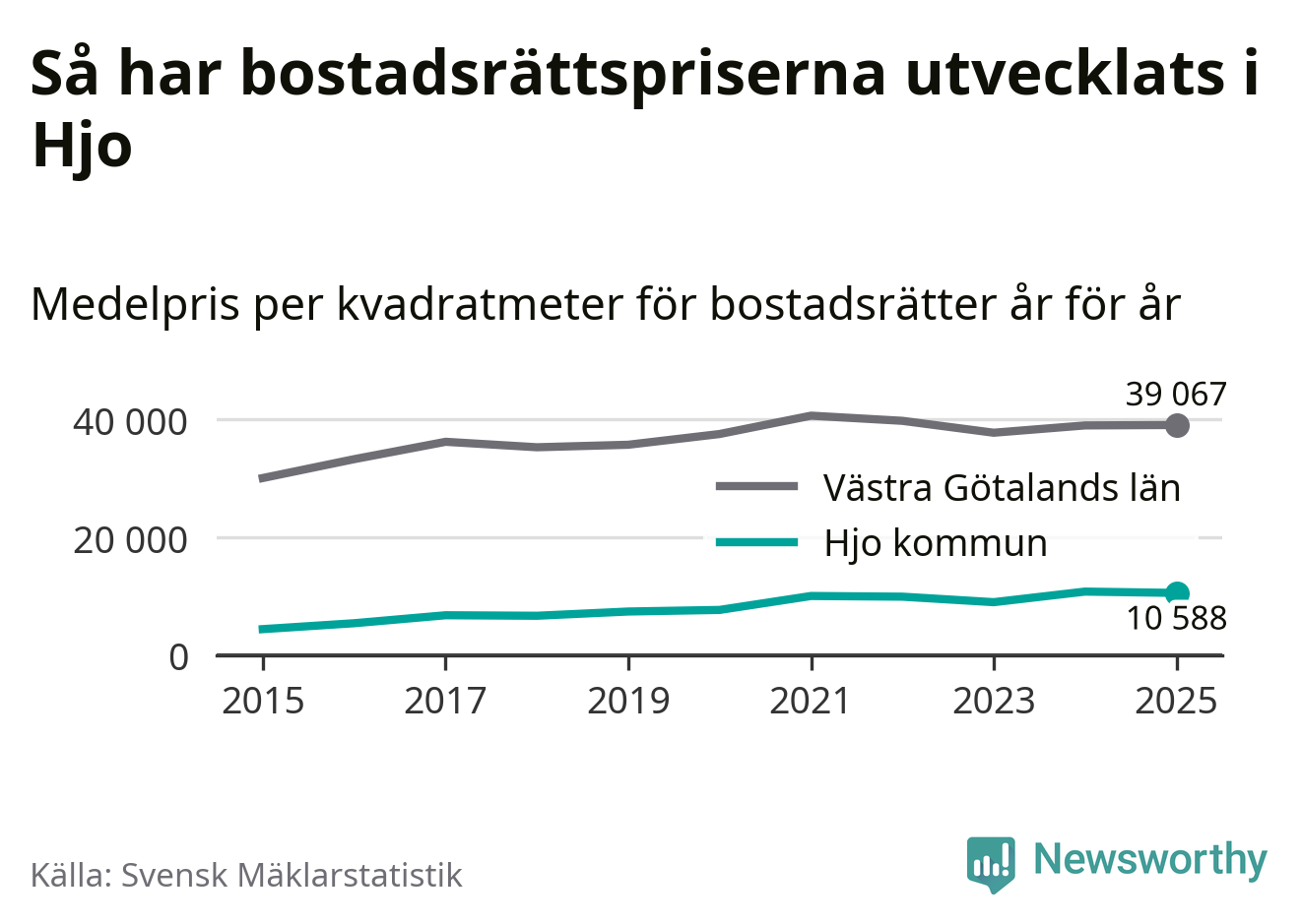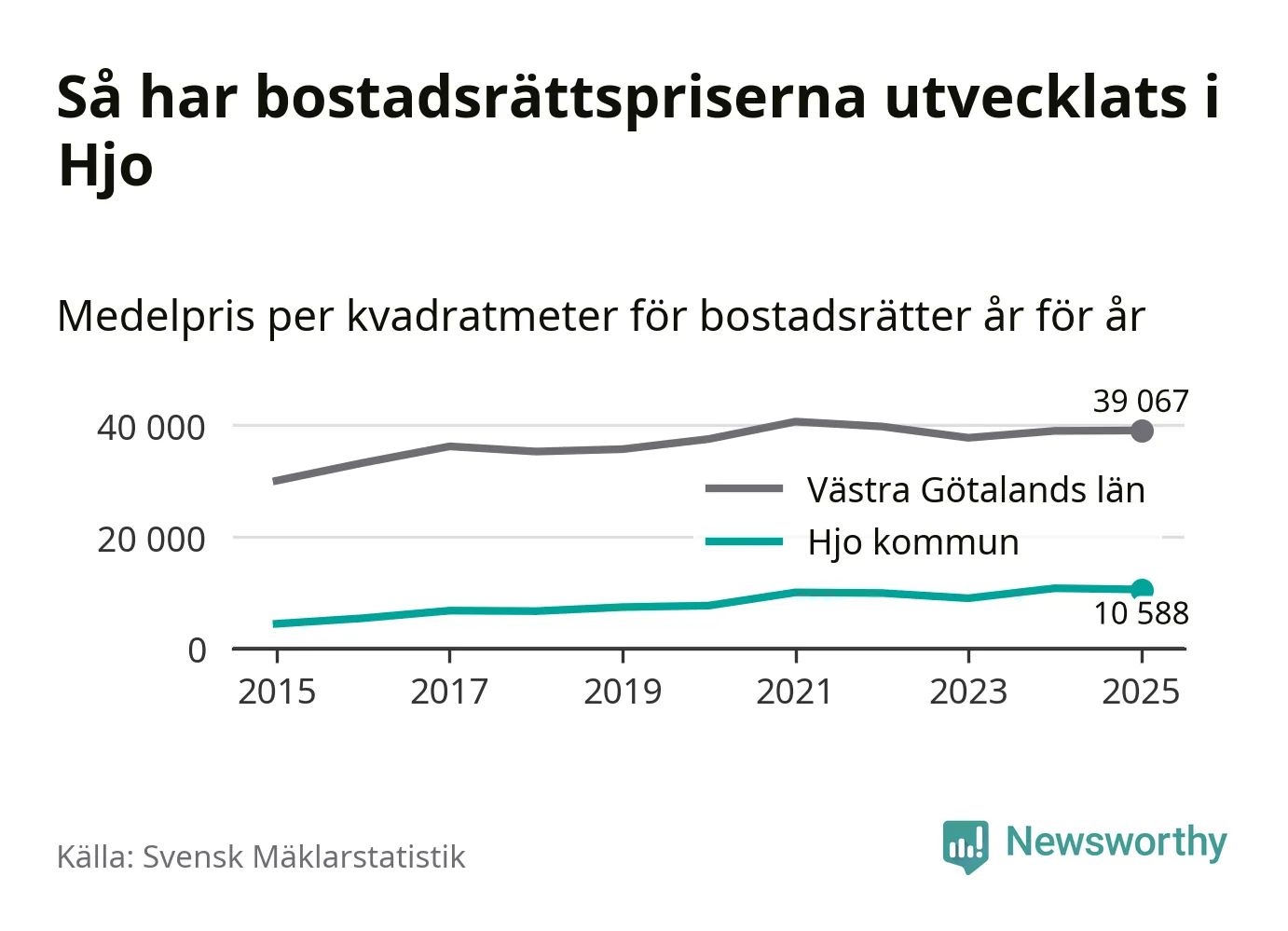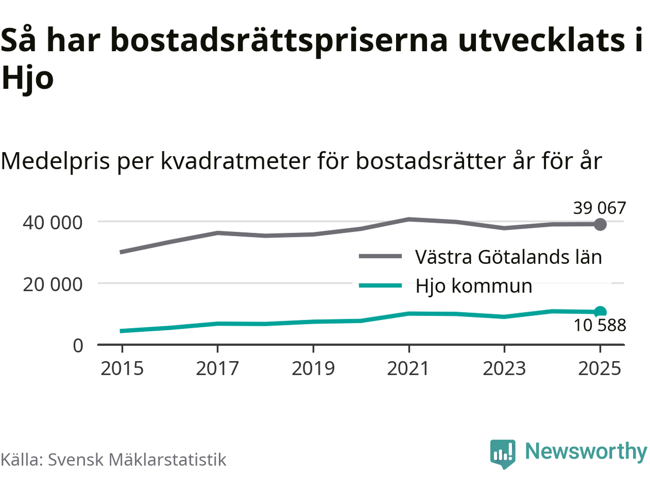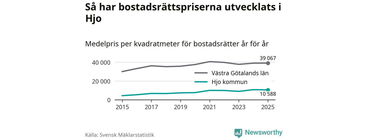 Det såldes totalt 35 bostadsrätter i Hjo kommun under året. Genomsnittspriset per kvadratmeter landade på 10 588 kronor. Det är en minskning med två procent i kommunen på ett år.