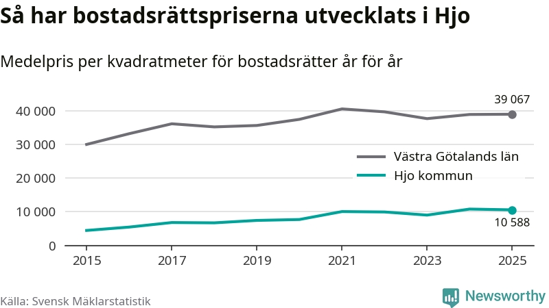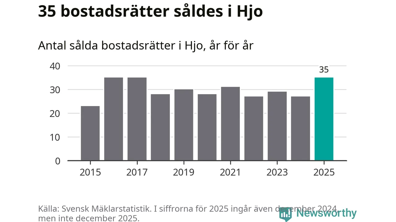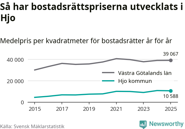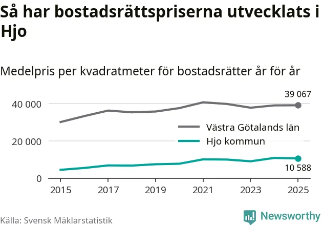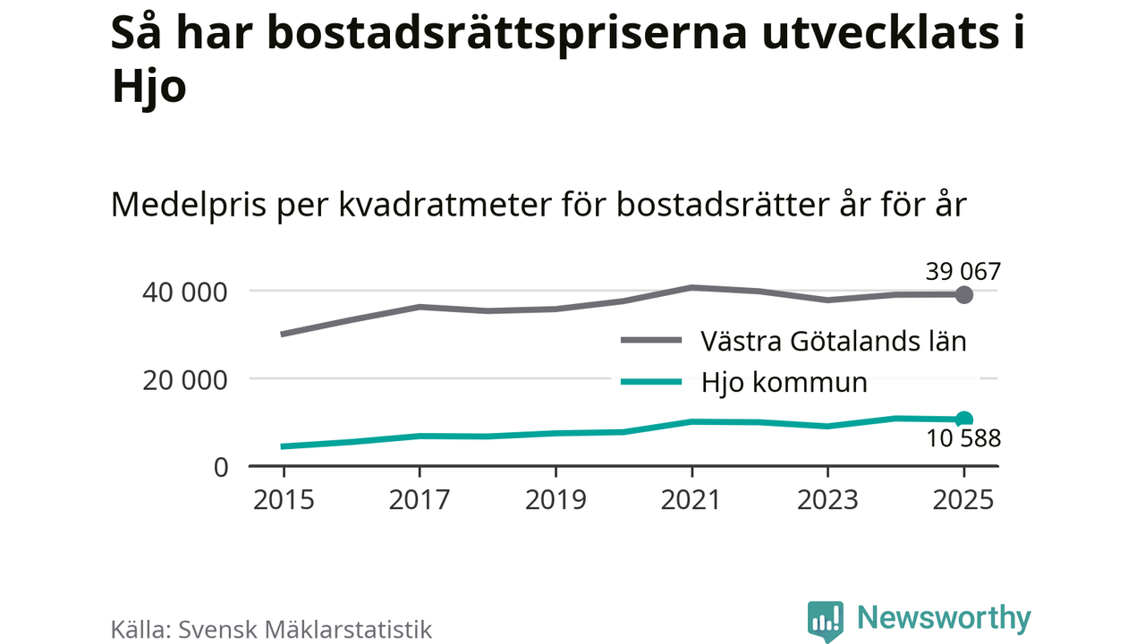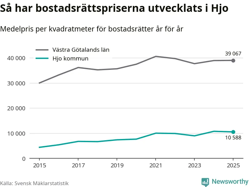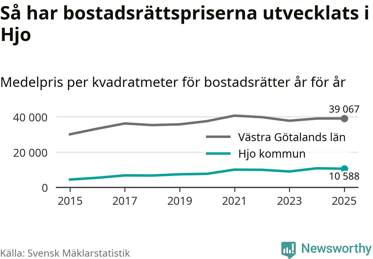 Det såldes totalt 35 bostadsrätter i Hjo kommun under året. Genomsnittspriset per kvadratmeter landade på 10 588 kronor. Det är en minskning med två procent i kommunen på ett år.
