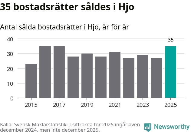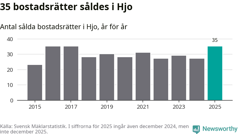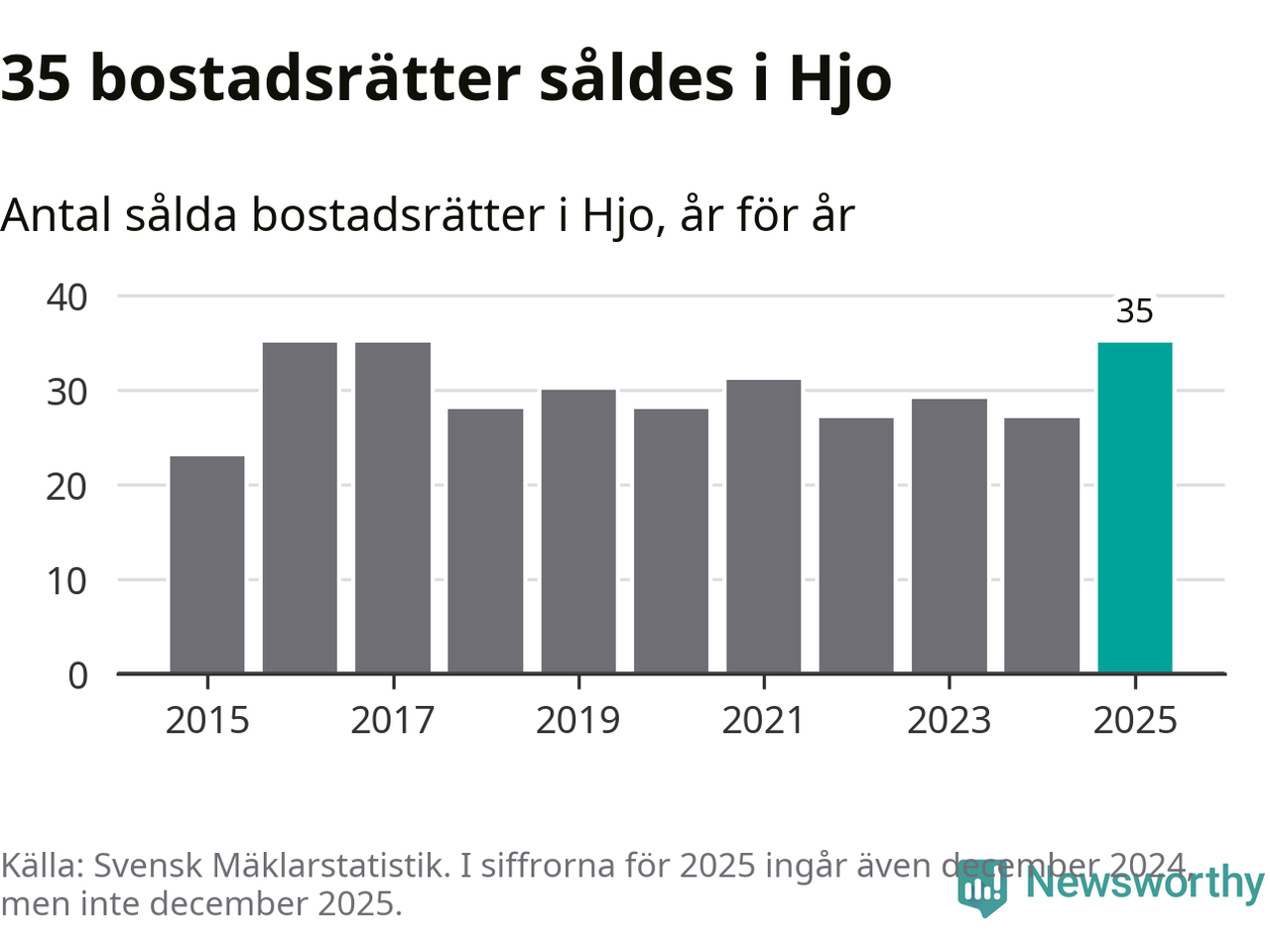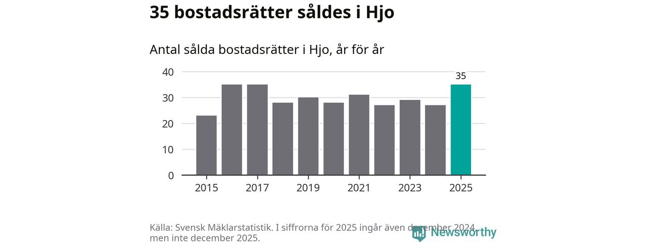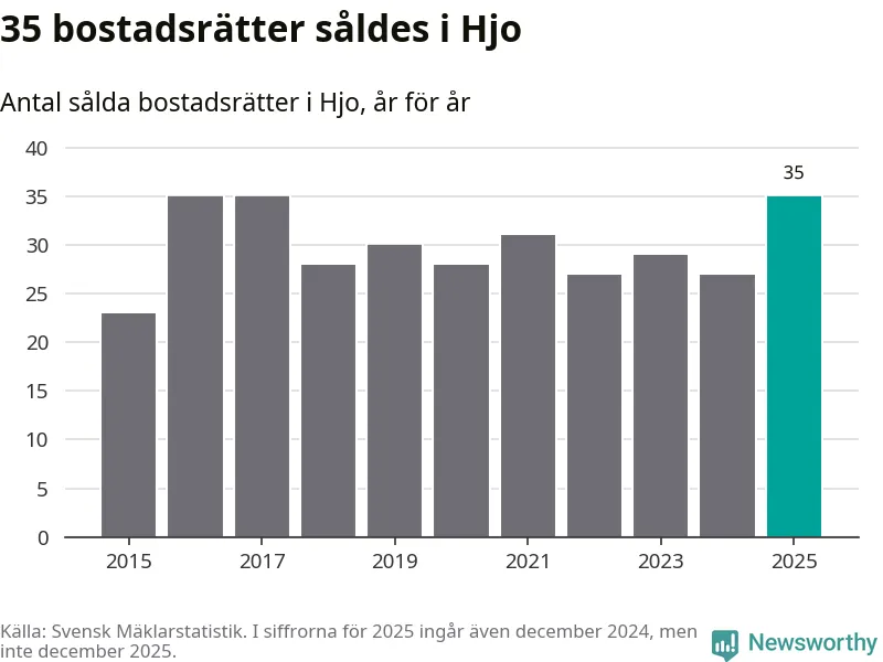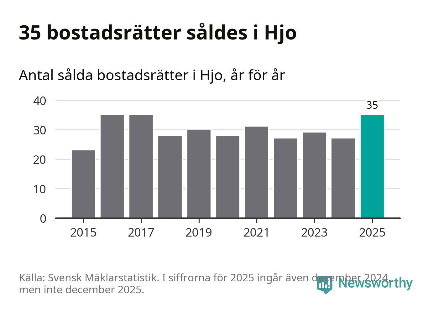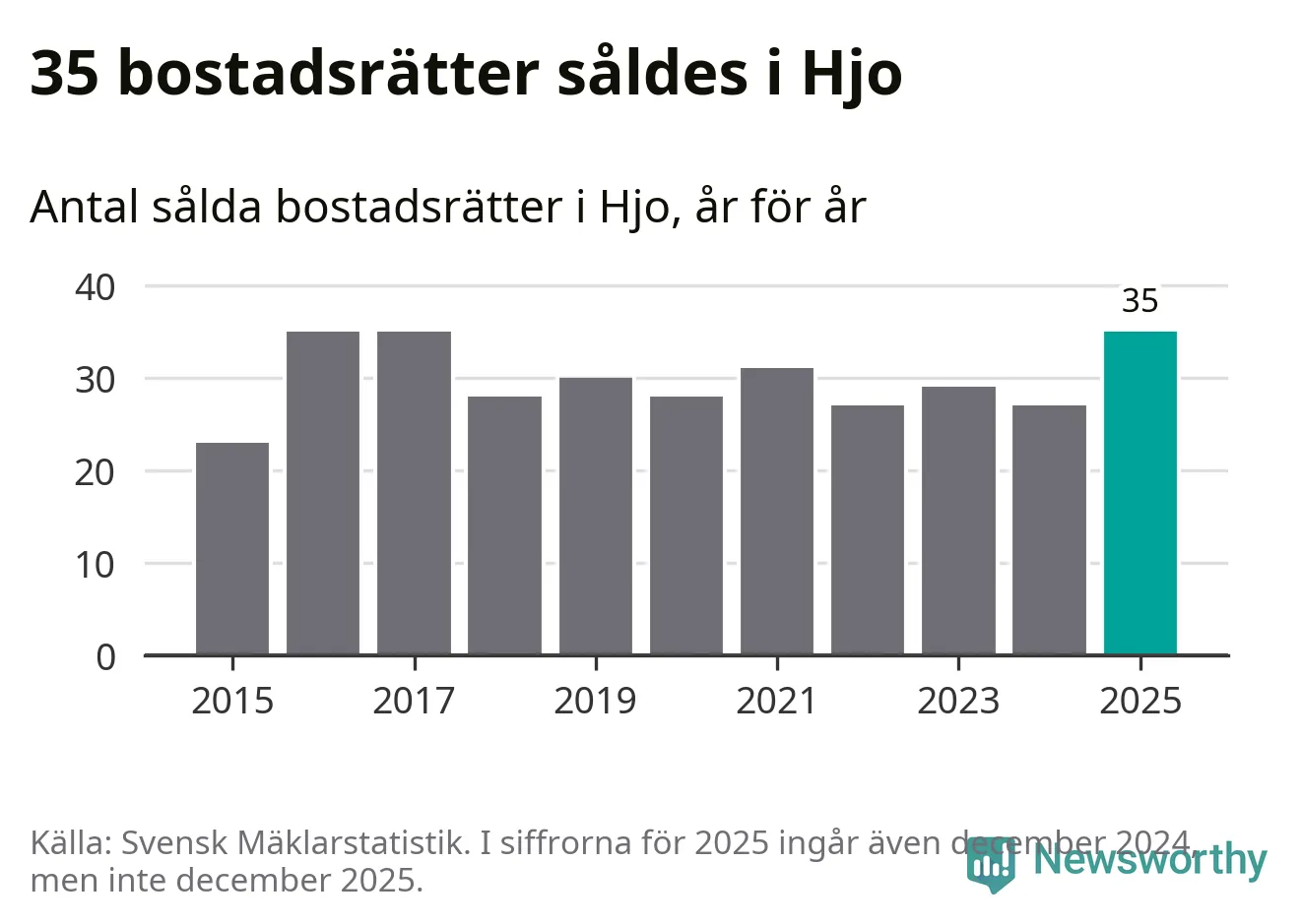 Det såldes totalt 35 bostadsrätter i Hjo kommun under året. Genomsnittspriset per kvadratmeter landade på 10 588 kronor. Det är en minskning med två procent i kommunen på ett år.