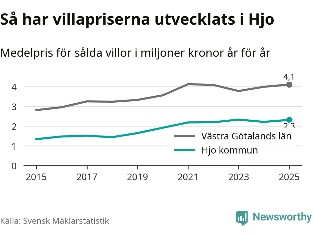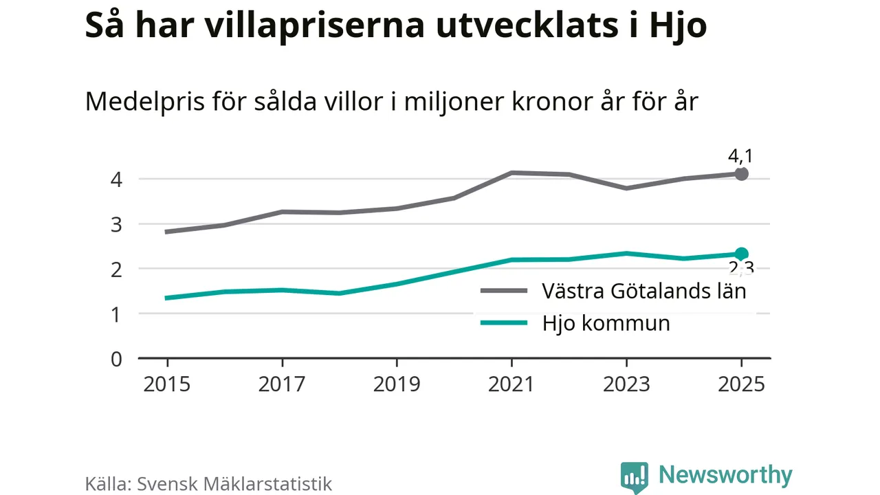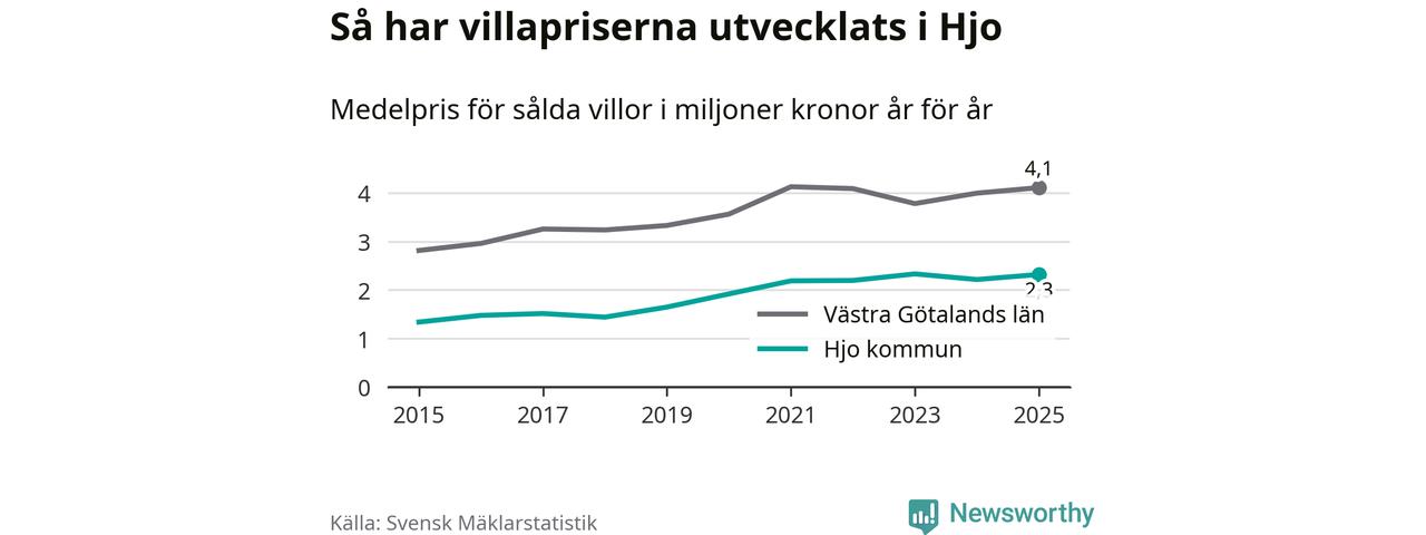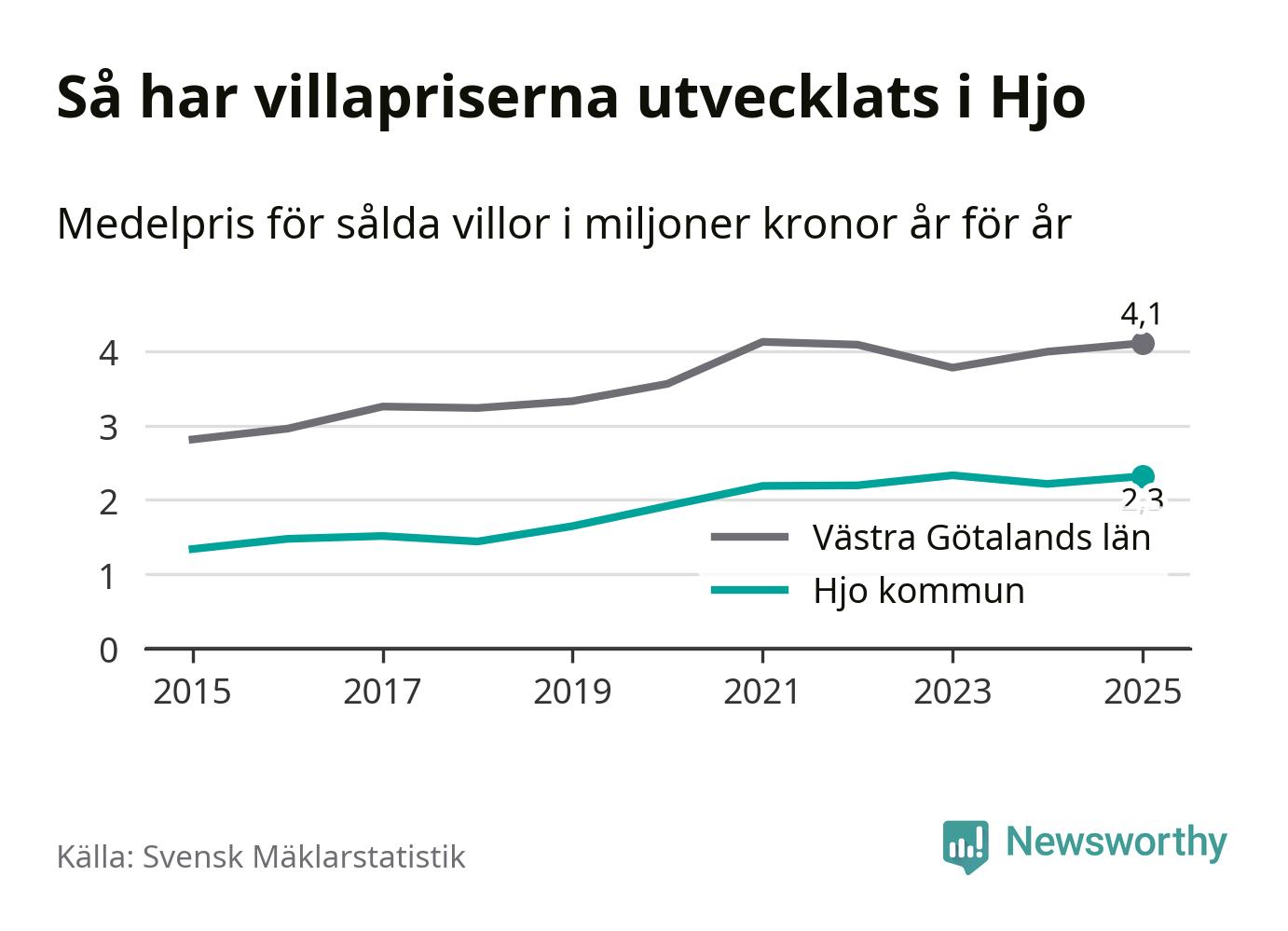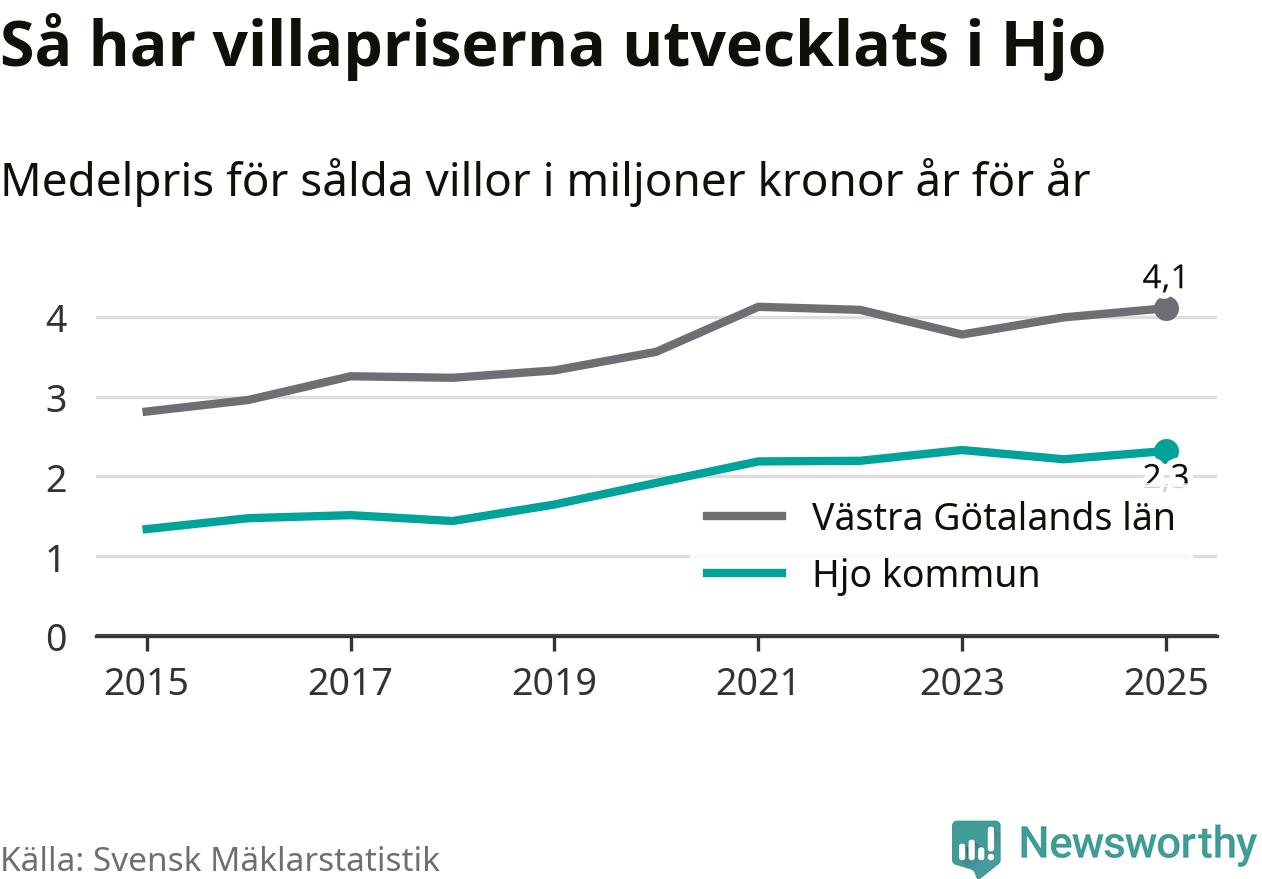 2,3 miljoner kronor är medelpriset för de villor som såldes i Hjo kommun under året, eller 20 855 kronor per kvadratmeter. Det innebär en prisökning med fem procent på ett år.