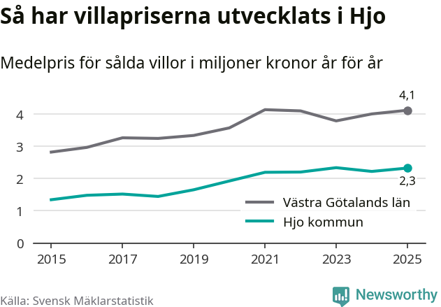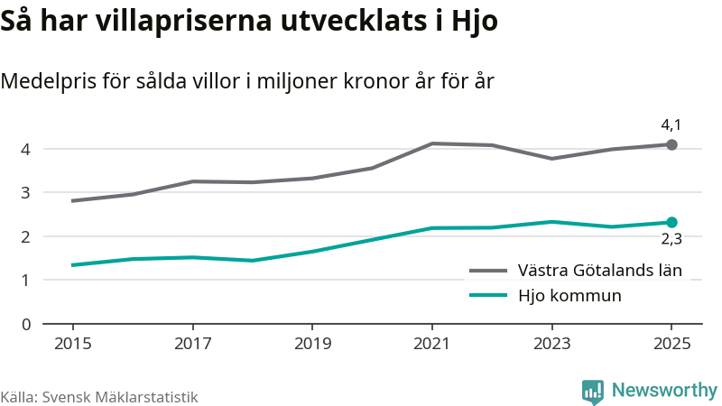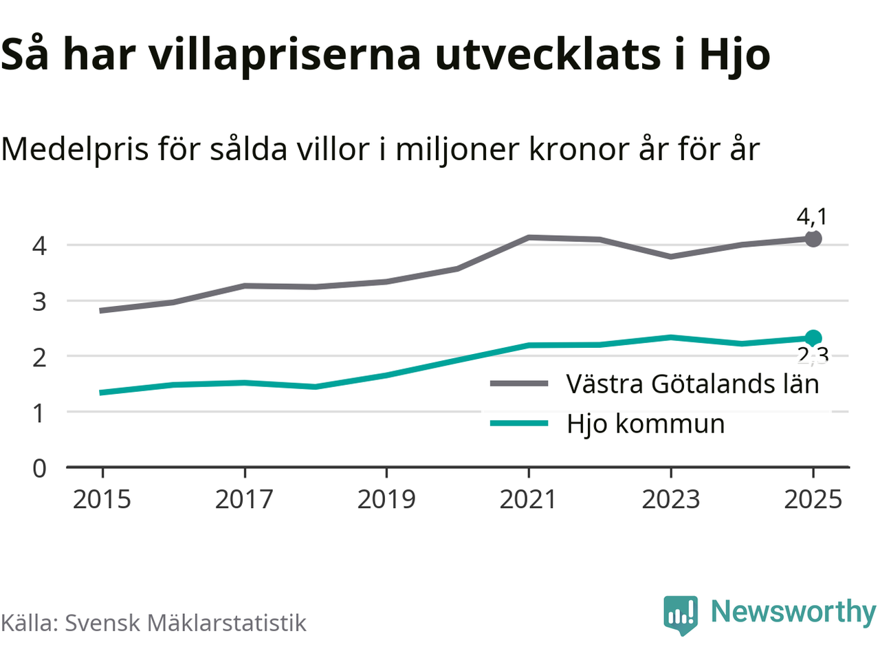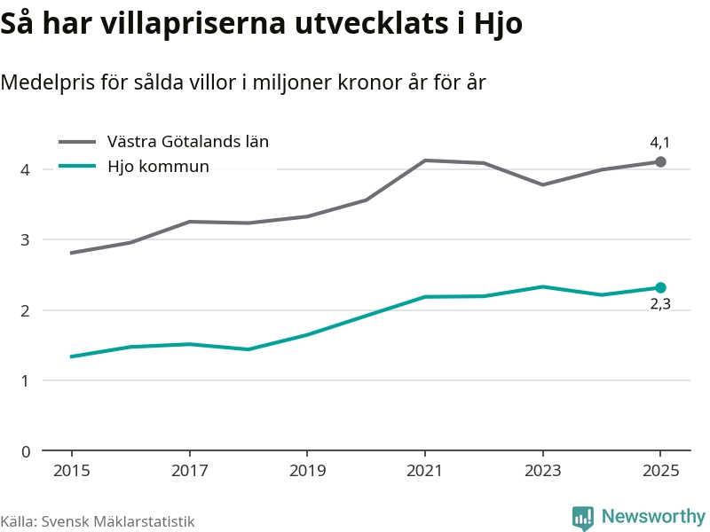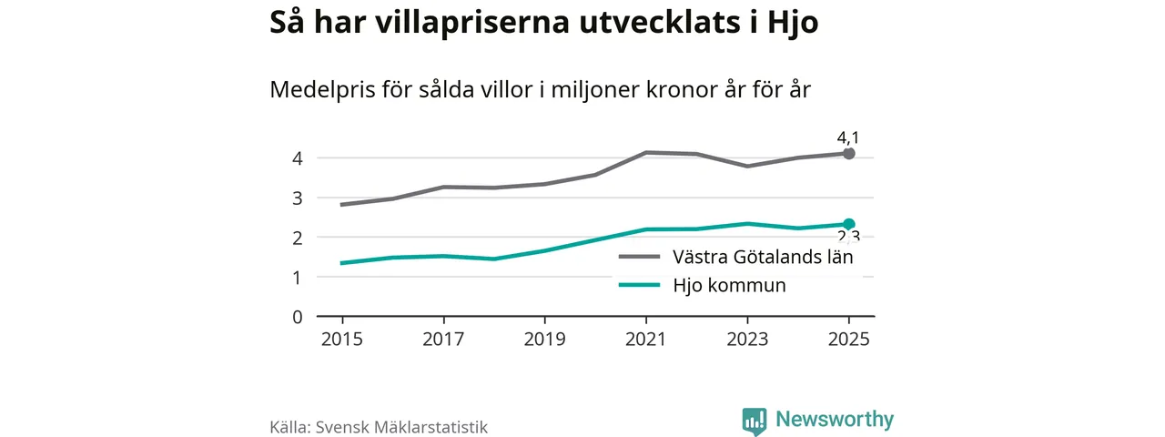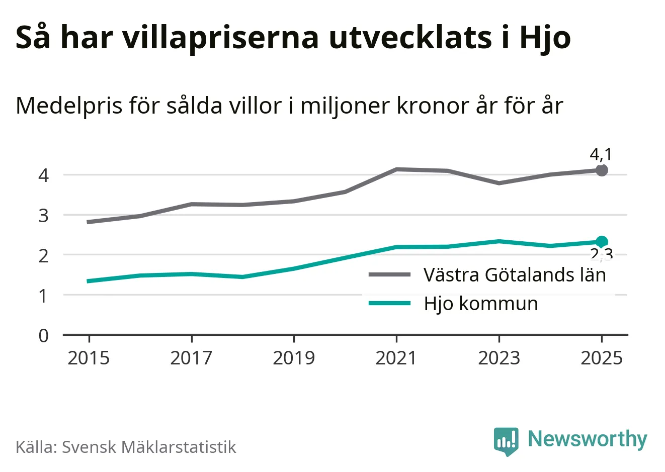 2,3 miljoner kronor är medelpriset för de villor som såldes i Hjo kommun under året, eller 20 855 kronor per kvadratmeter. Det innebär en prisökning med fem procent på ett år.