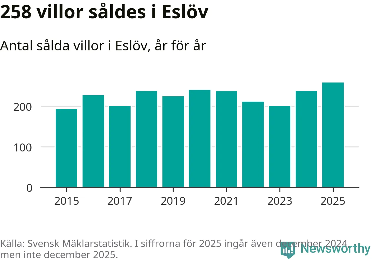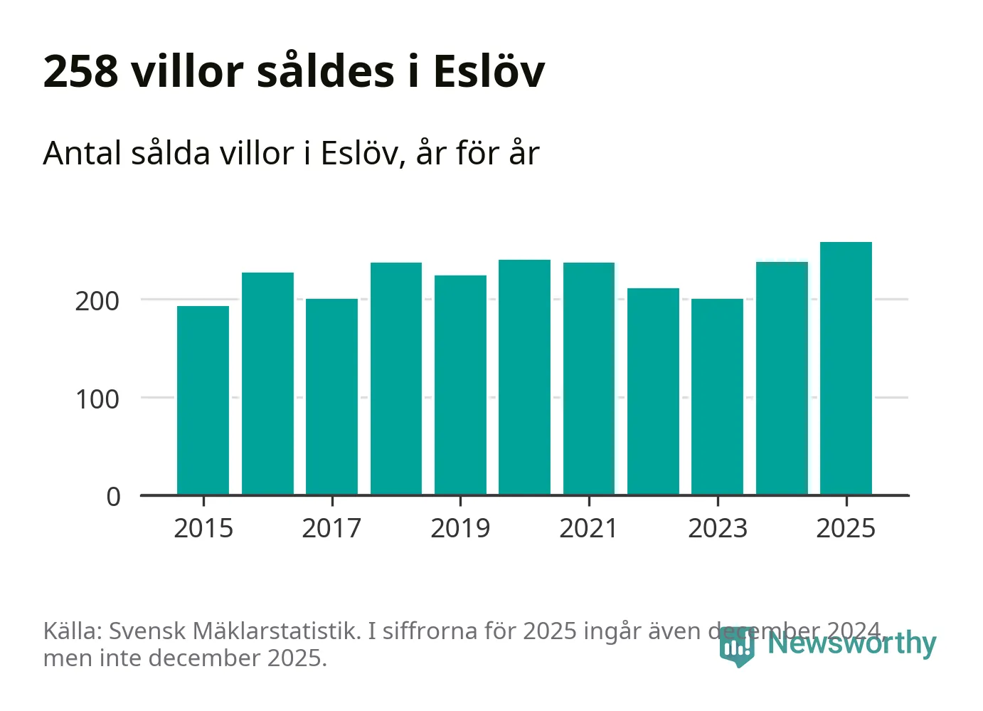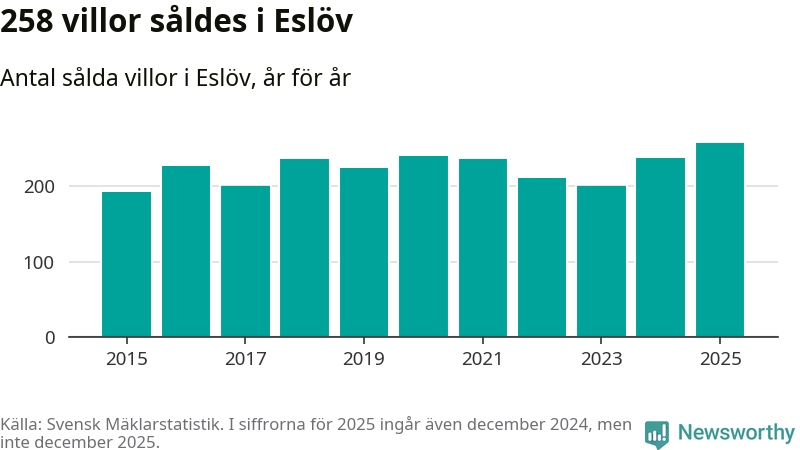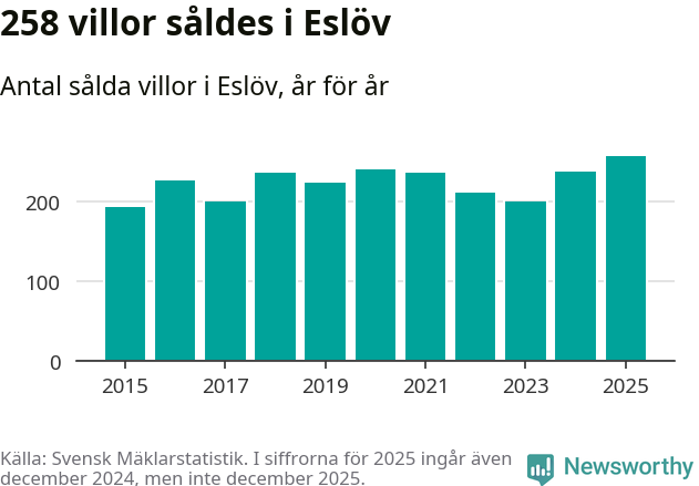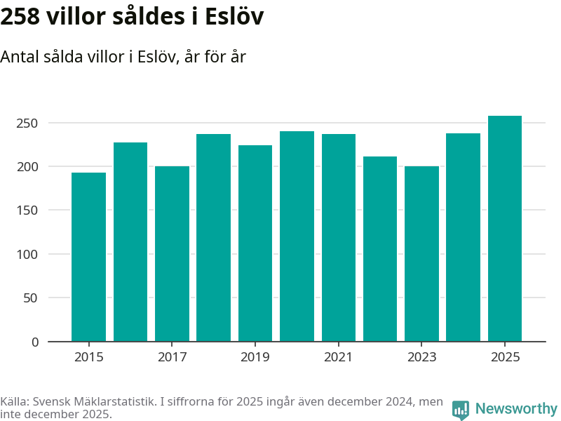 Antalet sålda villor ökade också. Totalt såldes 258 villor, att jämföra med 238 under 2024. Det är fler än något annat år sedan 2015.