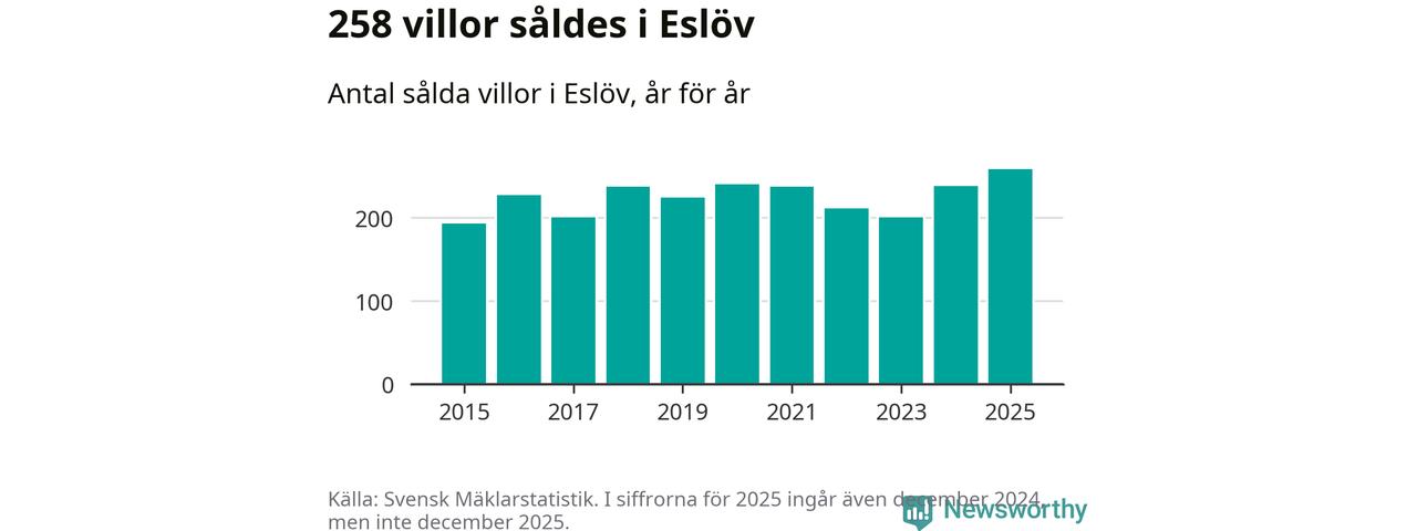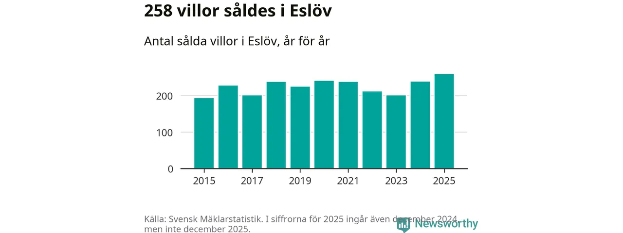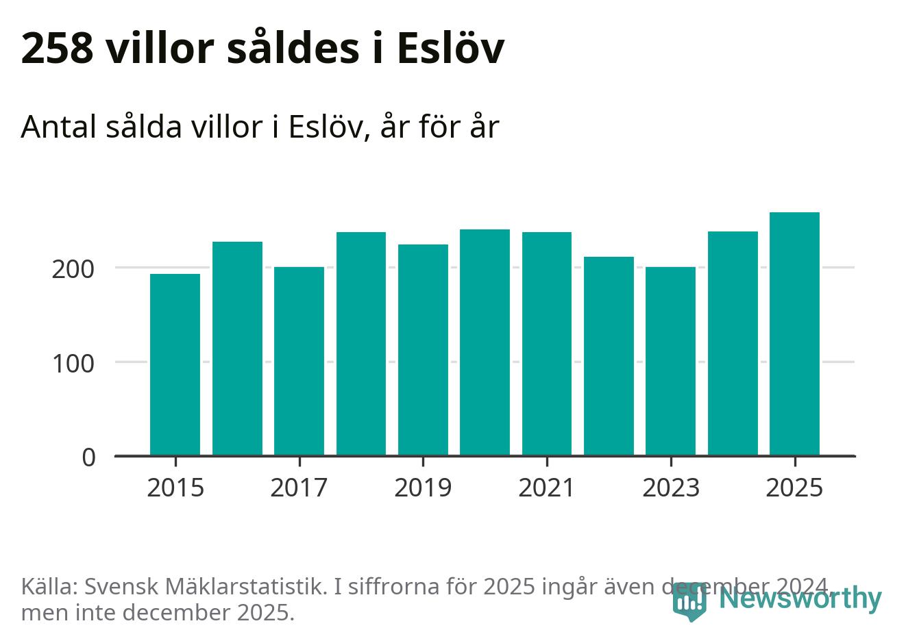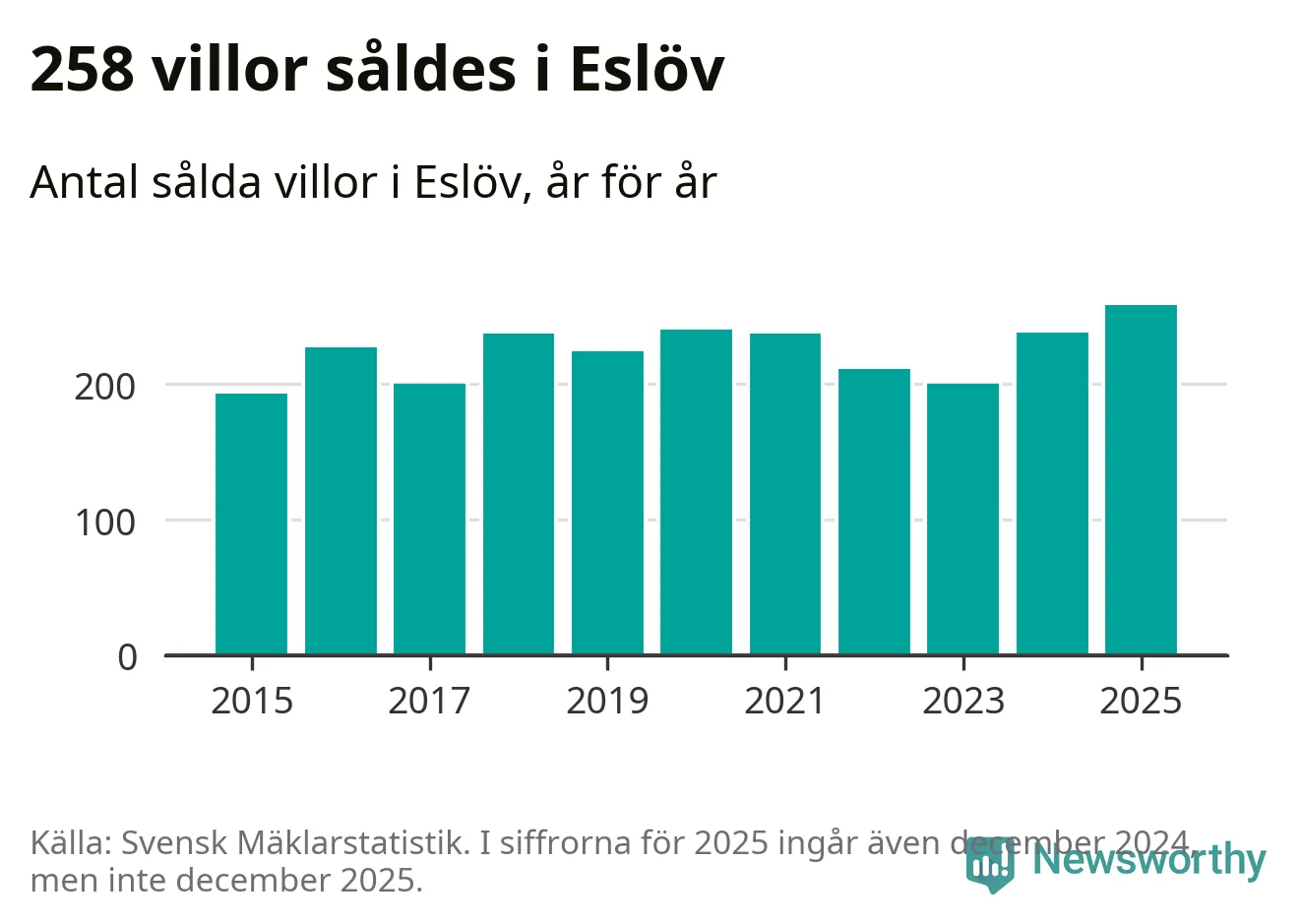 Antalet sålda villor ökade också. Totalt såldes 258 villor, att jämföra med 238 under 2024. Det är fler än något annat år sedan 2015.