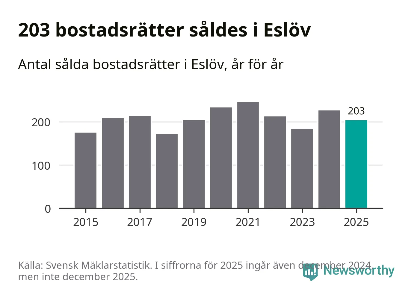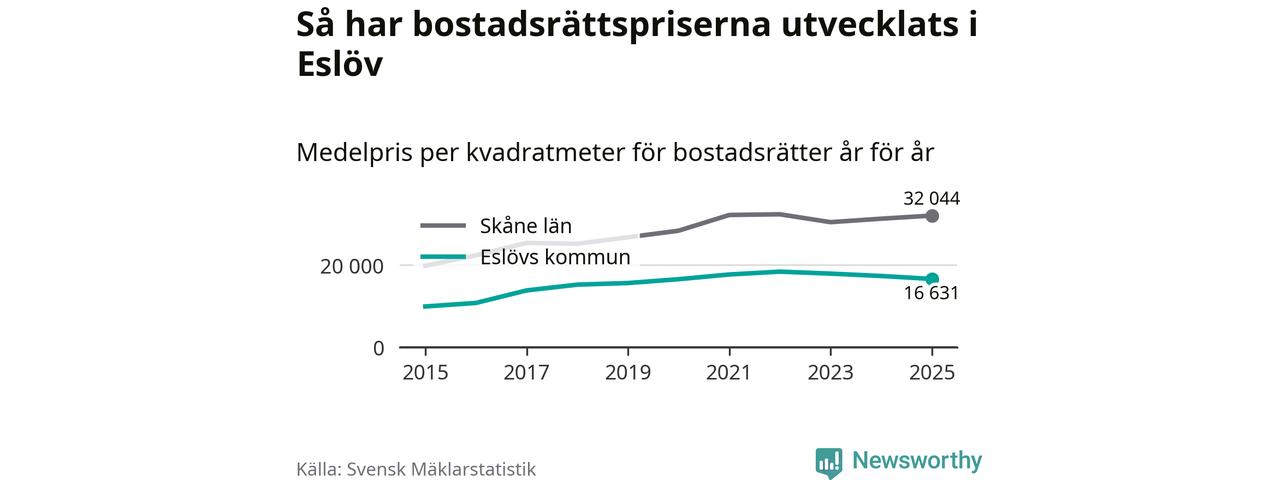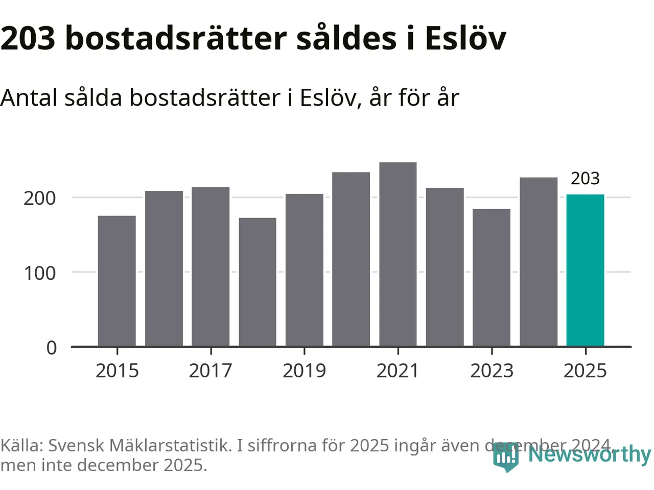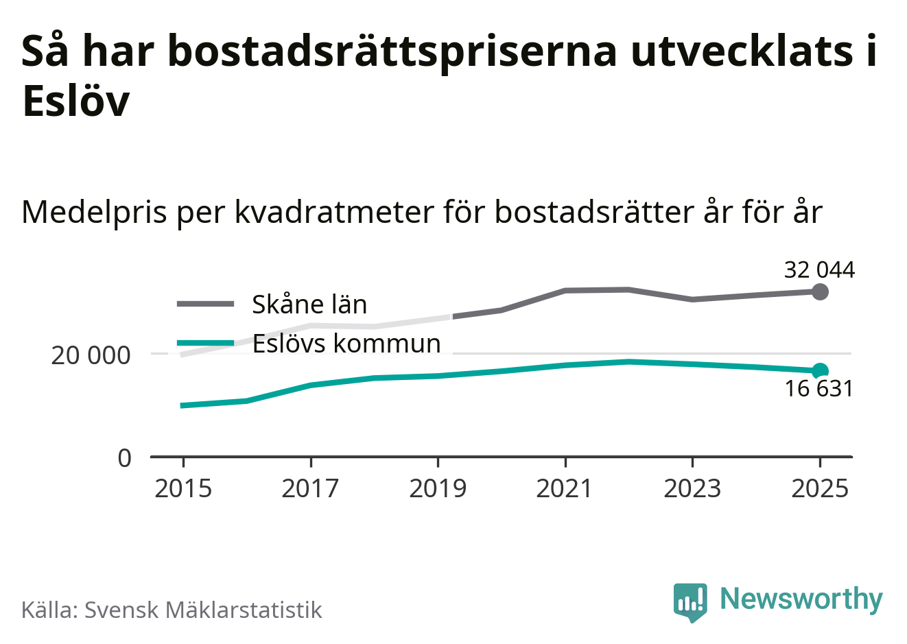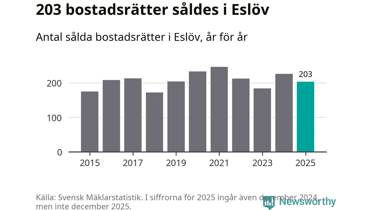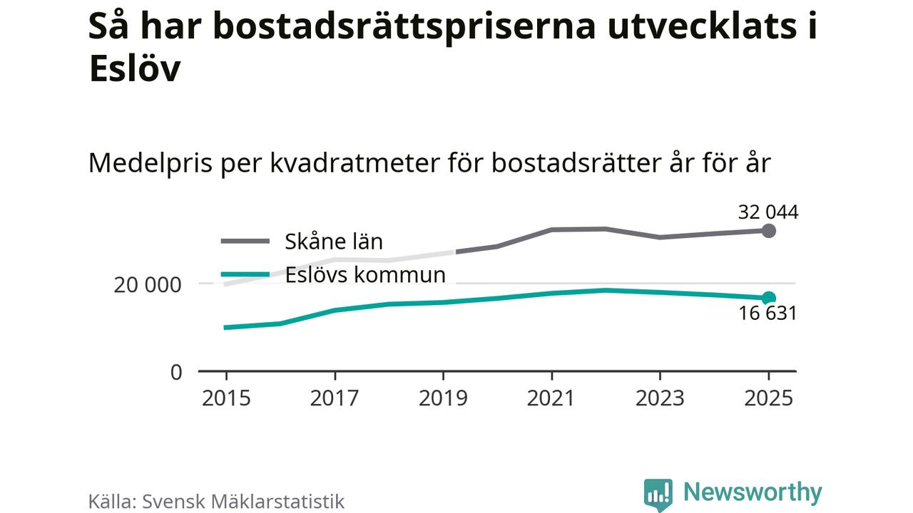 Det såldes totalt 203 bostadsrätter i Eslövs kommun under året. Genomsnittspriset per kvadratmeter landade på 16 631 kronor. Det är en minskning med fyra procent i kommunen på ett år.