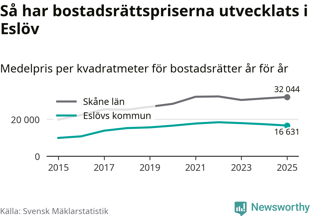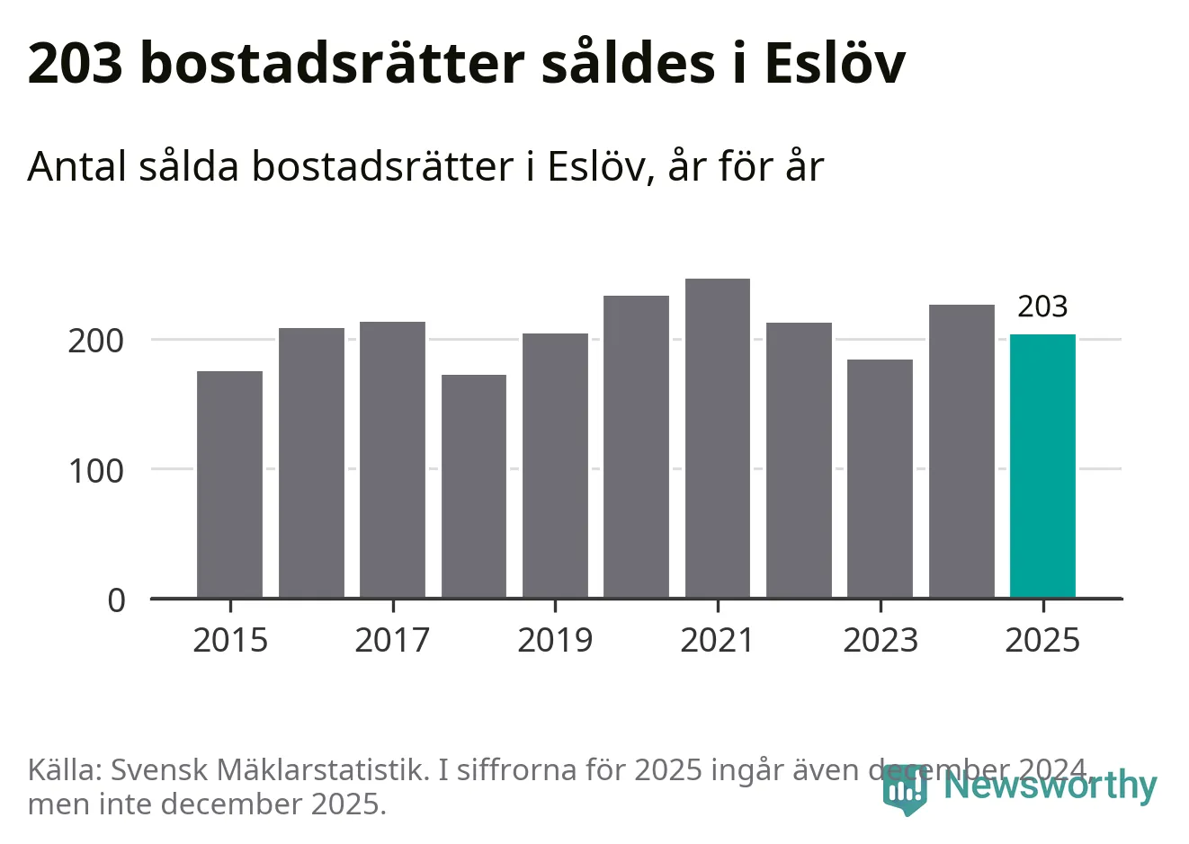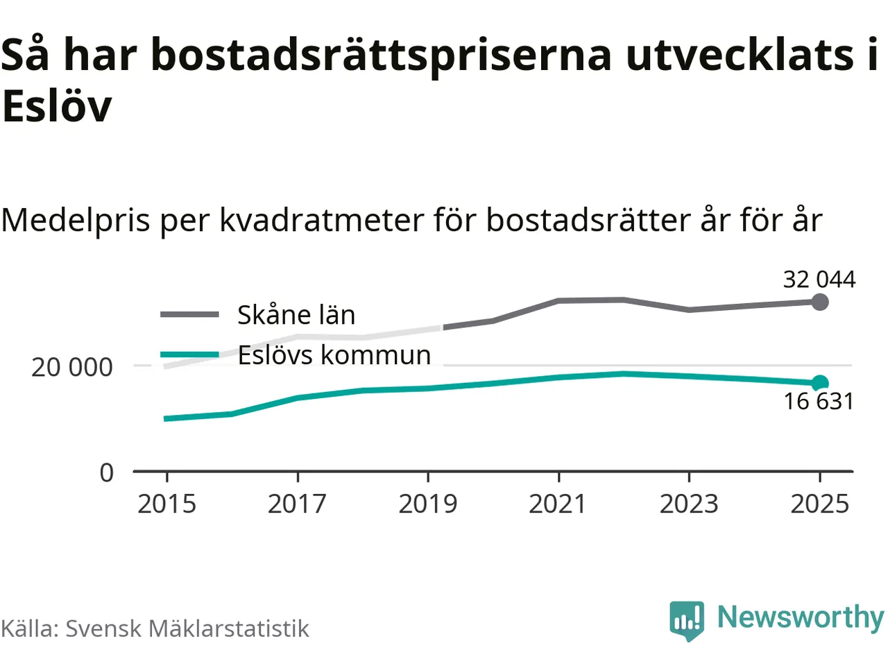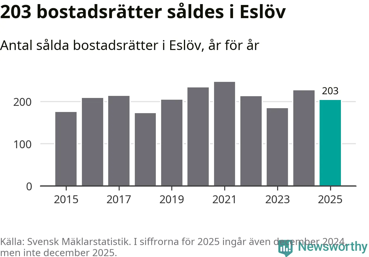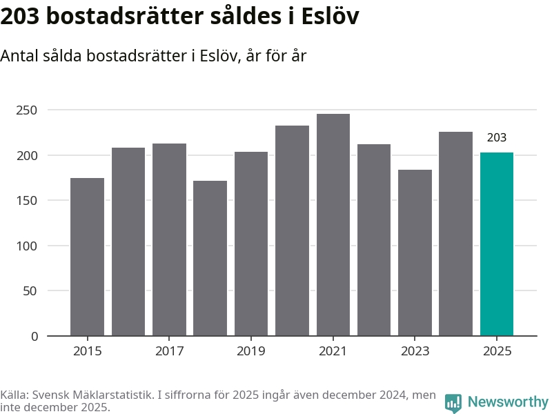 Det såldes totalt 203 bostadsrätter i Eslövs kommun under året. Genomsnittspriset per kvadratmeter landade på 16 631 kronor. Det är en minskning med fyra procent i kommunen på ett år.
