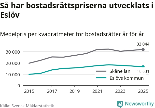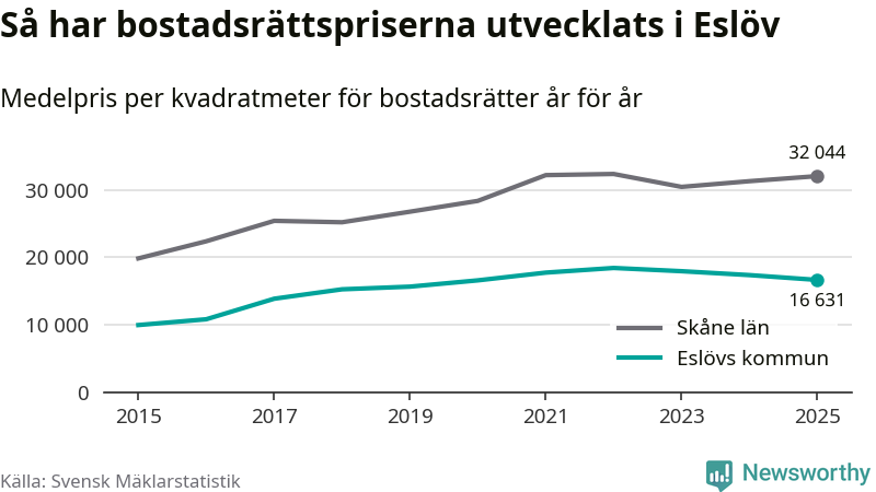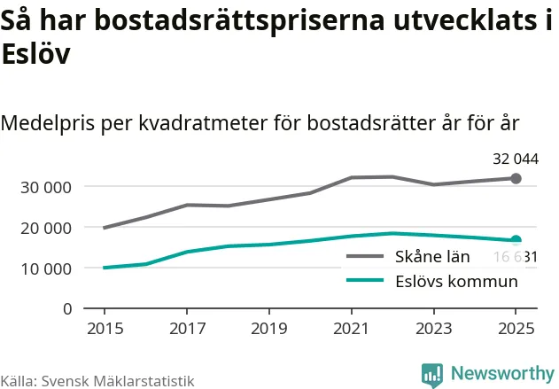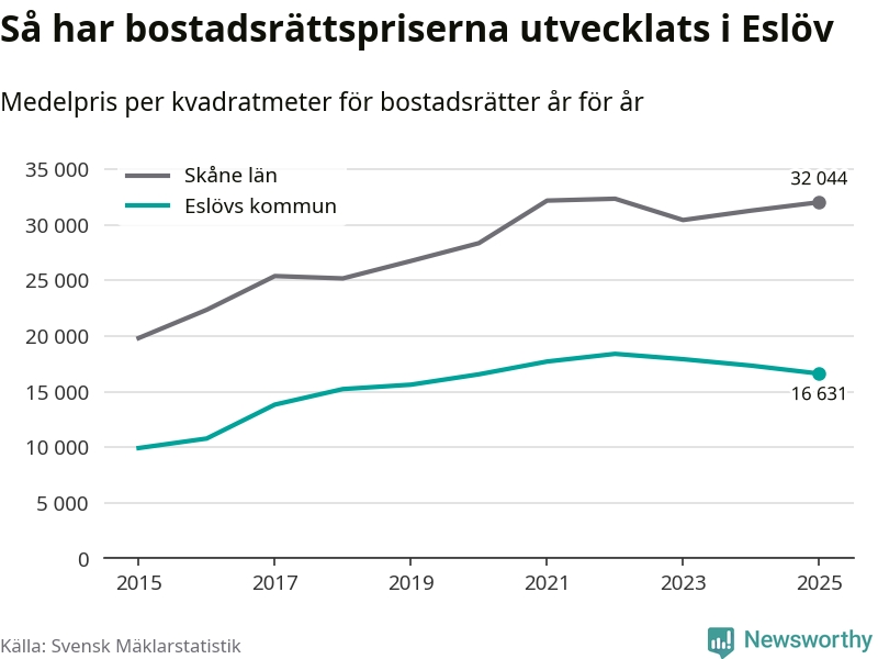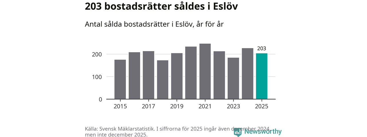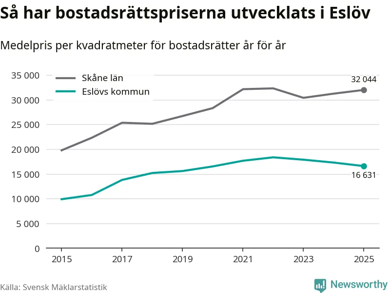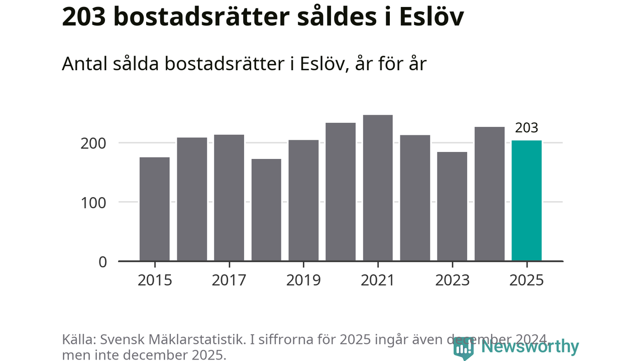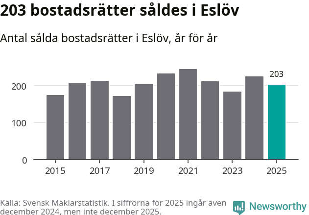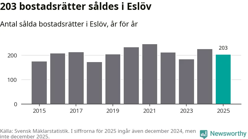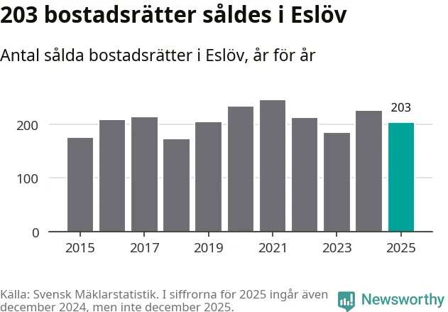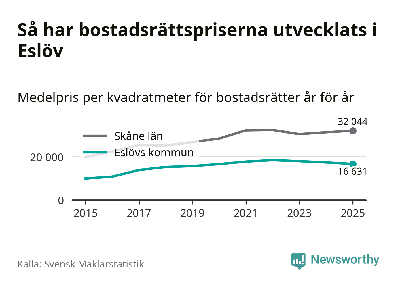 Det såldes totalt 203 bostadsrätter i Eslövs kommun under året. Genomsnittspriset per kvadratmeter landade på 16 631 kronor. Det är en minskning med fyra procent i kommunen på ett år.