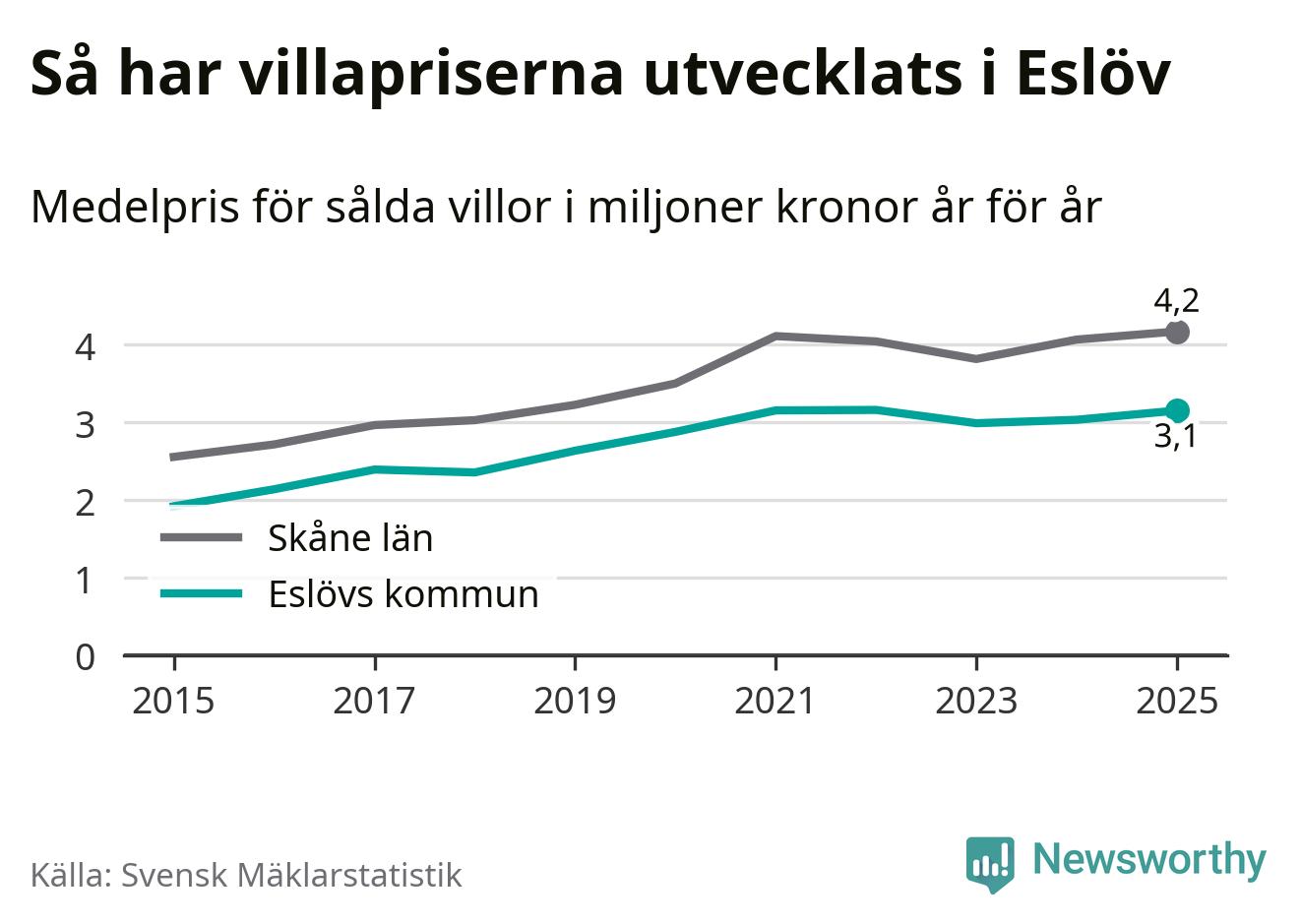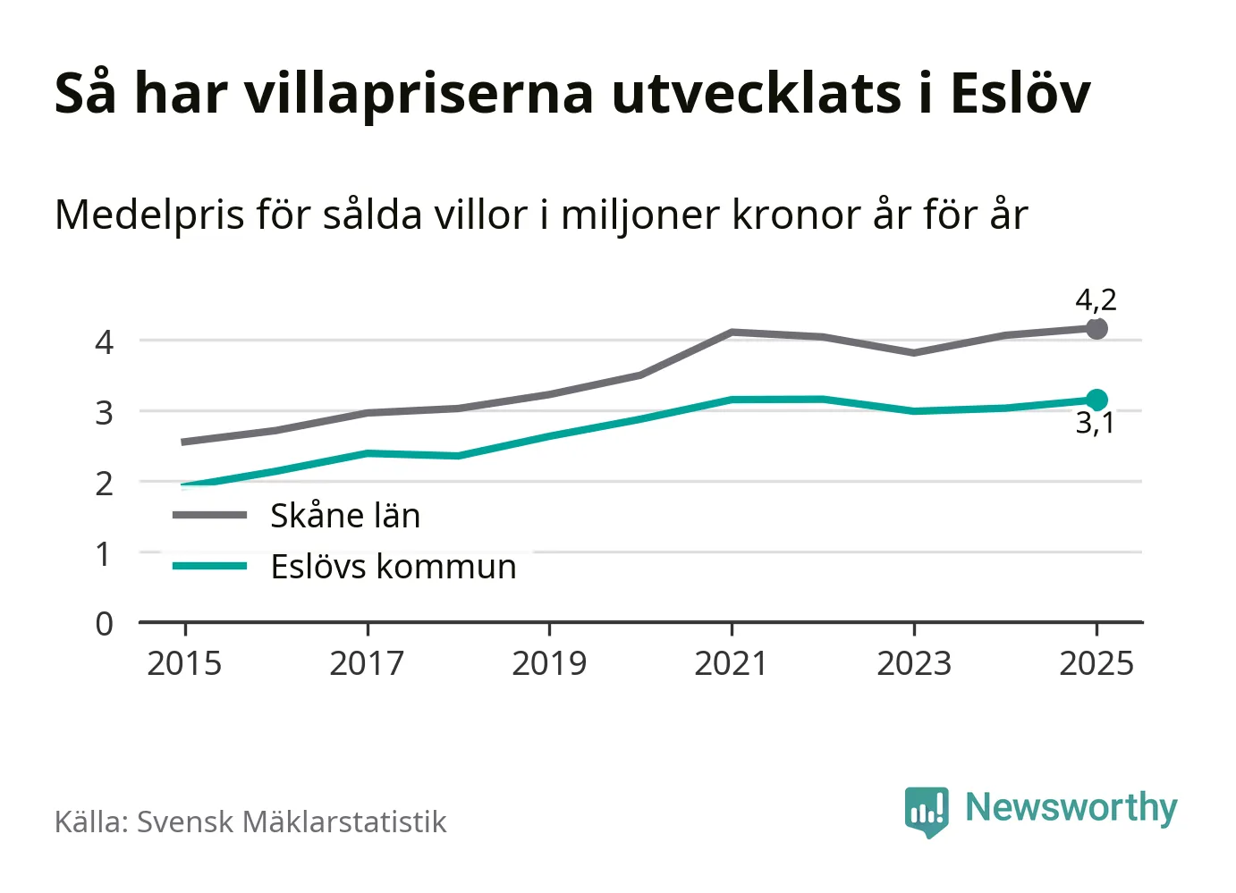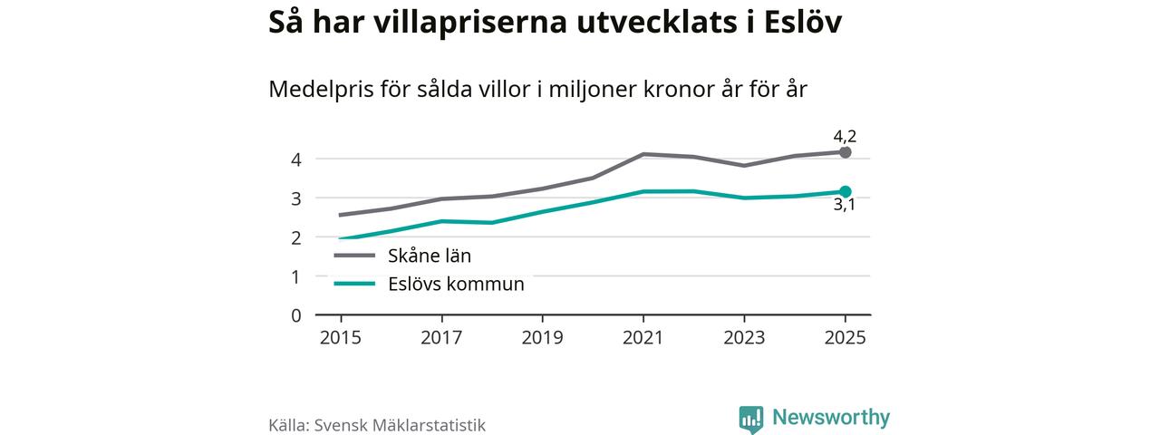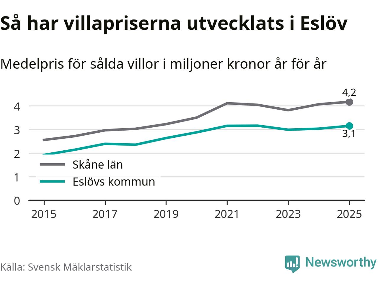 3,2 miljoner kronor är medelpriset för de villor som såldes i Eslövs kommun under året, eller 24 199 kronor per kvadratmeter. Det innebär en prisökning med fyra procent på ett år och är andra året i rad som priserna ökar i kommunen.