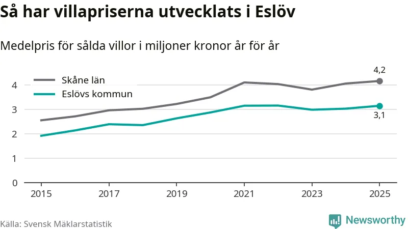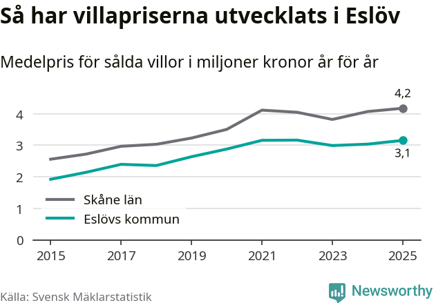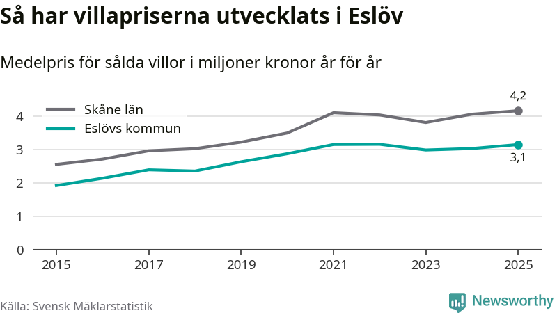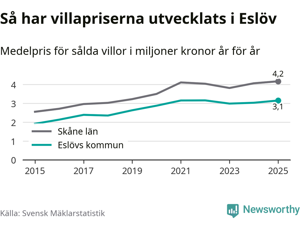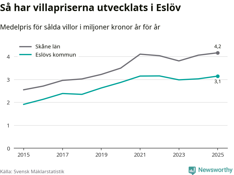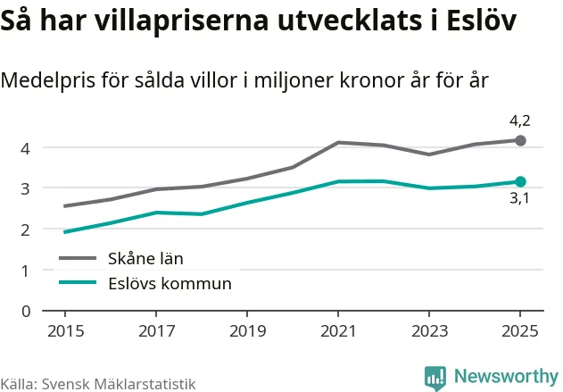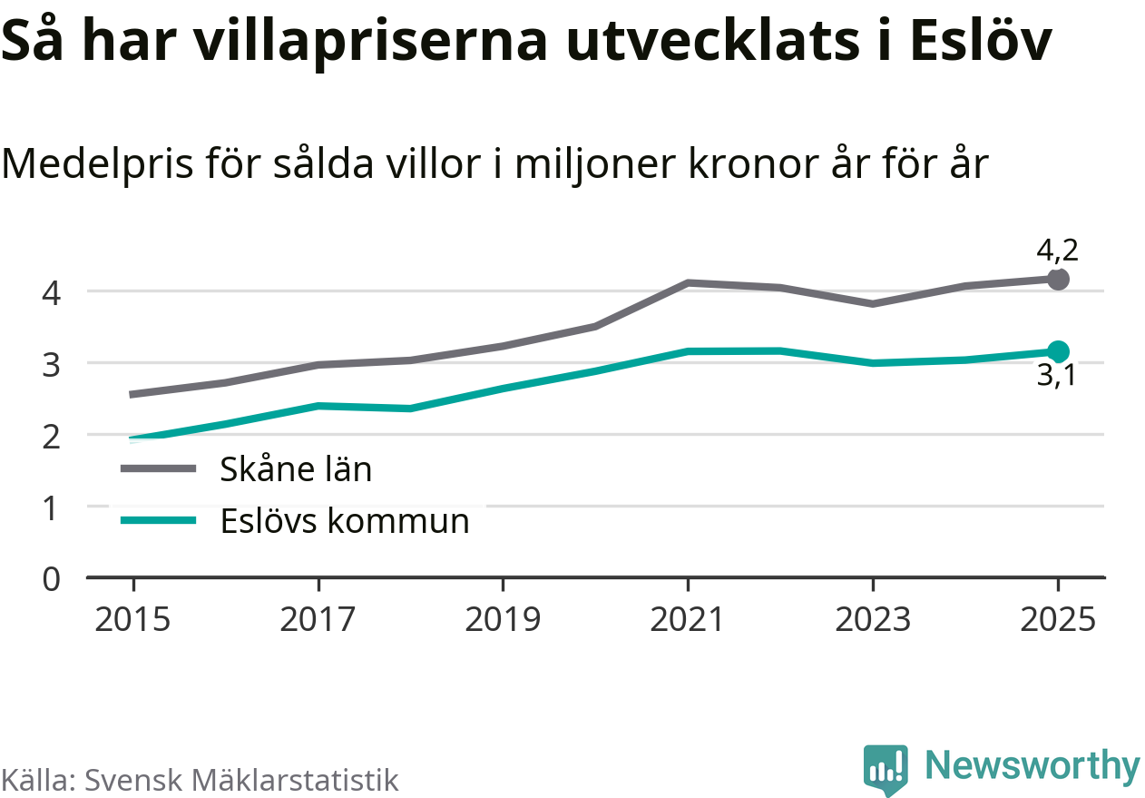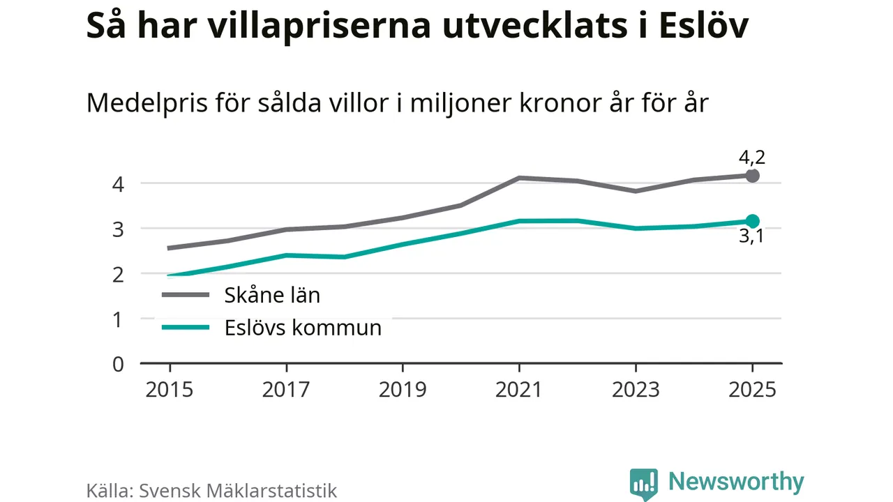 3,2 miljoner kronor är medelpriset för de villor som såldes i Eslövs kommun under året, eller 24 199 kronor per kvadratmeter. Det innebär en prisökning med fyra procent på ett år och är andra året i rad som priserna ökar i kommunen.