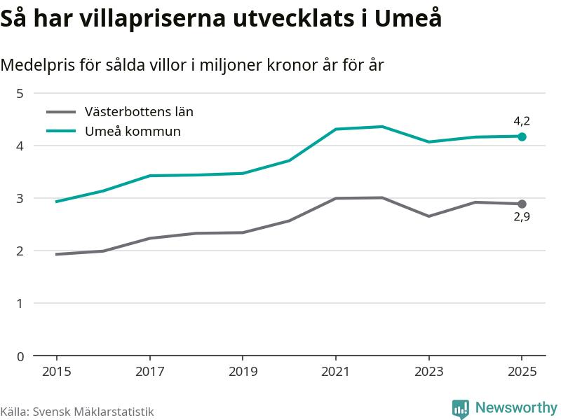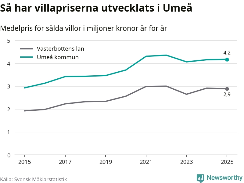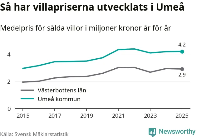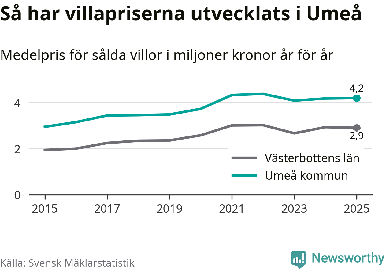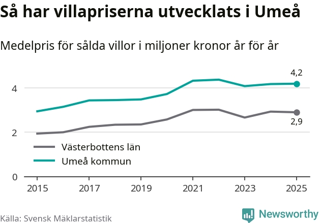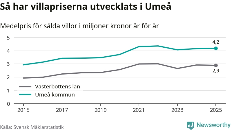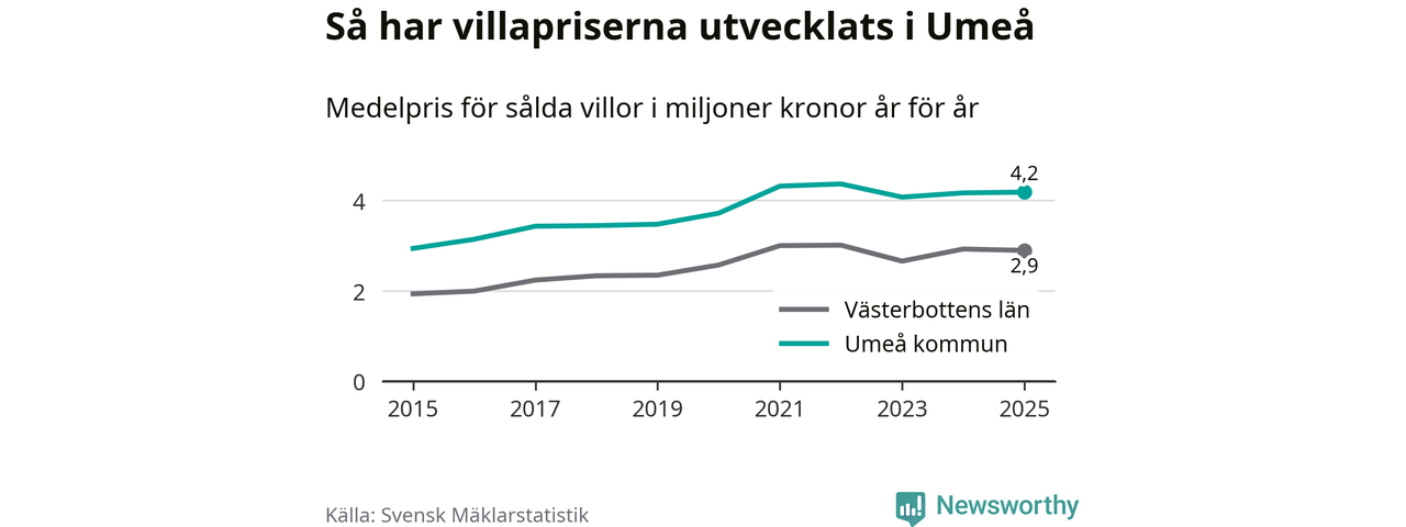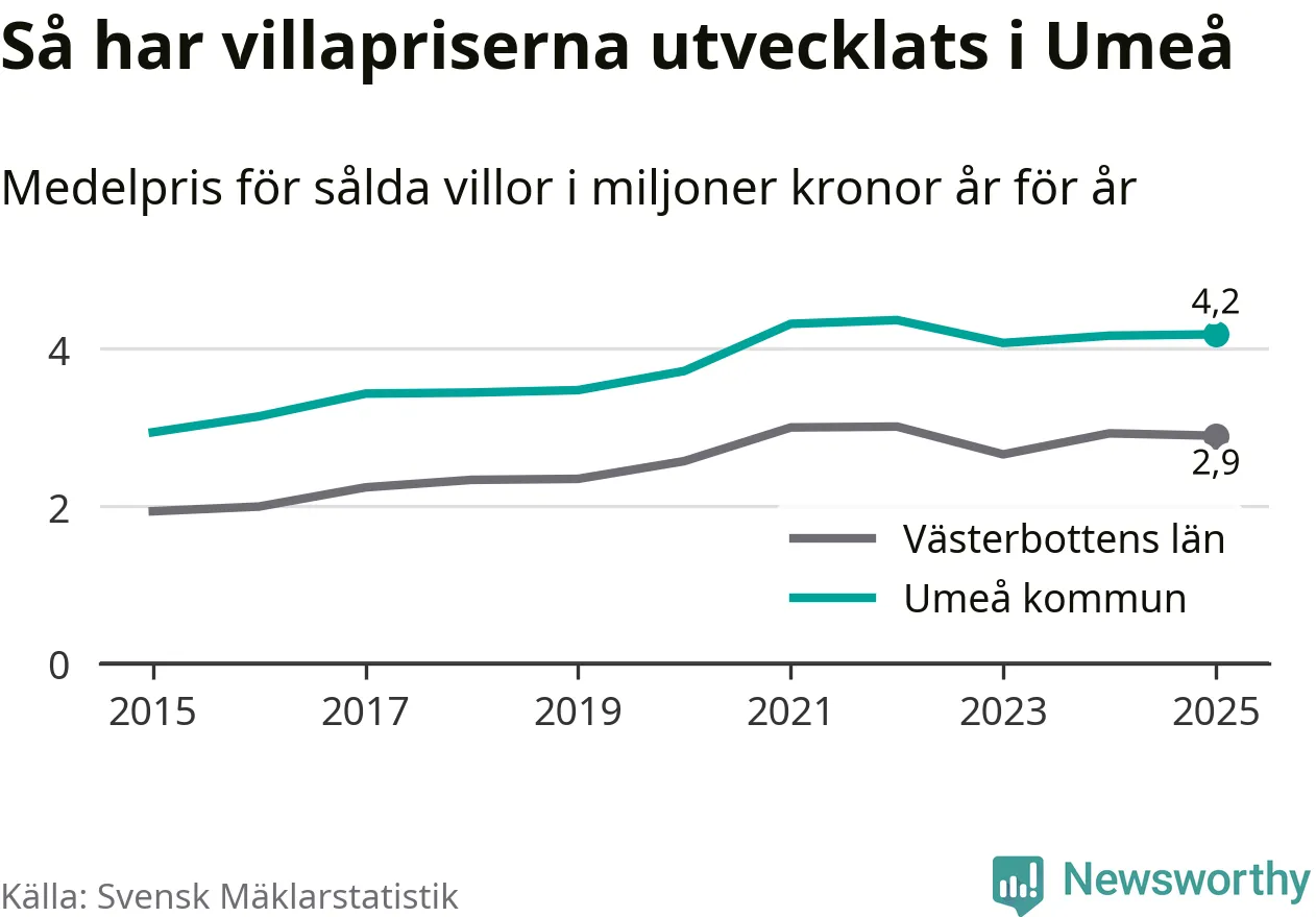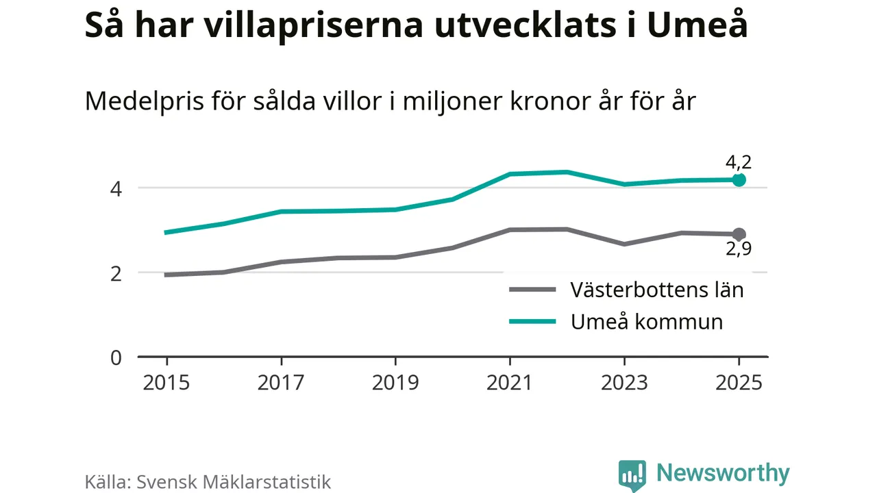 4,2 miljoner kronor är medelpriset för de villor som såldes i Umeå kommun under året, eller 32 131 kronor per kvadratmeter. Det innebär att priserna har legat i stort sett stilla sedan förra året.