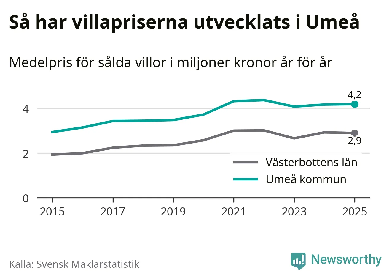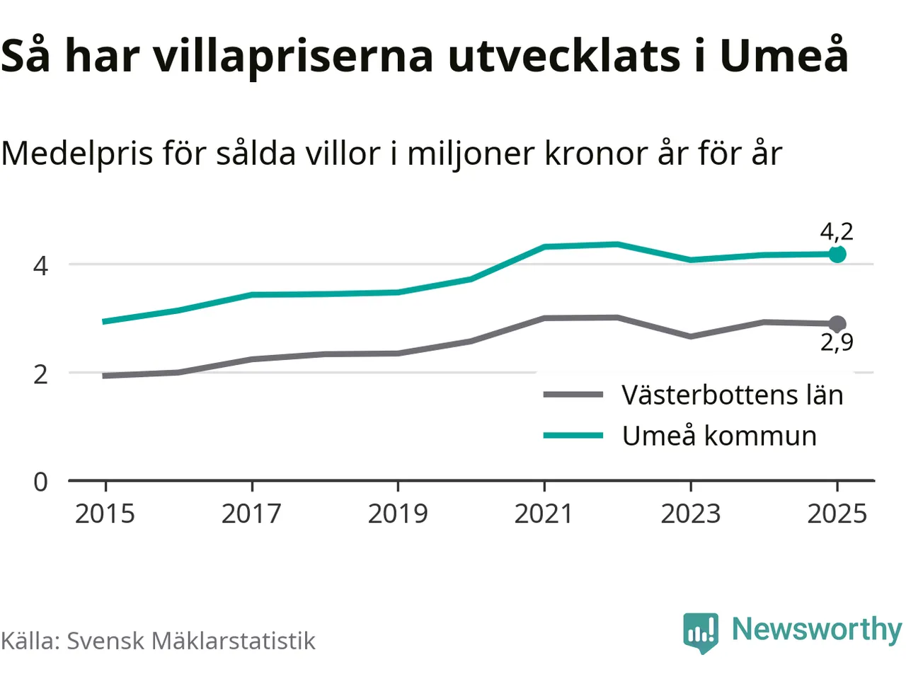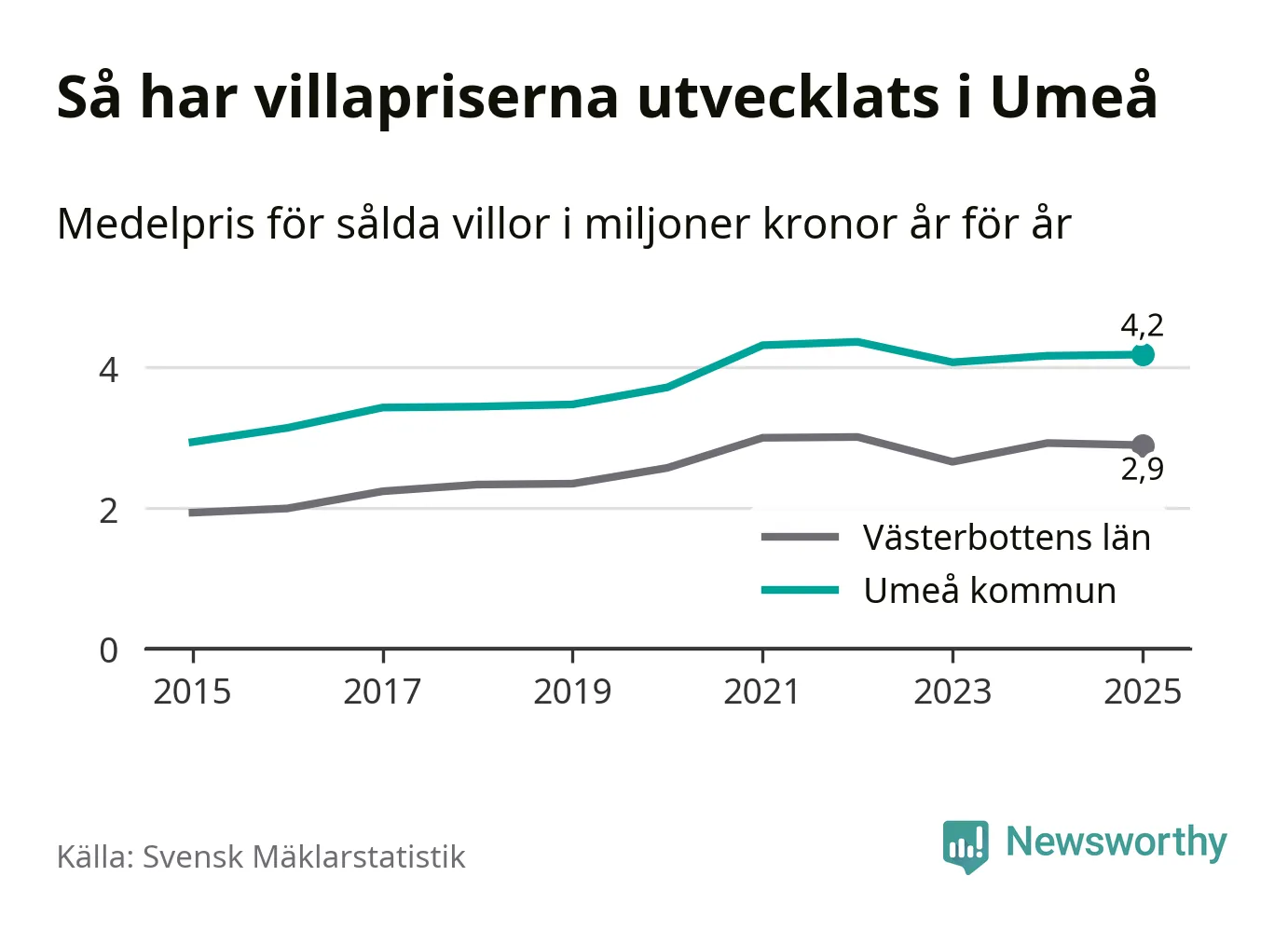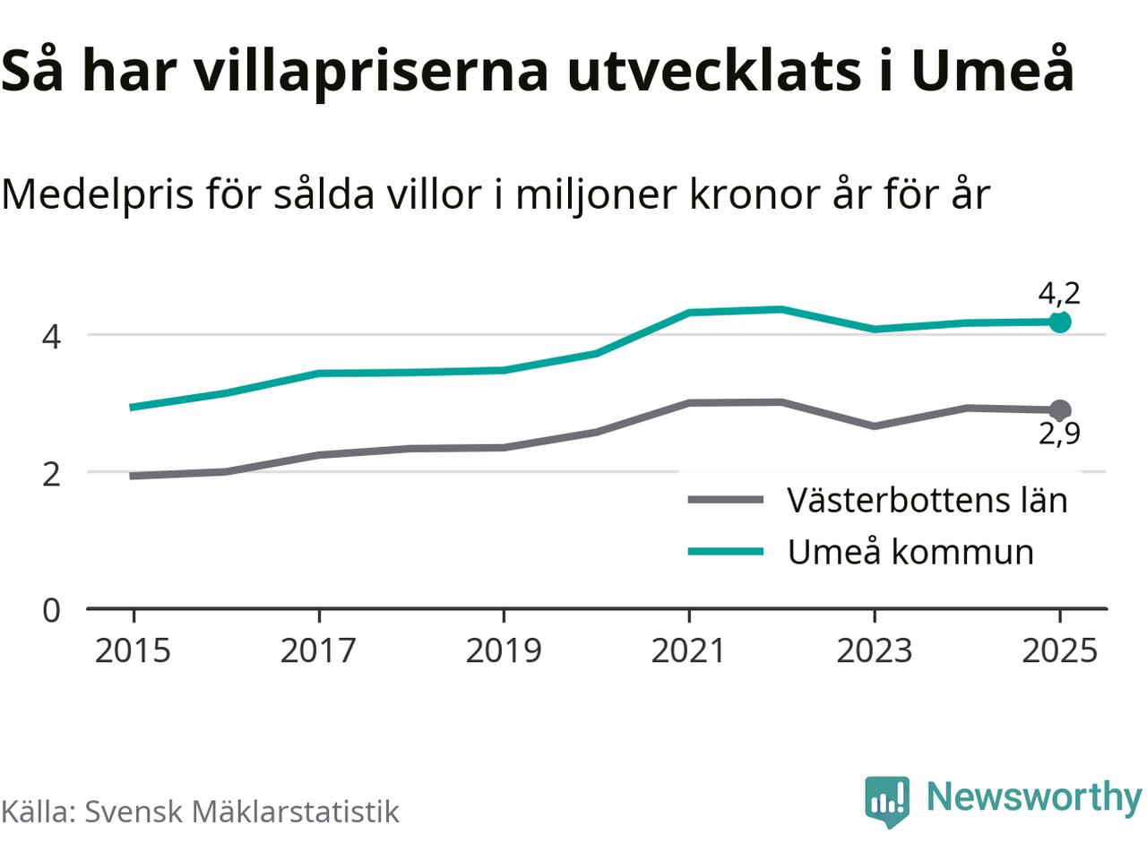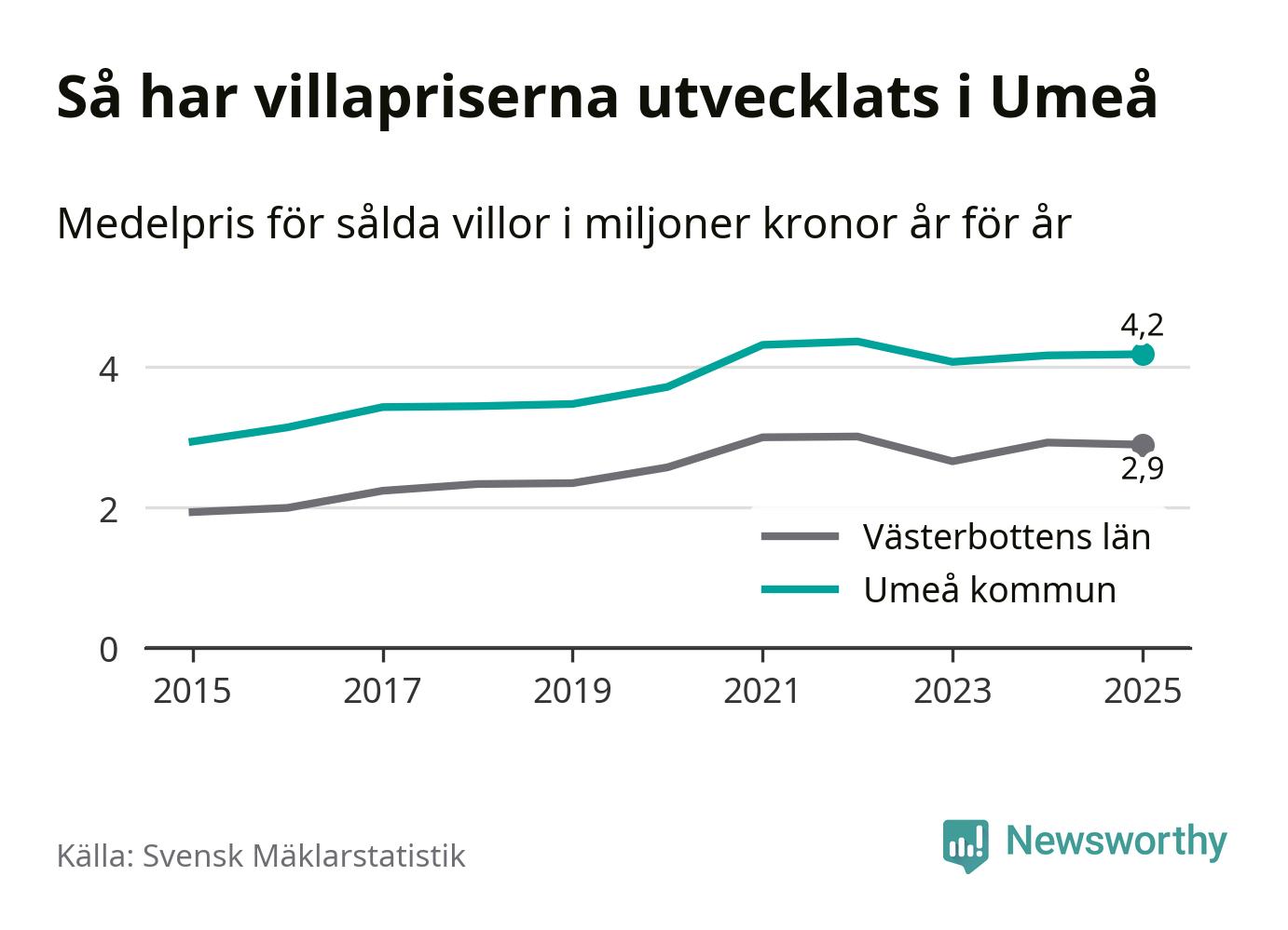 4,2 miljoner kronor är medelpriset för de villor som såldes i Umeå kommun under året, eller 32 131 kronor per kvadratmeter. Det innebär att priserna har legat i stort sett stilla sedan förra året.
