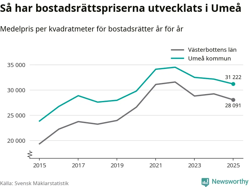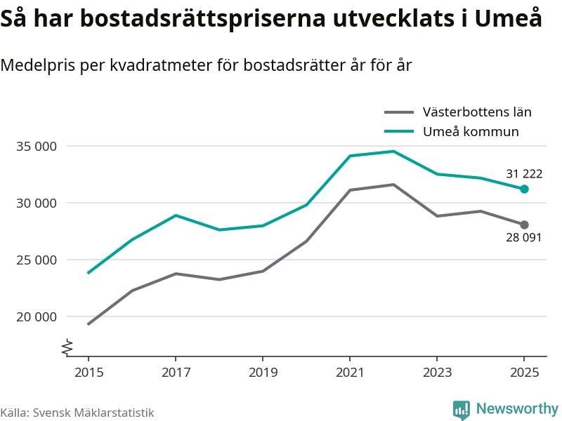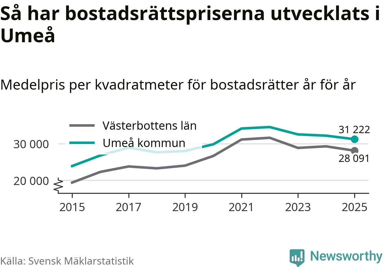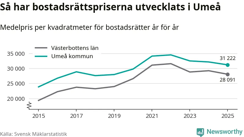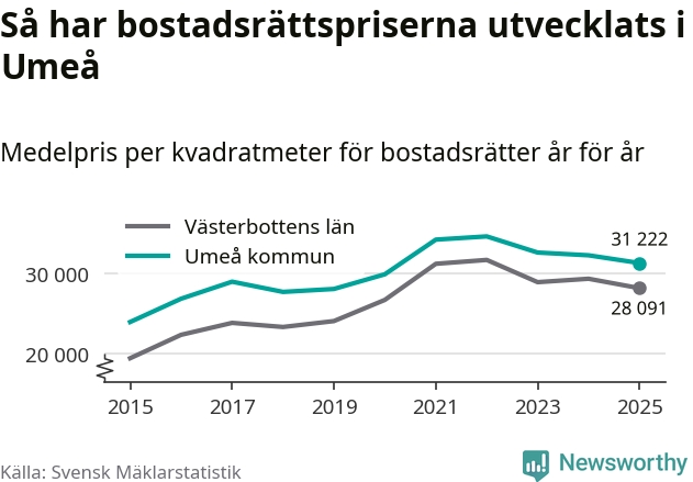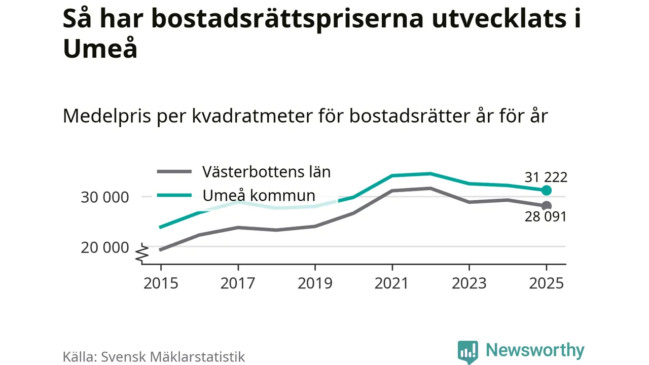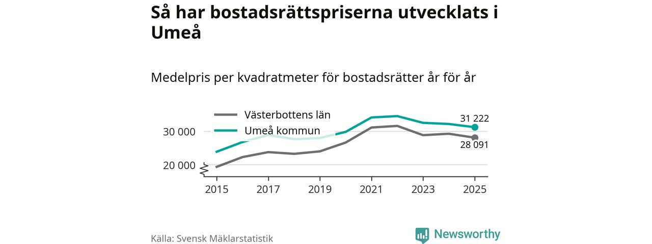 Det såldes totalt 1 431 bostadsrätter i Umeå kommun under året. Genomsnittspriset per kvadratmeter landade på 31 222 kronor. Det är en minskning med tre procent i kommunen på ett år.