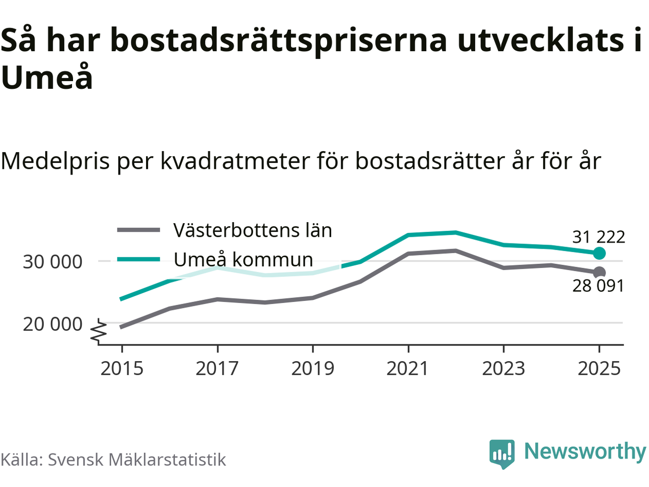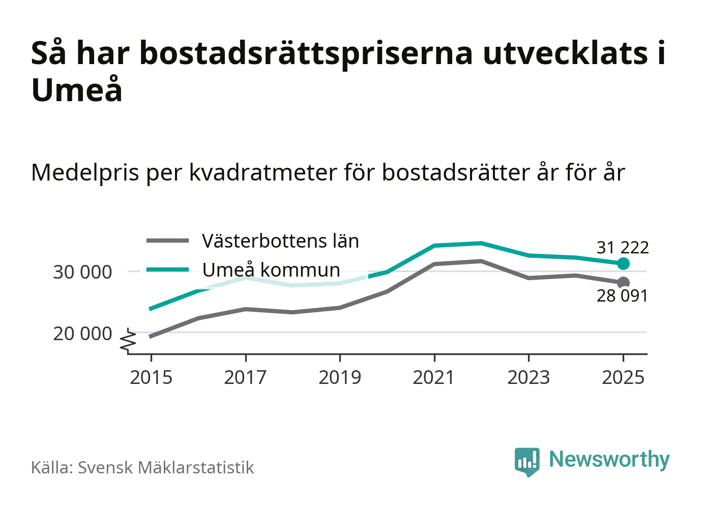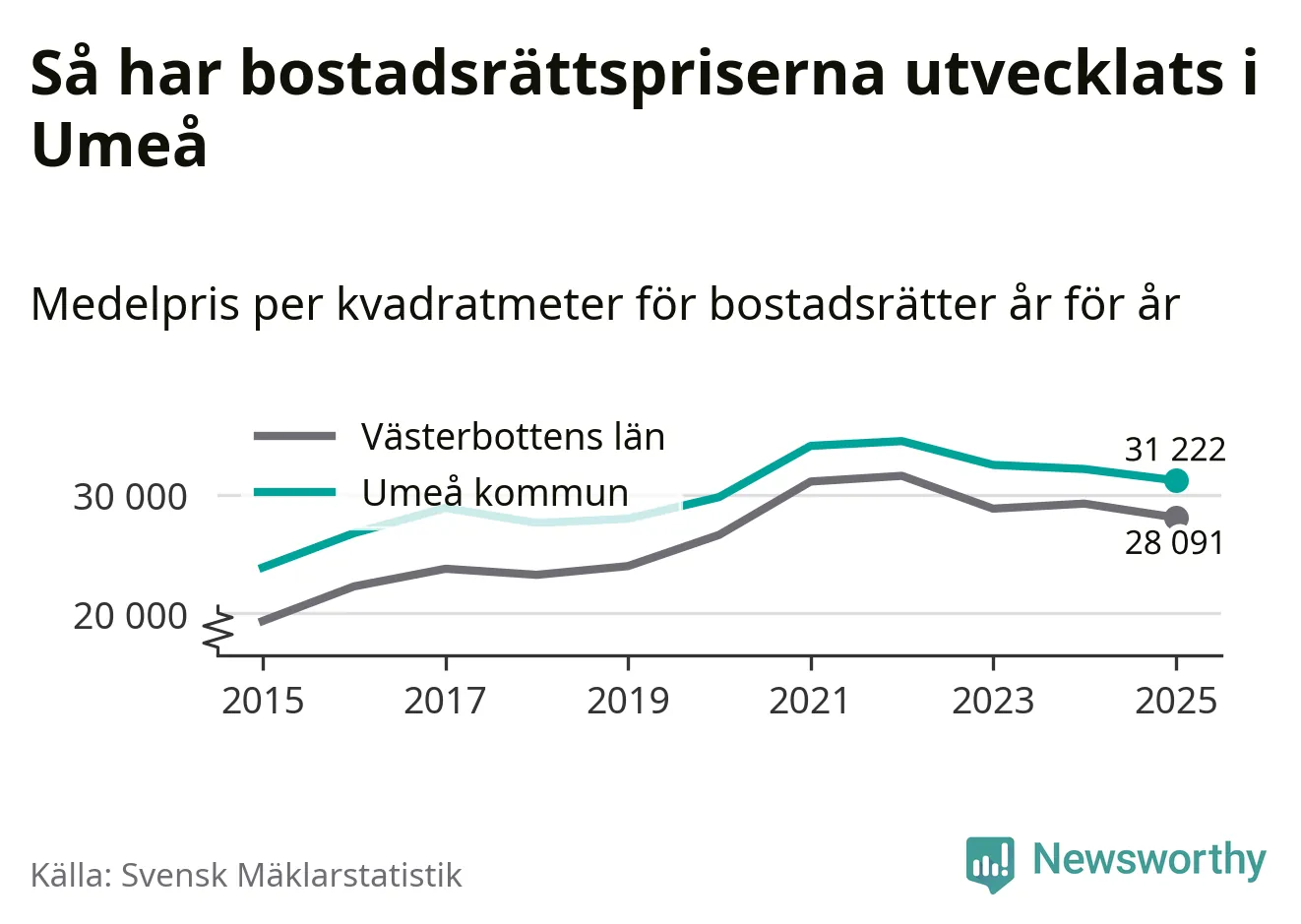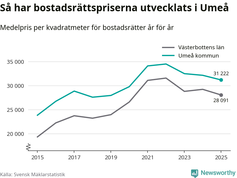 Det såldes totalt 1 431 bostadsrätter i Umeå kommun under året. Genomsnittspriset per kvadratmeter landade på 31 222 kronor. Det är en minskning med tre procent i kommunen på ett år.
