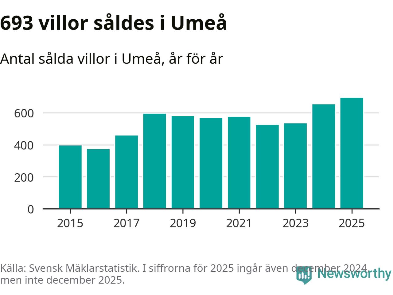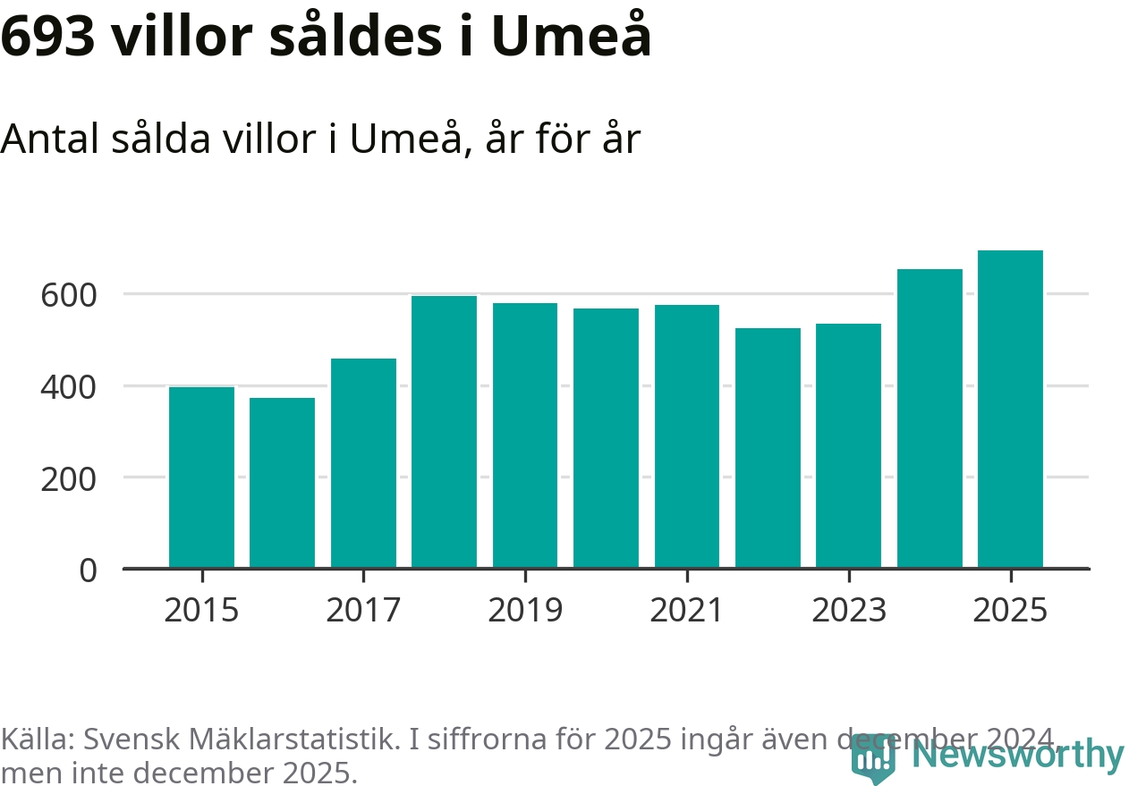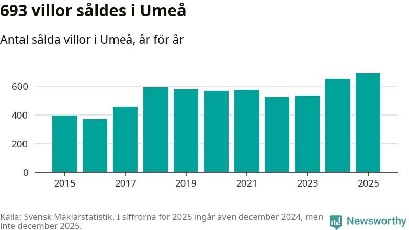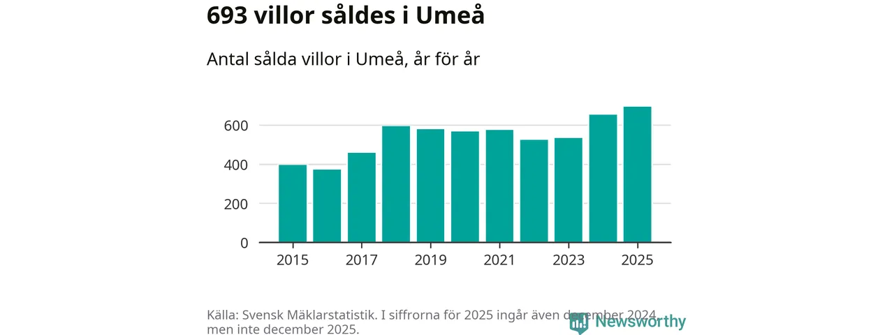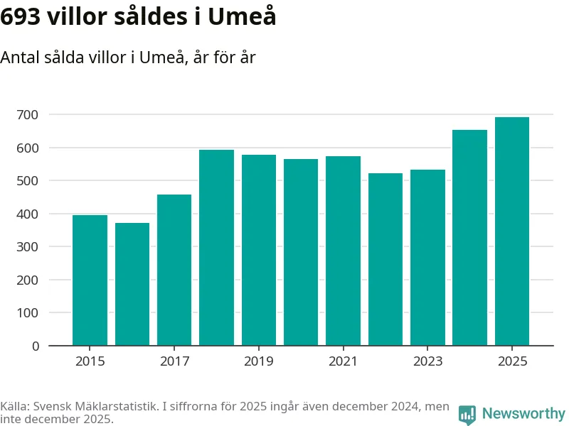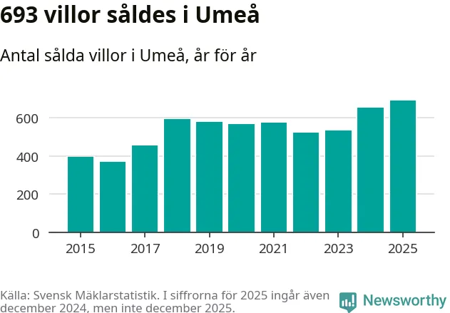 Däremot ökade antalet sålda villor. Totalt såldes 693 villor, att jämföra med 653 under 2024. Det är fler än något annat år sedan 2015.