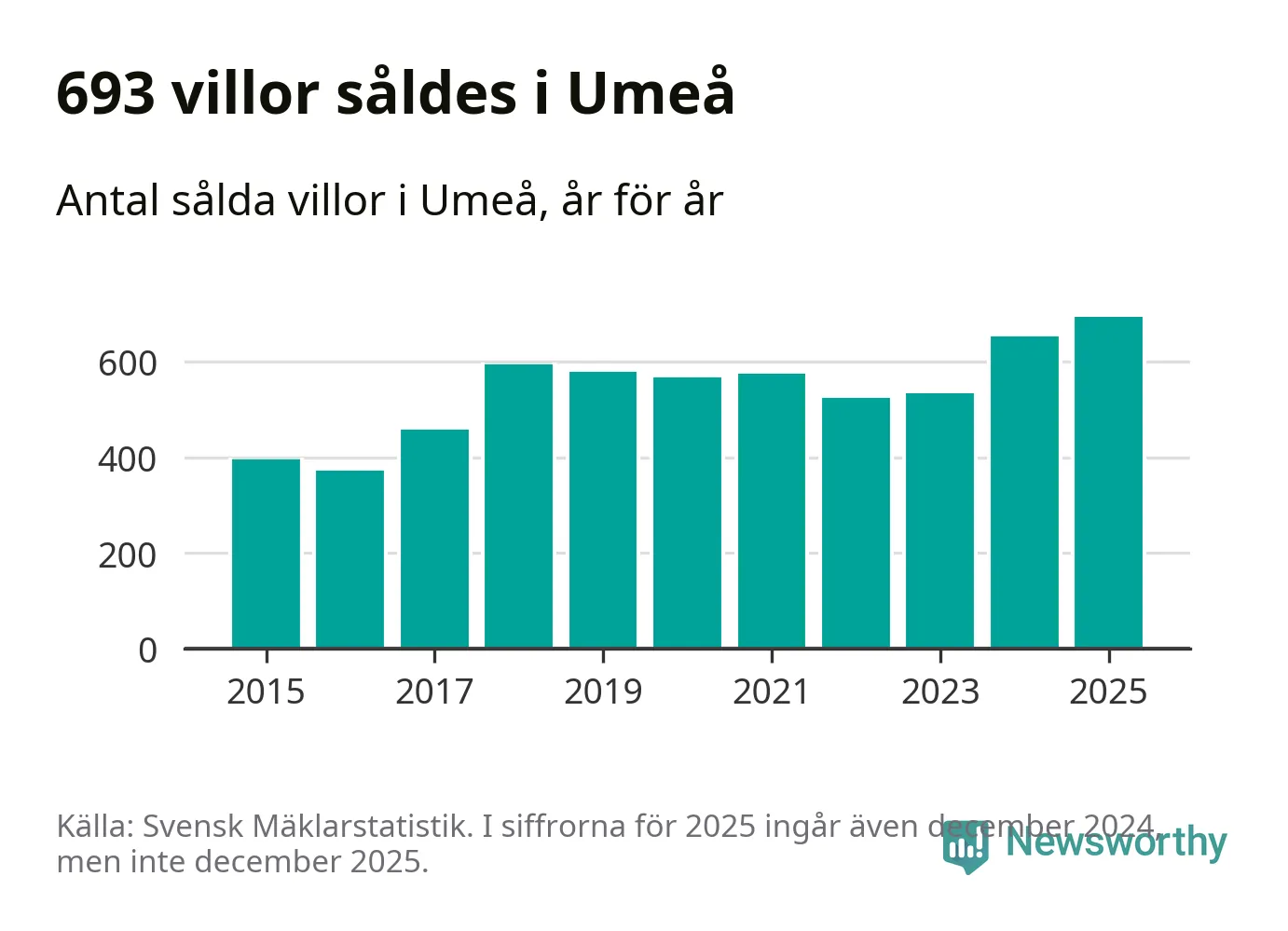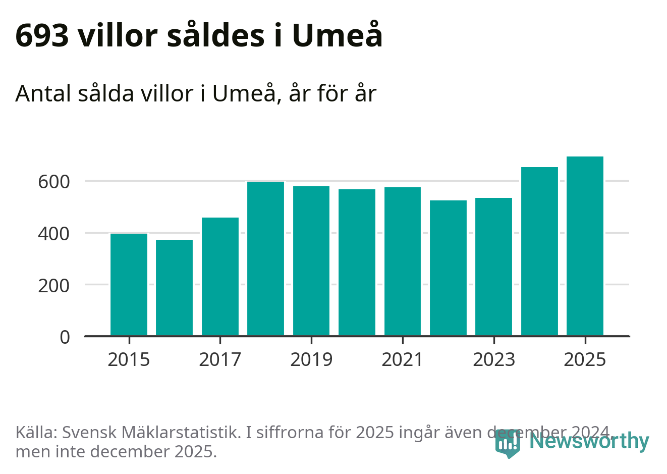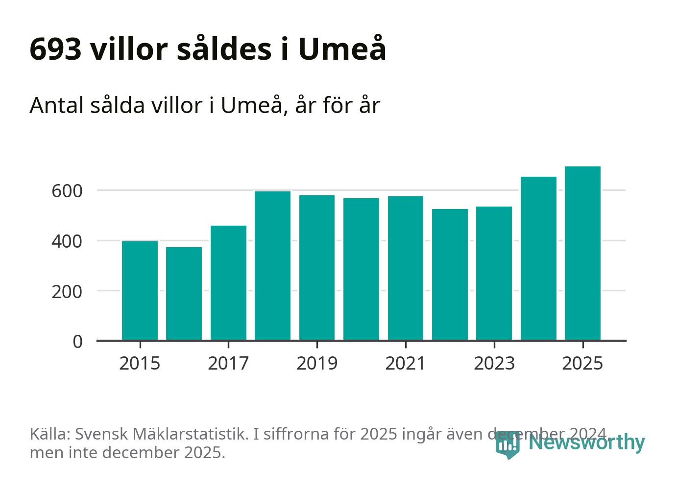 Däremot ökade antalet sålda villor. Totalt såldes 693 villor, att jämföra med 653 under 2024. Det är fler än något annat år sedan 2015.