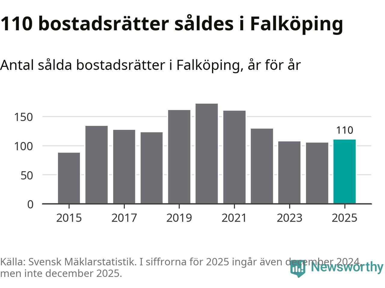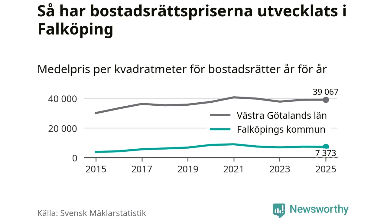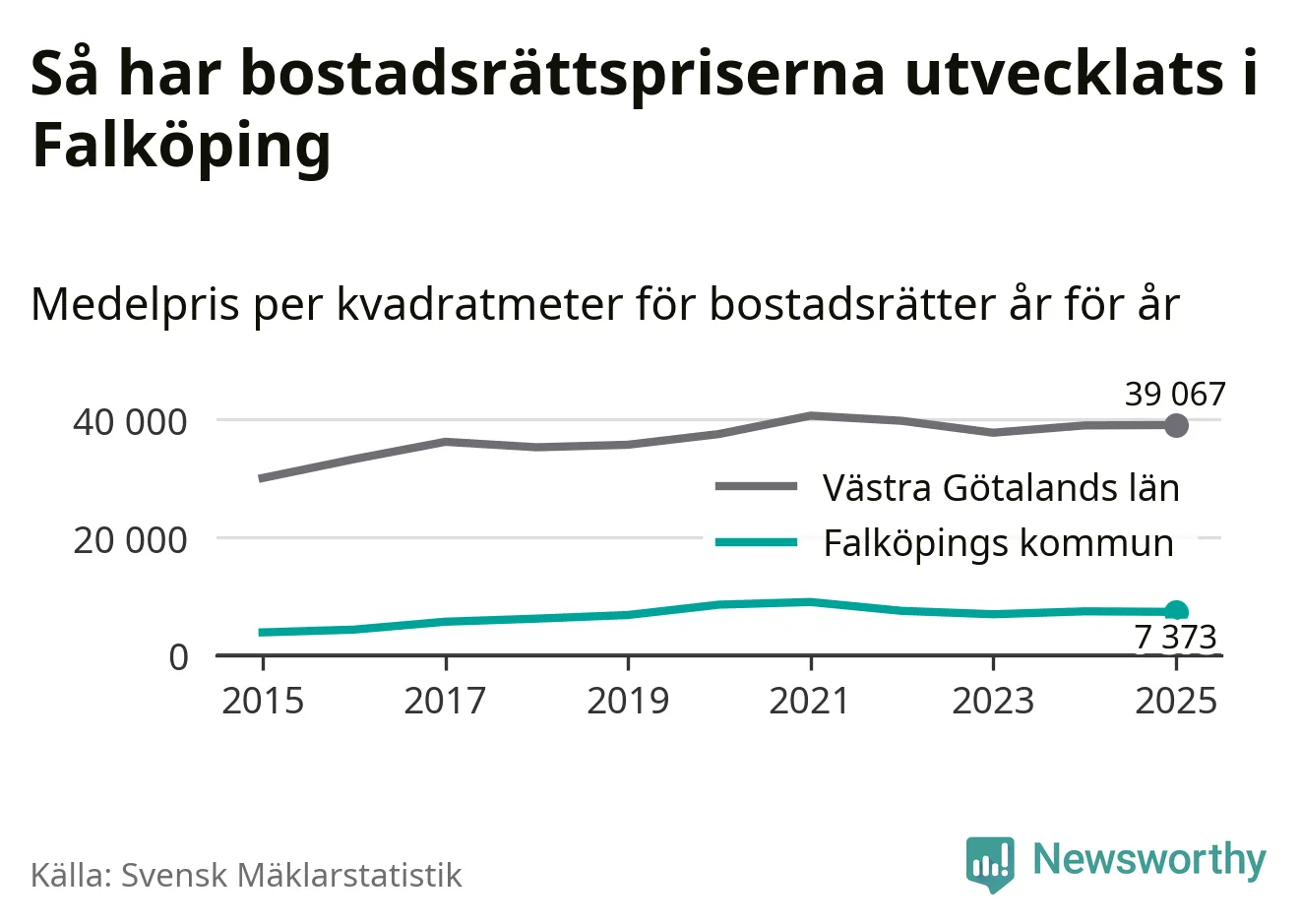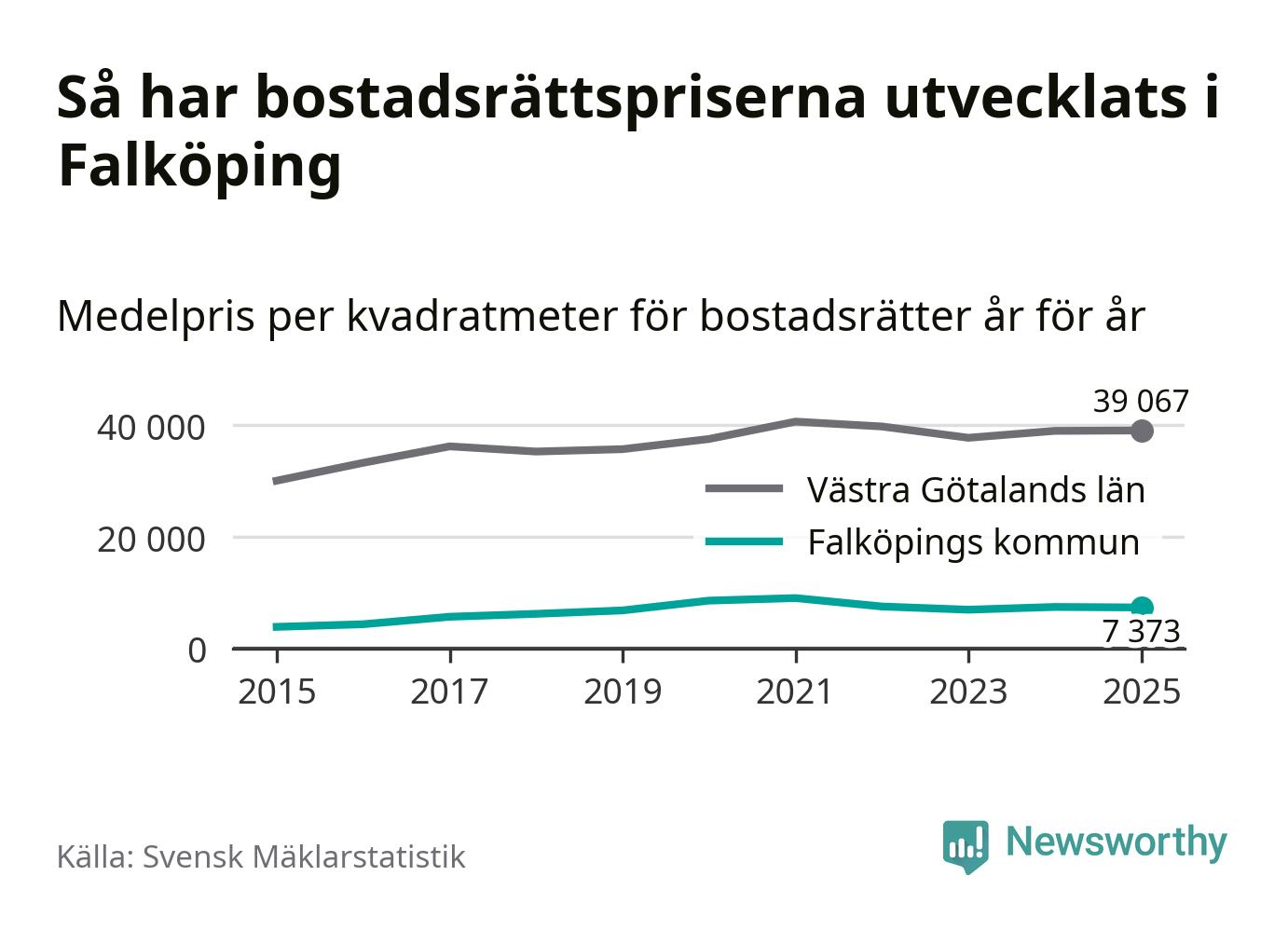 Det såldes totalt 110 bostadsrätter i Falköpings kommun under året. Genomsnittspriset per kvadratmeter landade på 7 373 kronor. Det är en minskning med en procent i kommunen på ett år.