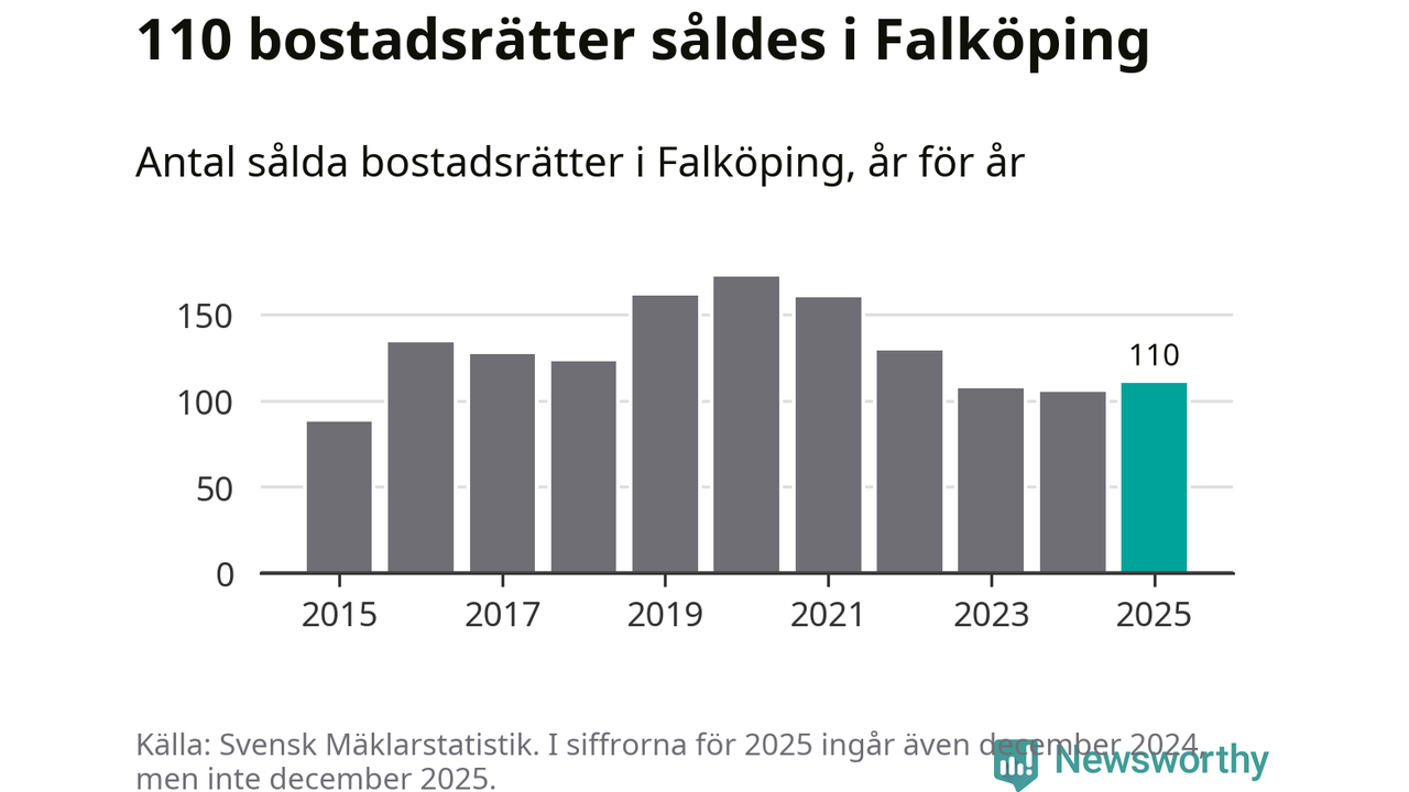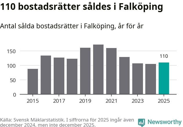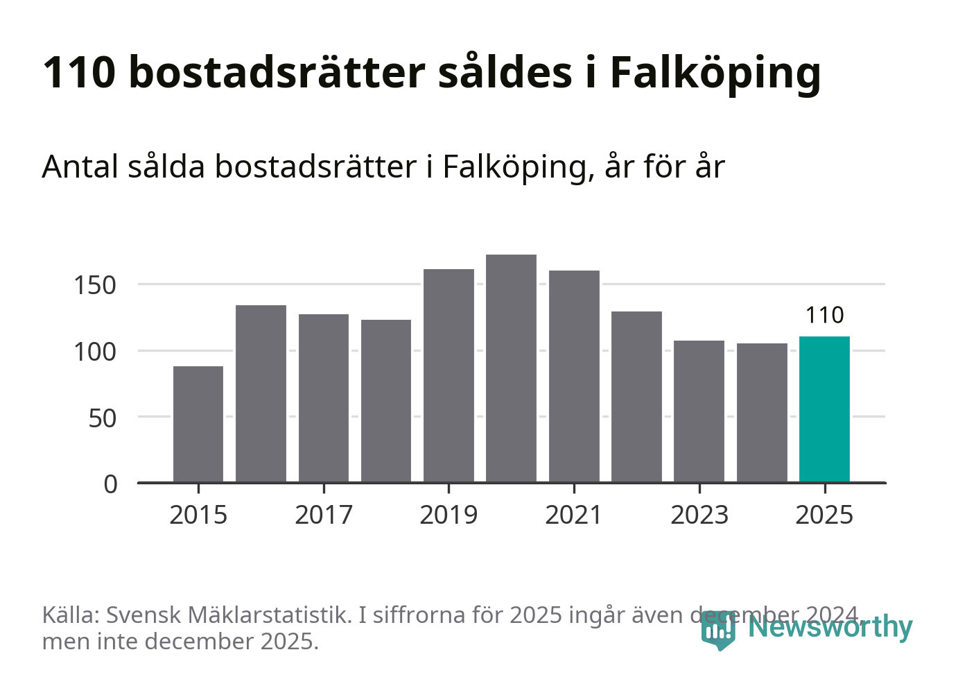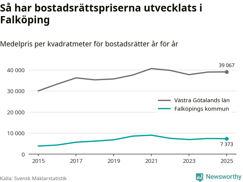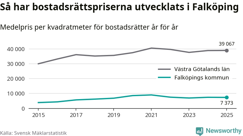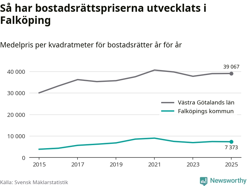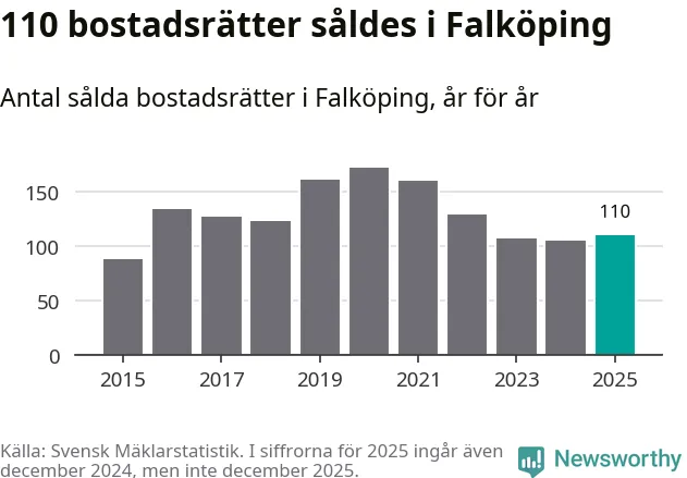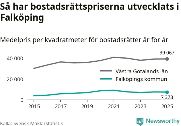 Det såldes totalt 110 bostadsrätter i Falköpings kommun under året. Genomsnittspriset per kvadratmeter landade på 7 373 kronor. Det är en minskning med en procent i kommunen på ett år.