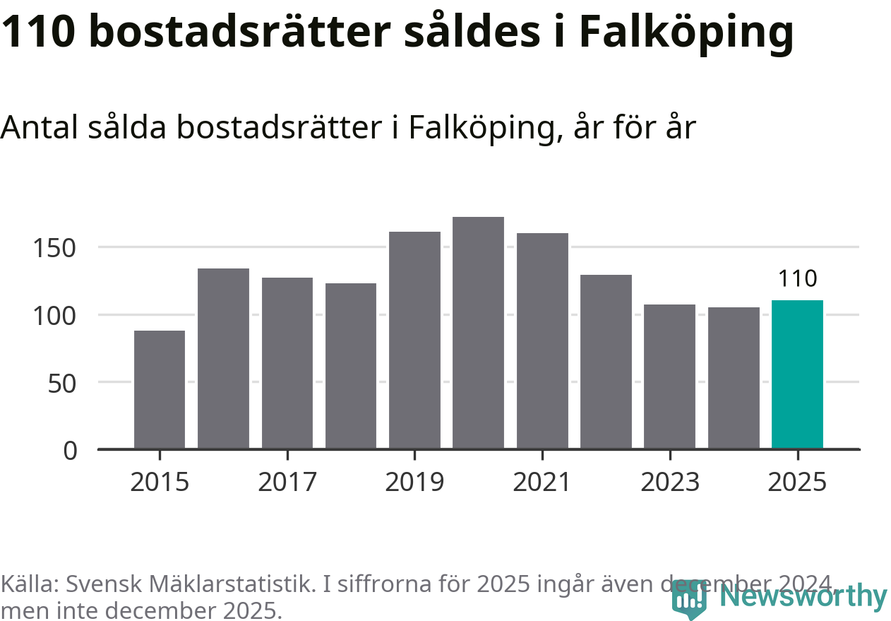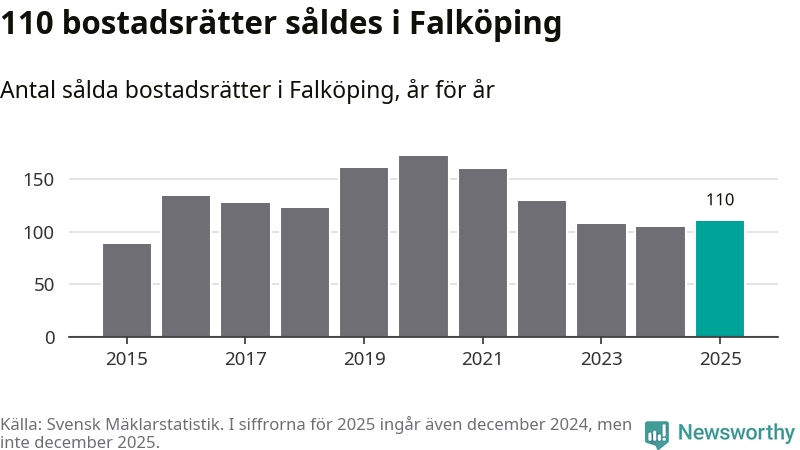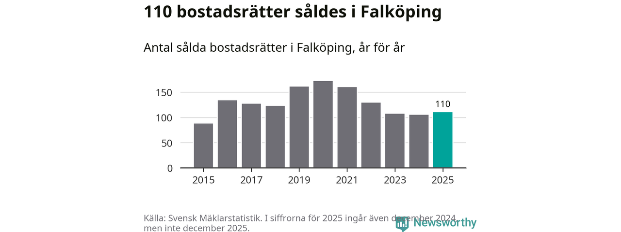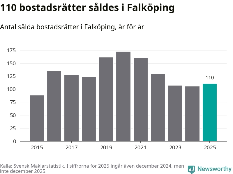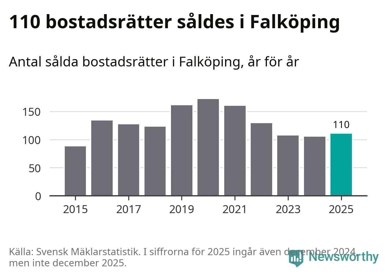 Det såldes totalt 110 bostadsrätter i Falköpings kommun under året. Genomsnittspriset per kvadratmeter landade på 7 373 kronor. Det är en minskning med en procent i kommunen på ett år.