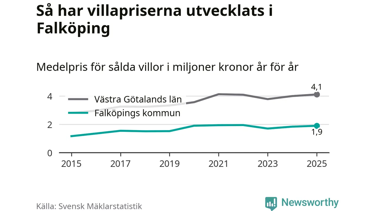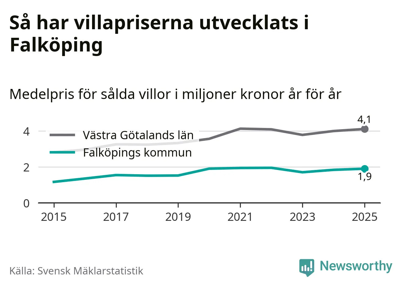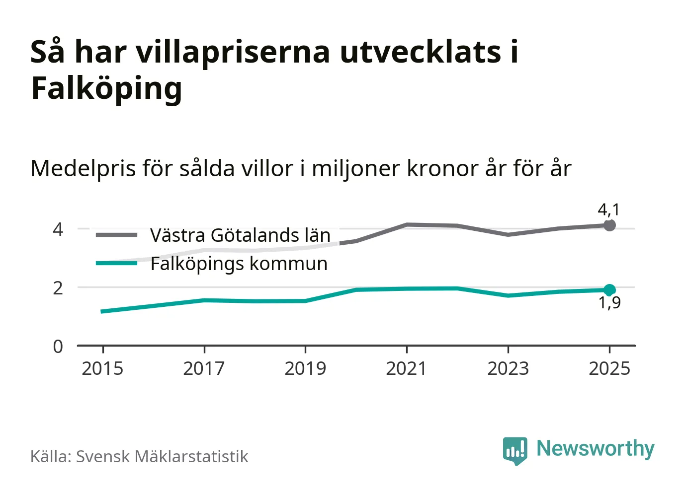 1,9 miljoner kronor är medelpriset för de villor som såldes i Falköpings kommun under året, eller 15 356 kronor per kvadratmeter. Det innebär en prisökning med tre procent på ett år och är andra året i rad som priserna ökar i kommunen.