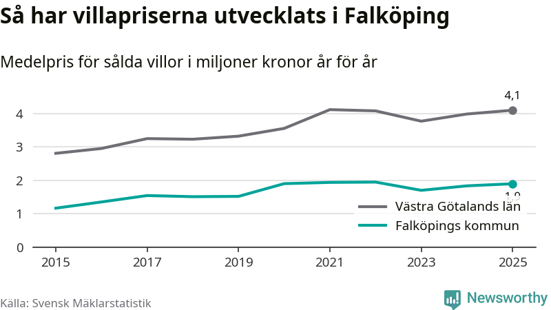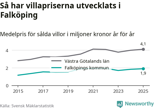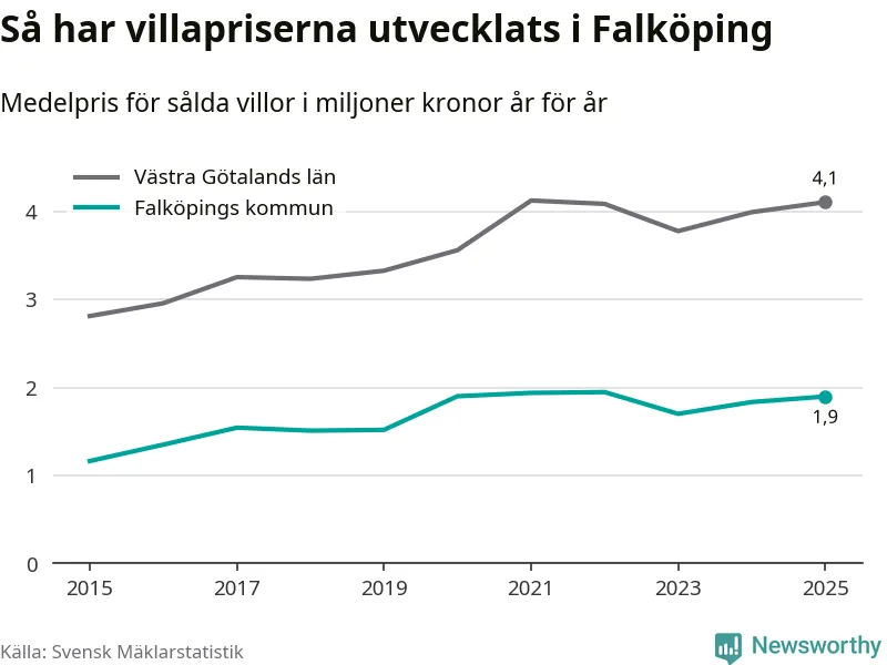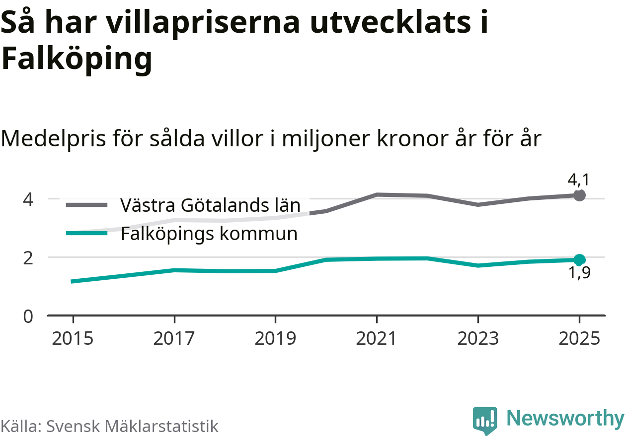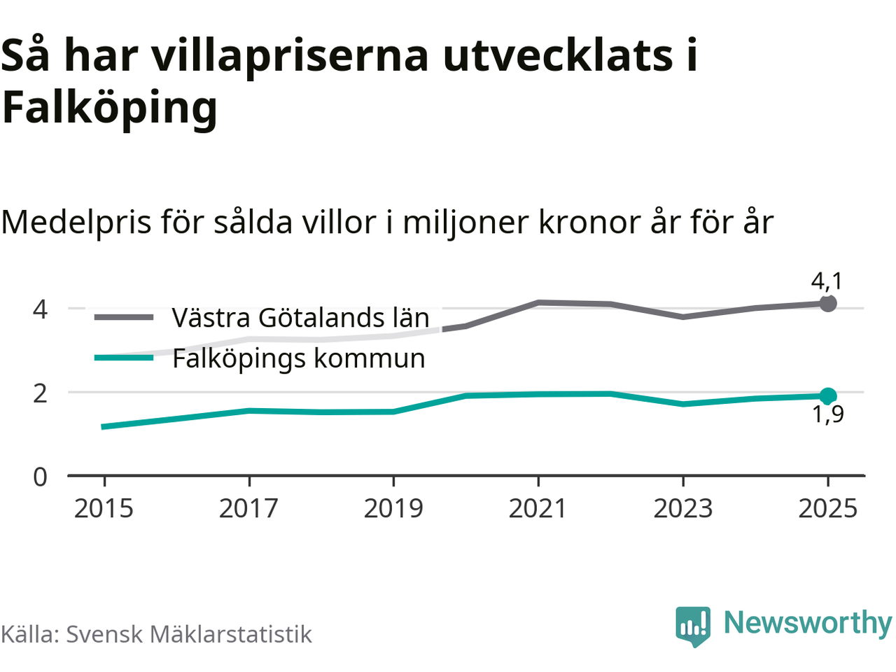 1,9 miljoner kronor är medelpriset för de villor som såldes i Falköpings kommun under året, eller 15 356 kronor per kvadratmeter. Det innebär en prisökning med tre procent på ett år och är andra året i rad som priserna ökar i kommunen.