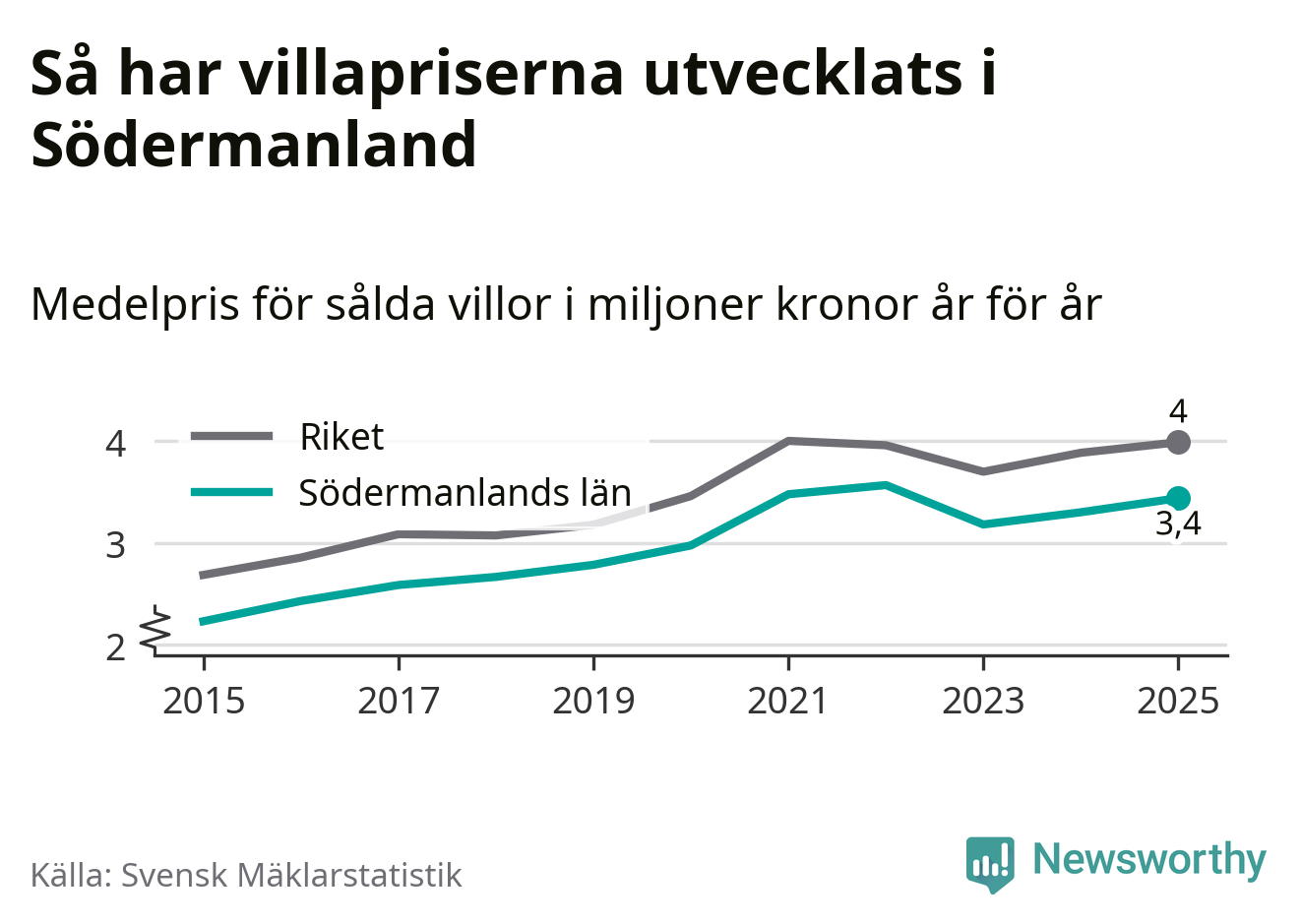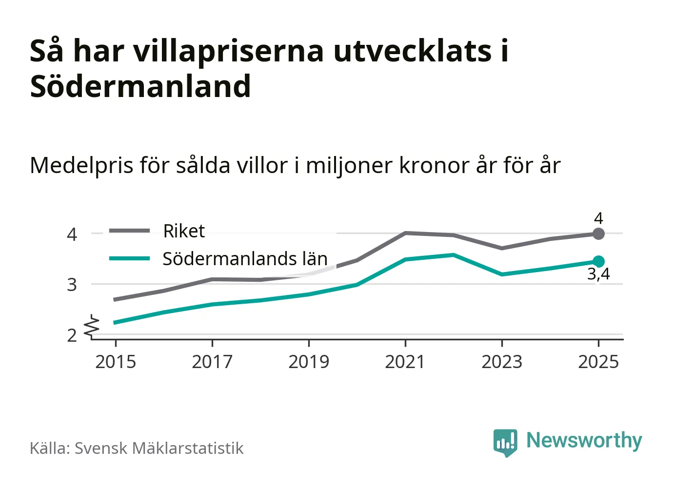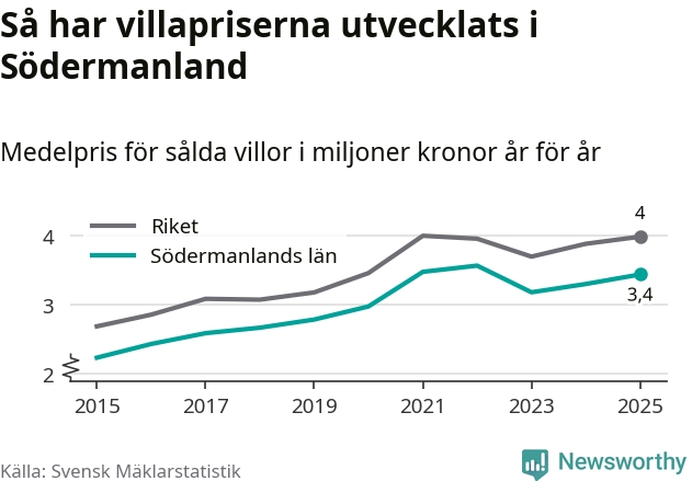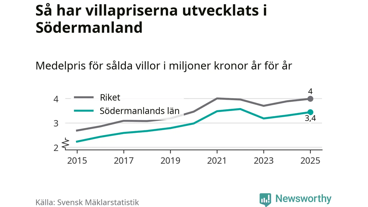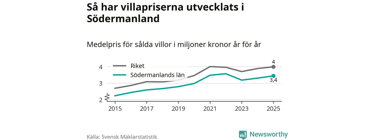 3,4 miljoner kronor är medelpriset för de villor som såldes i Södermanlands län under året, eller 28 658 kronor per kvadratmeter. Det innebär en prisökning med fyra procent på ett år och är andra året i rad som priserna ökar i länet.