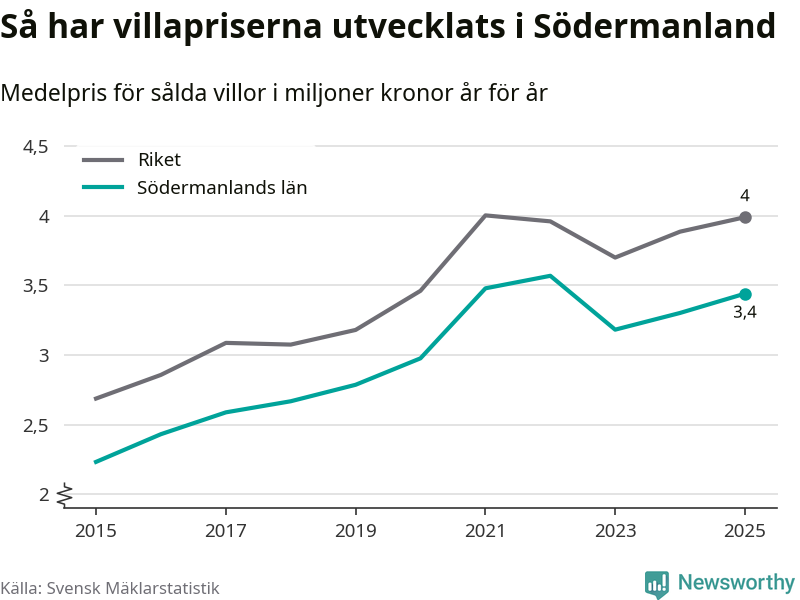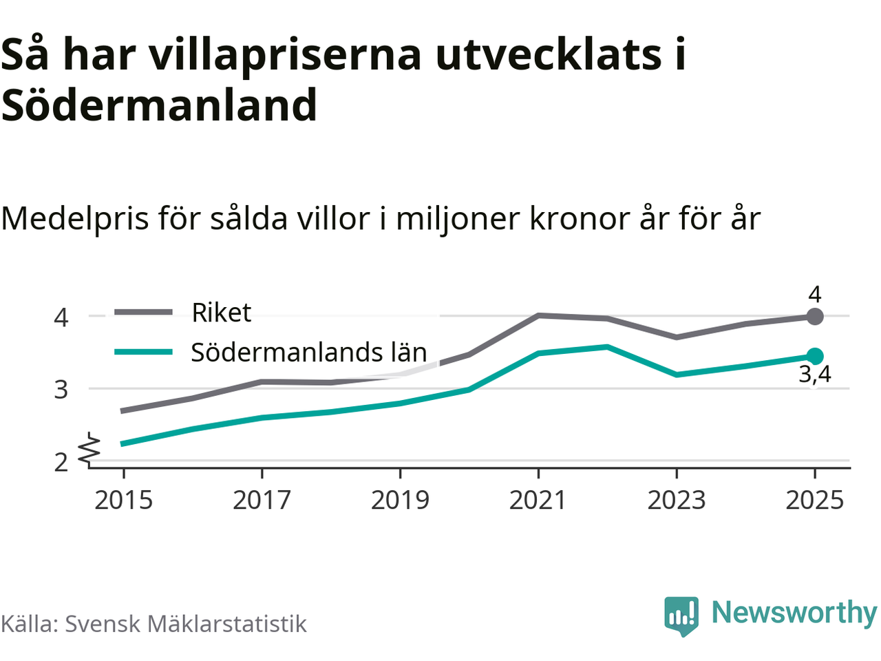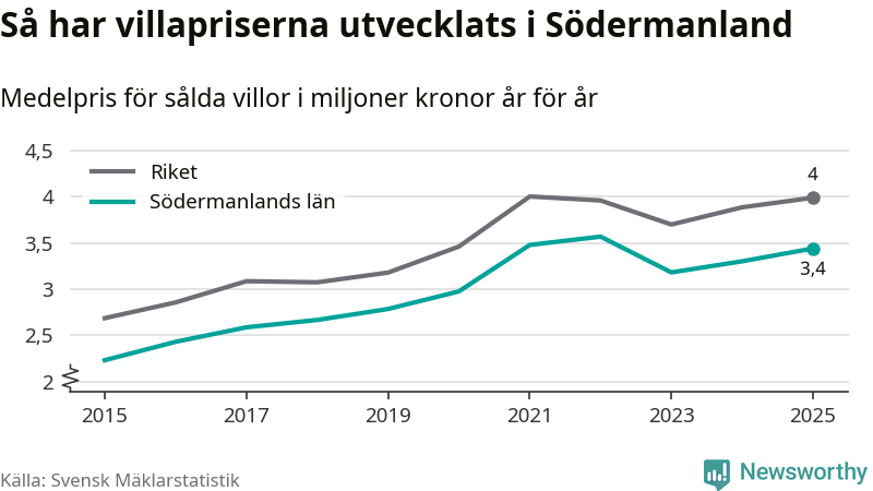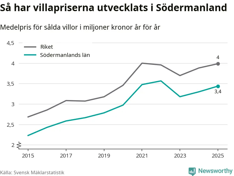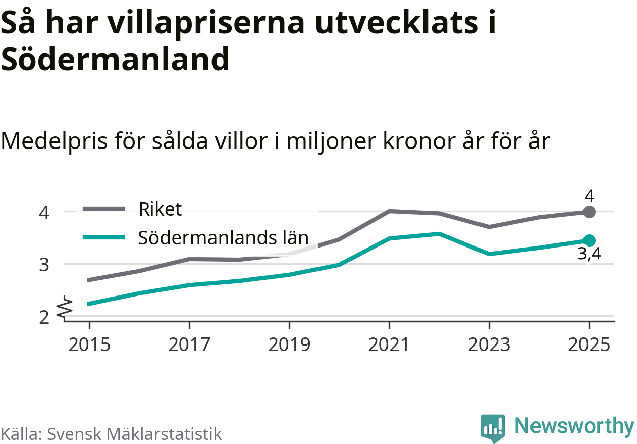 3,4 miljoner kronor är medelpriset för de villor som såldes i Södermanlands län under året, eller 28 658 kronor per kvadratmeter. Det innebär en prisökning med fyra procent på ett år och är andra året i rad som priserna ökar i länet.