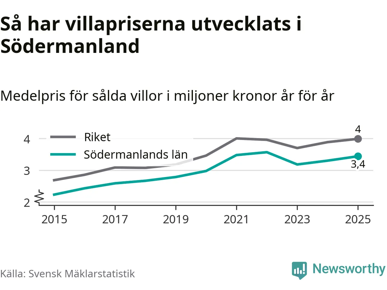 Bostadsmarknaden i Sverige närmar sig nivån före räntesmockan 2022. I Södermanland ökade villapriserna för andra året i rad.