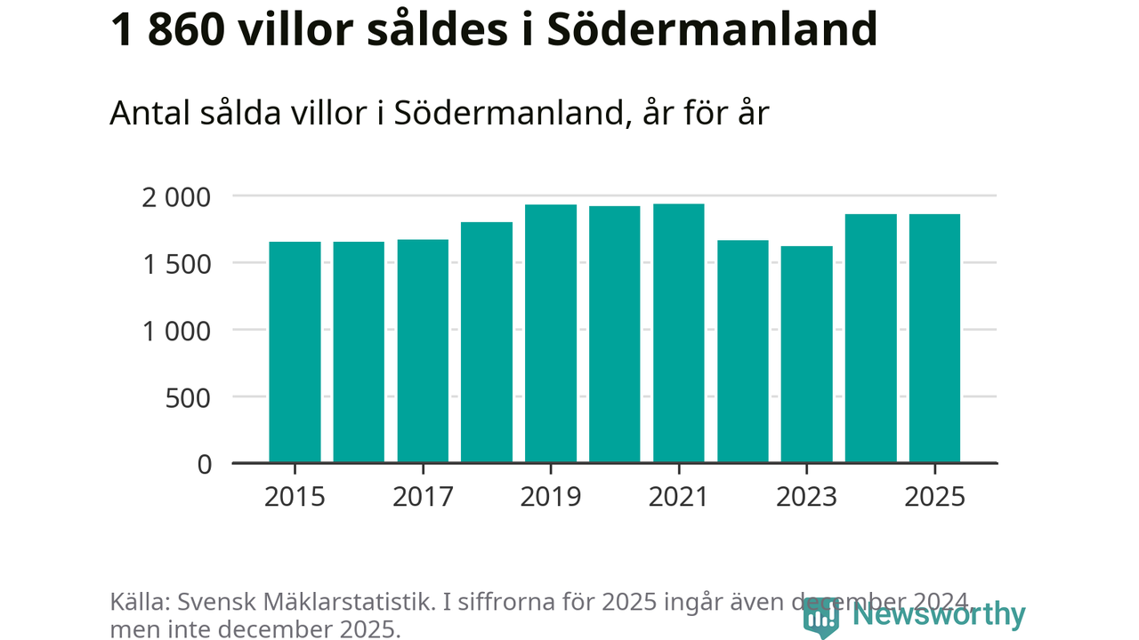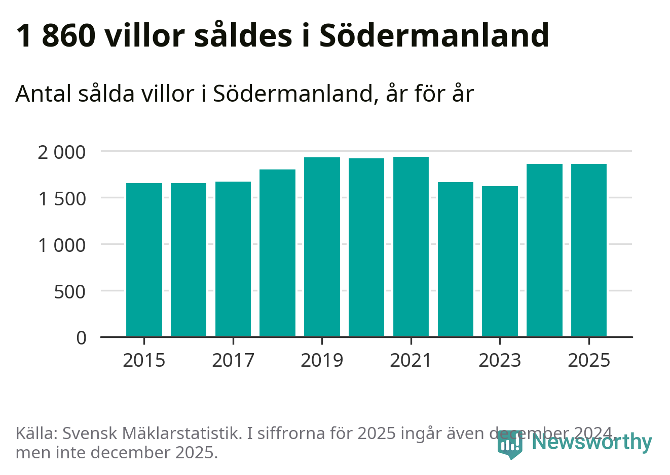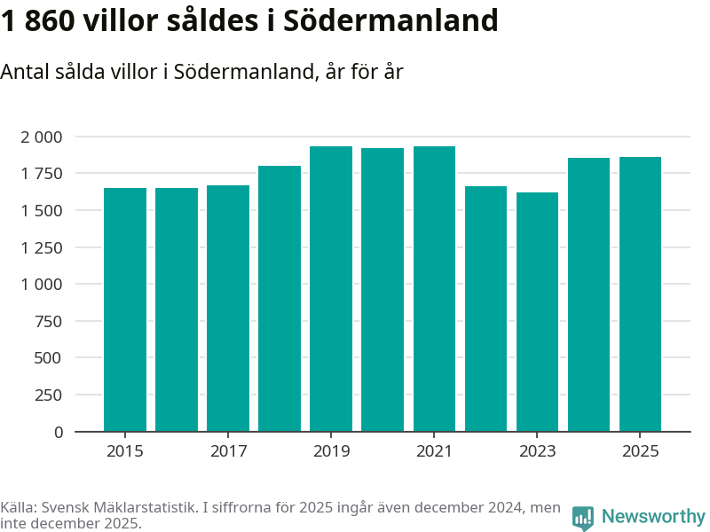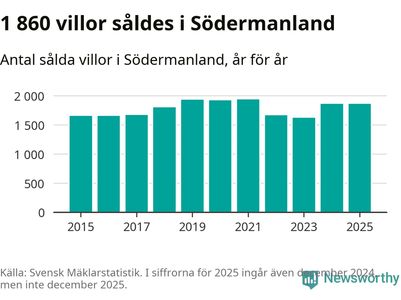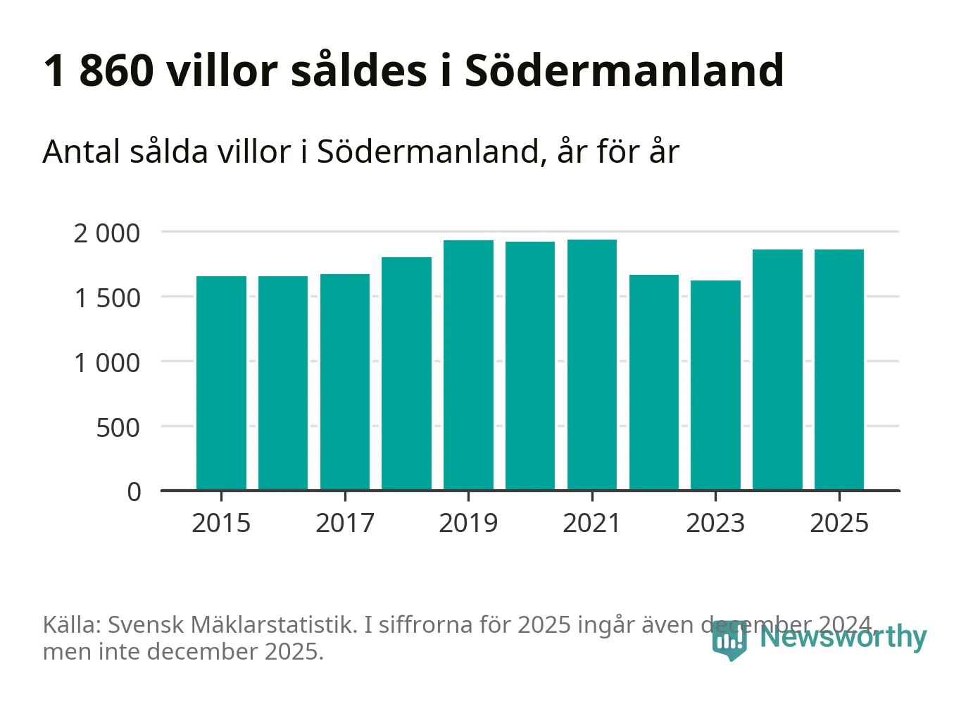 Antalet sålda villor ökade också något. Totalt såldes 1 860 villor, att jämföra med 1 857 under 2024. Det är andra året i rad som antalet sålda villor ökar i länet.