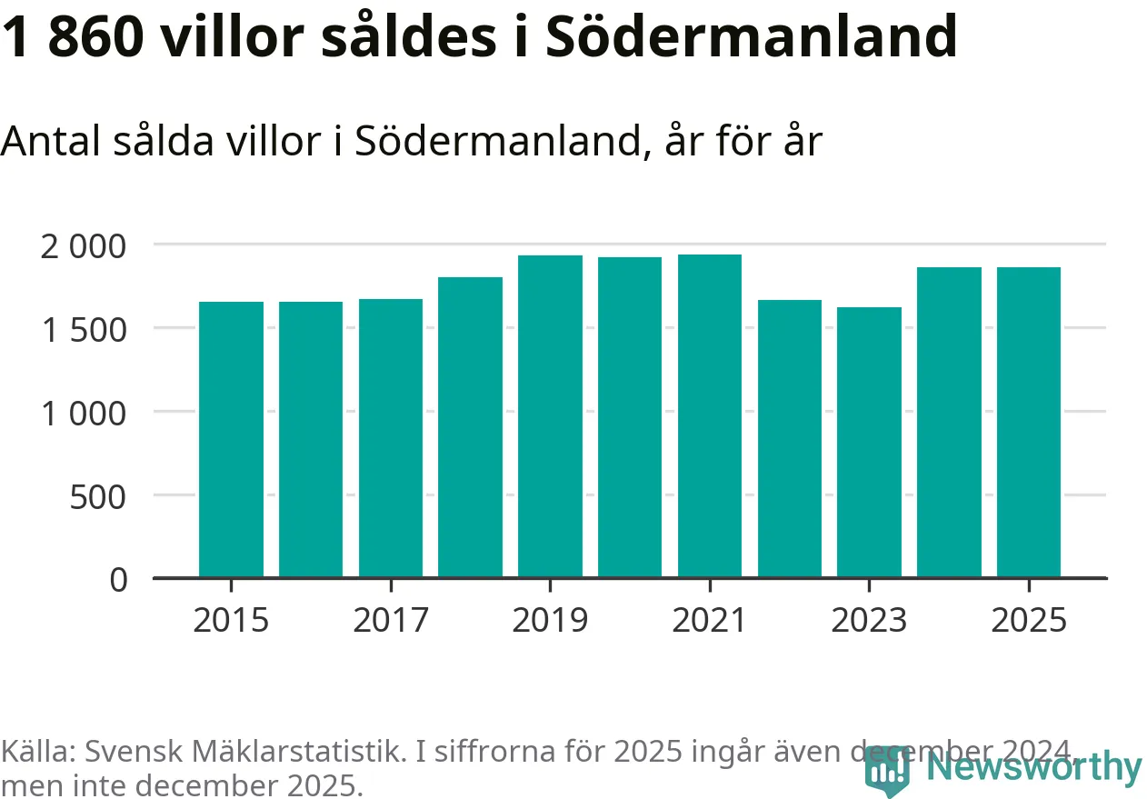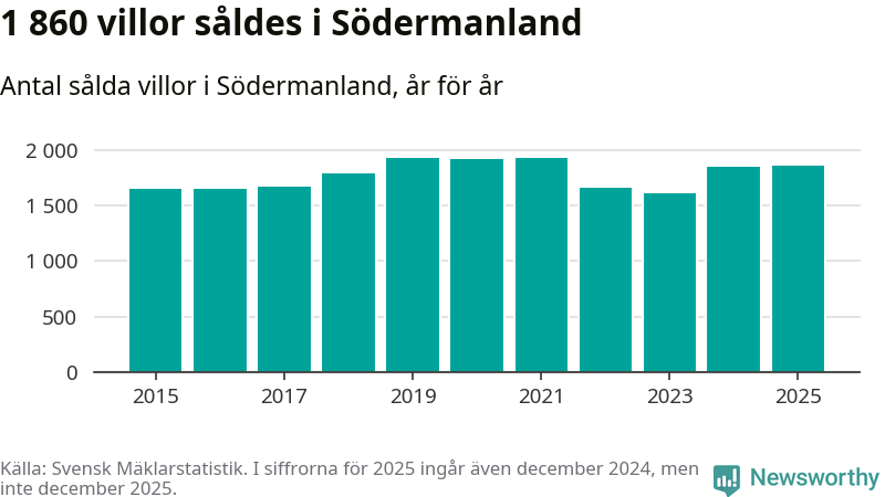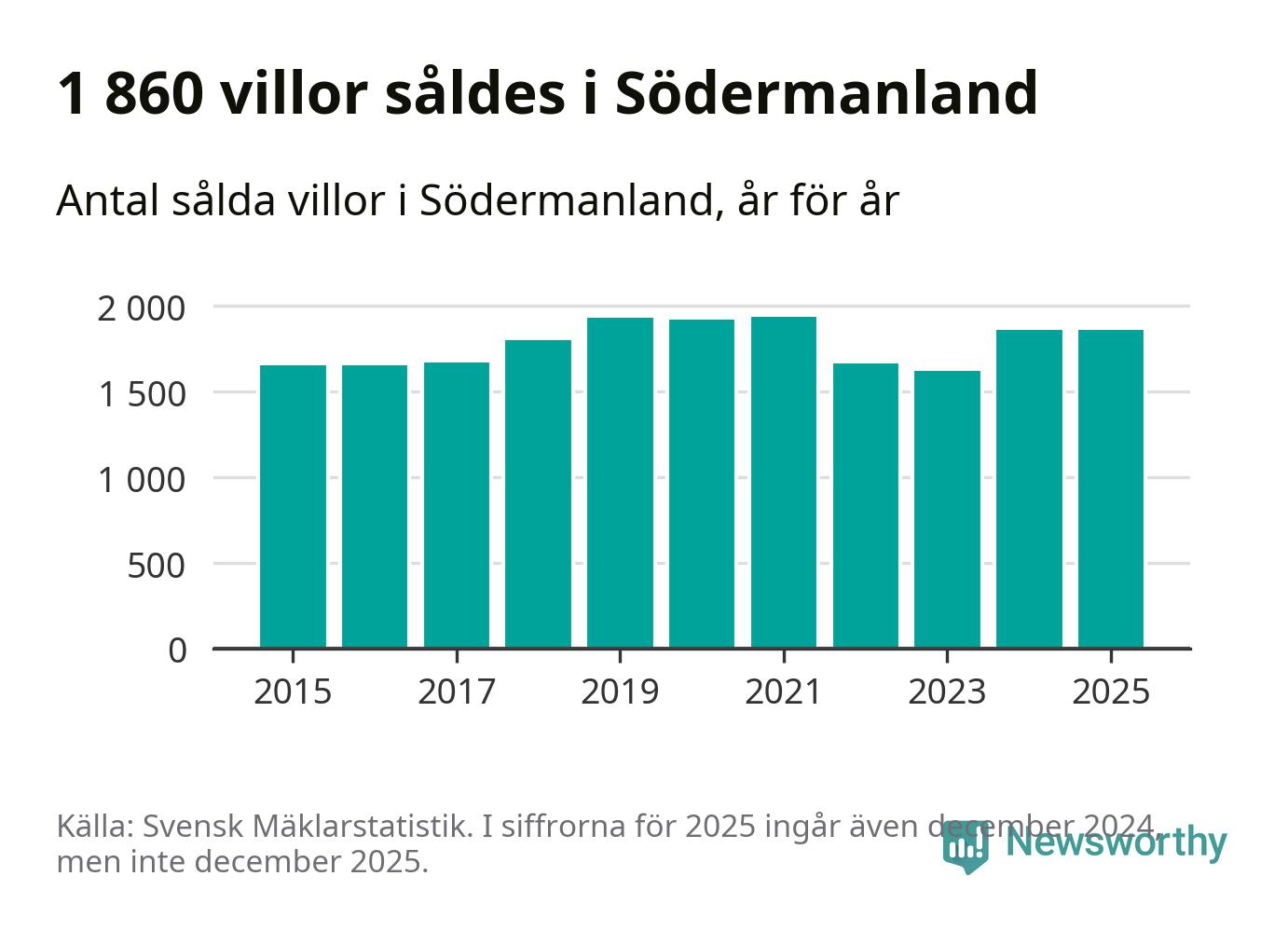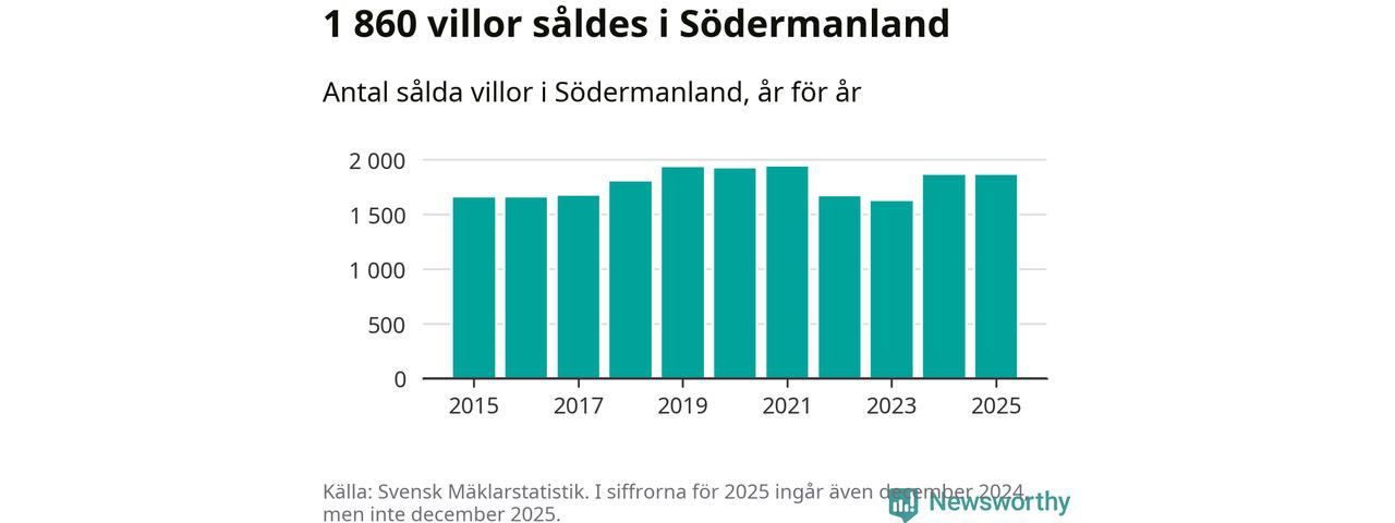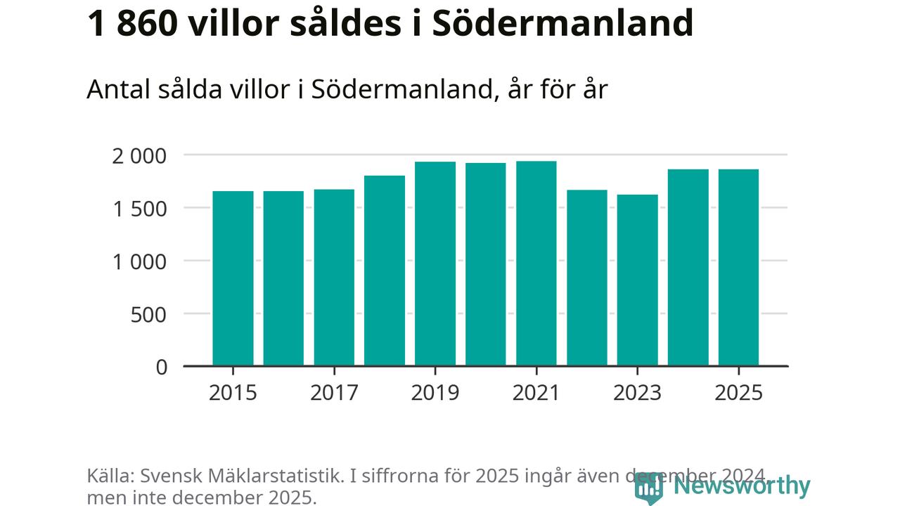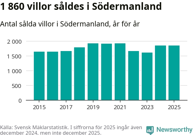 Antalet sålda villor ökade också något. Totalt såldes 1 860 villor, att jämföra med 1 857 under 2024. Det är andra året i rad som antalet sålda villor ökar i länet.
