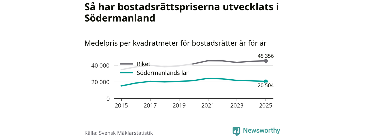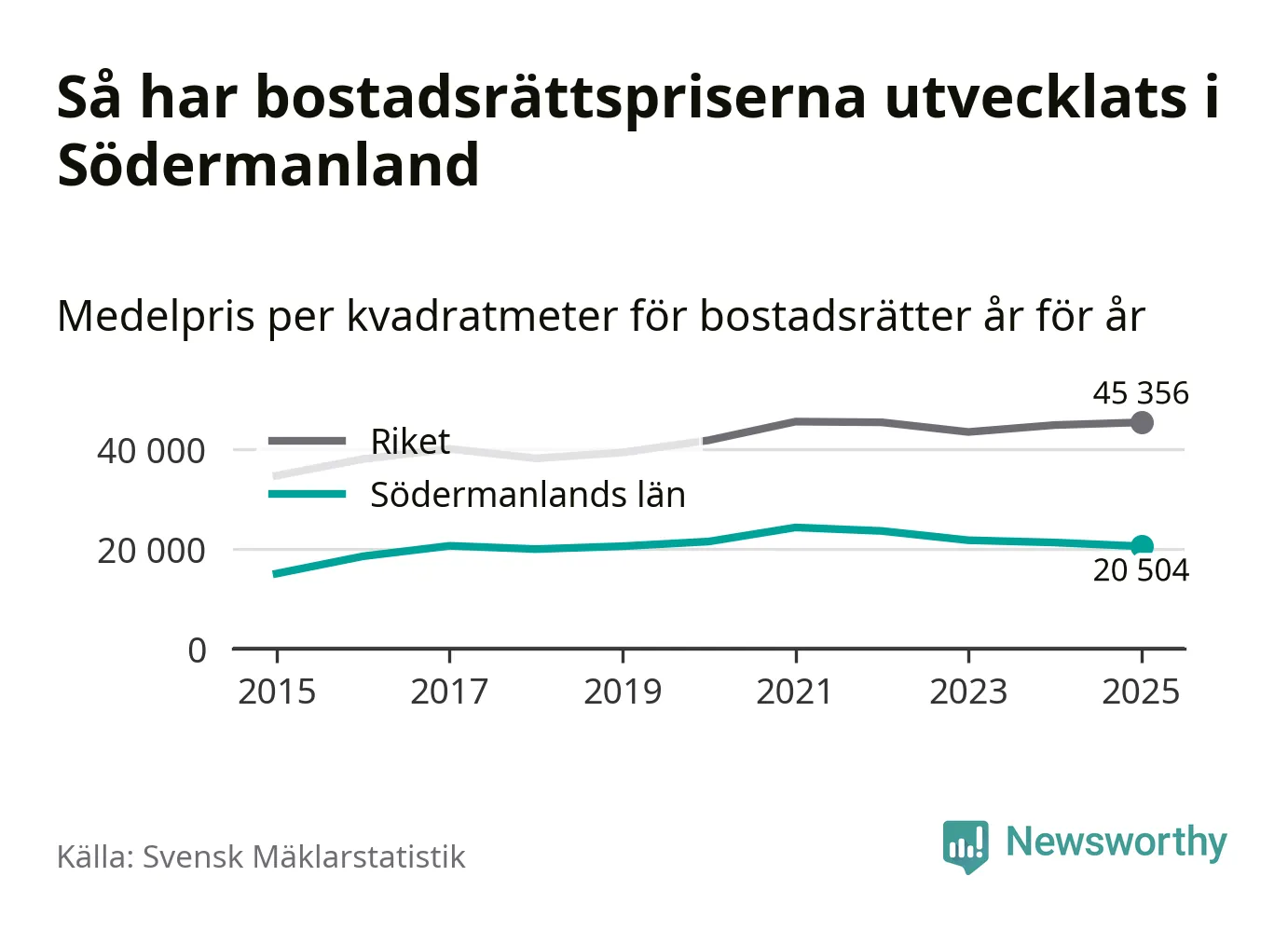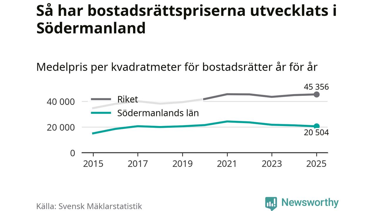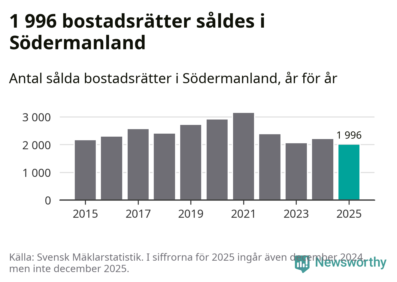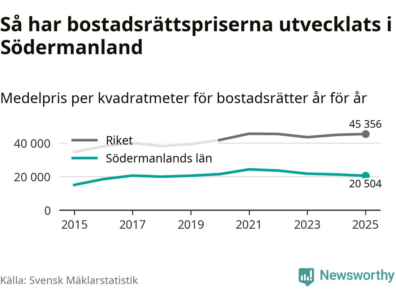 Det såldes totalt 1 996 bostadsrätter i Södermanlands län under året. Det är färre än något annat år sedan 2015. Genomsnittspriset per kvadratmeter landade på 20 504 kronor. Det är en minskning med fyra procent i länet på ett år.