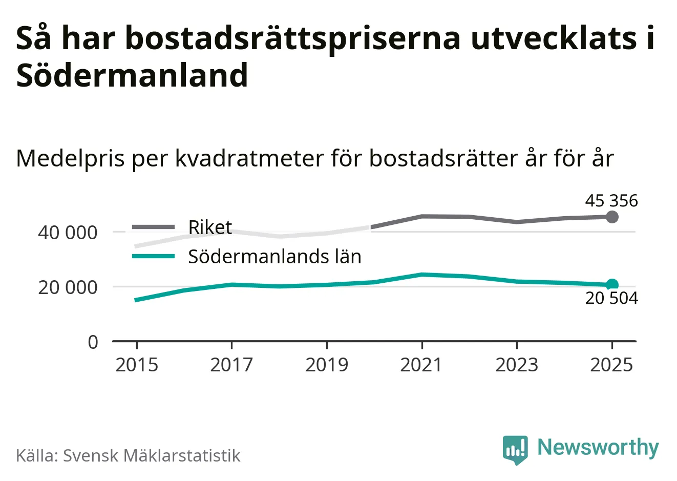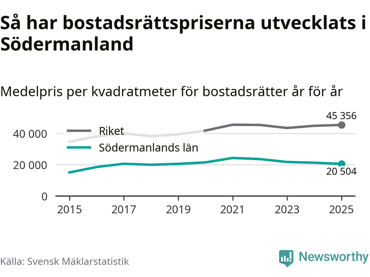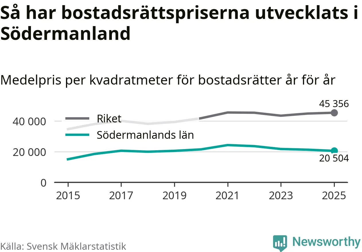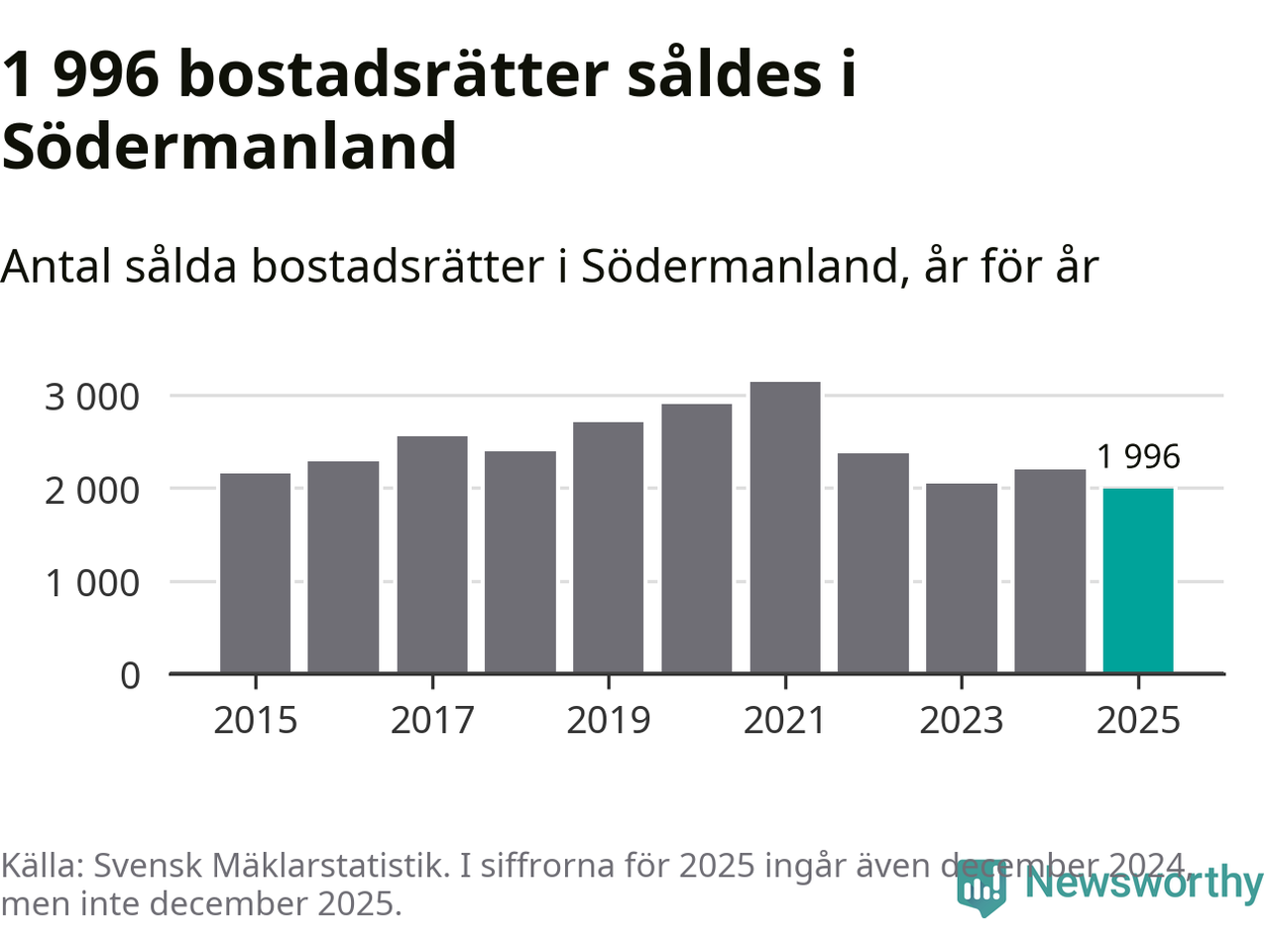 Det såldes totalt 1 996 bostadsrätter i Södermanlands län under året. Det är färre än något annat år sedan 2015. Genomsnittspriset per kvadratmeter landade på 20 504 kronor. Det är en minskning med fyra procent i länet på ett år.
