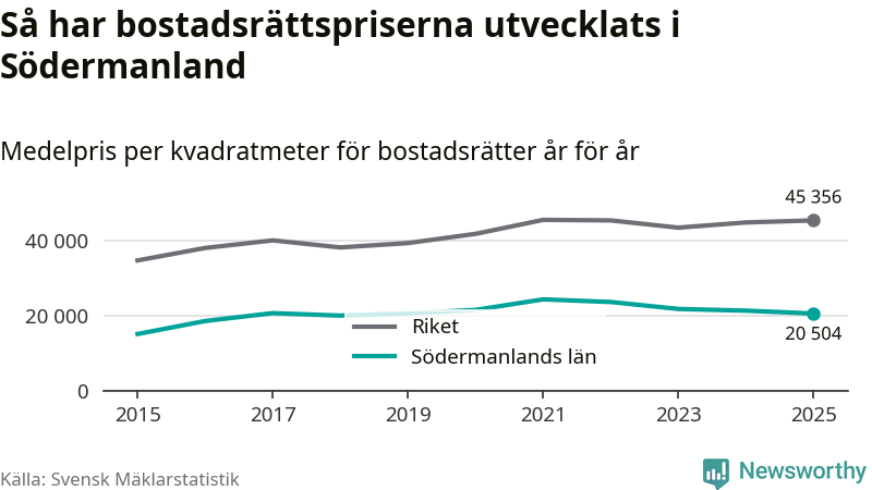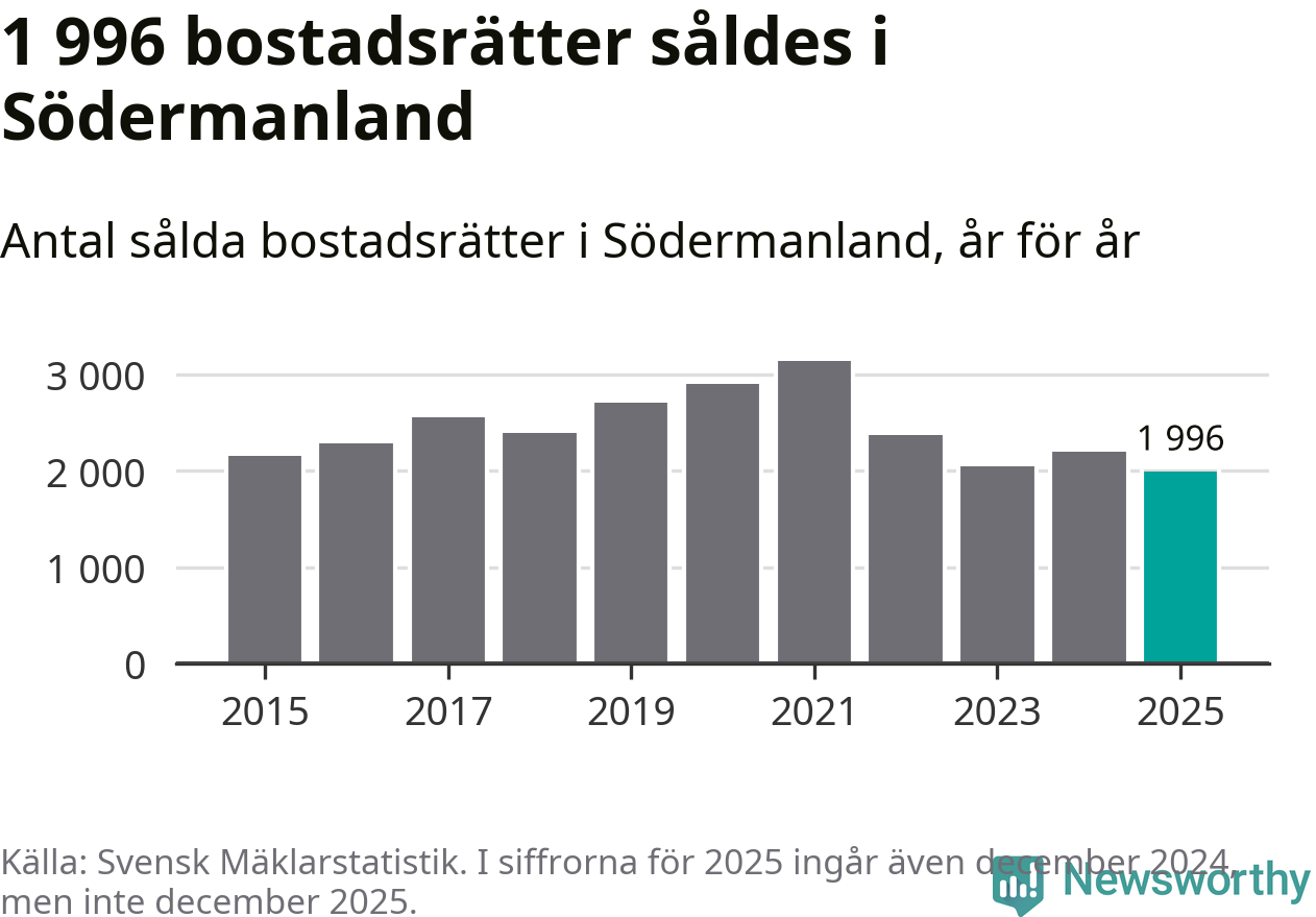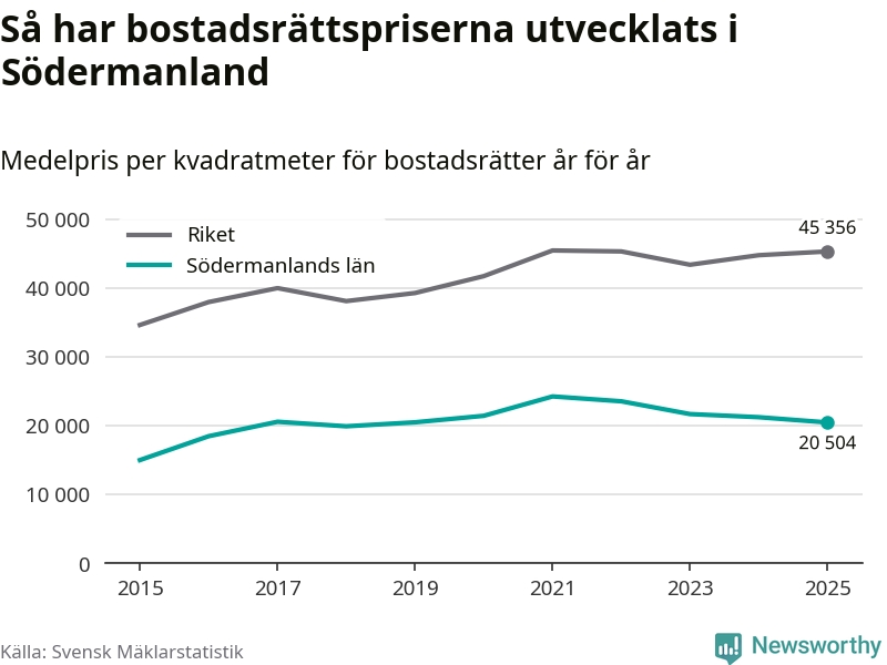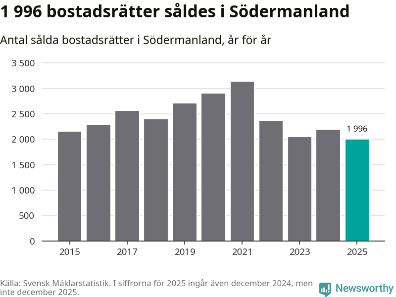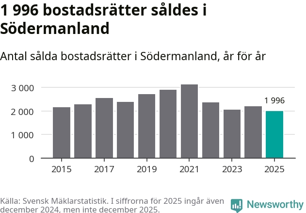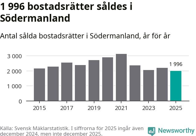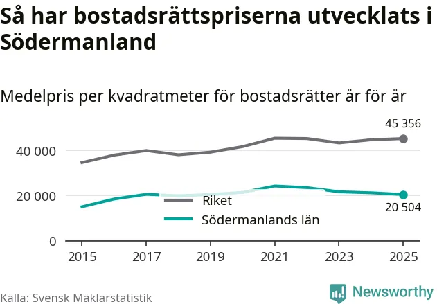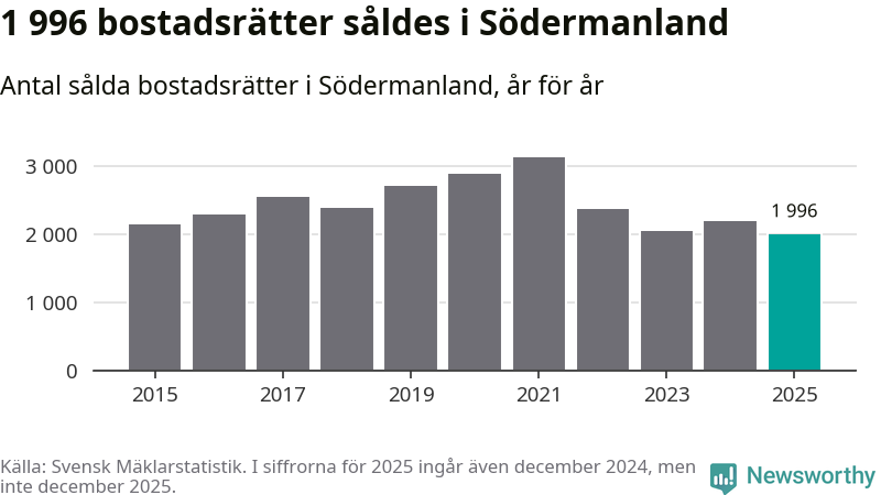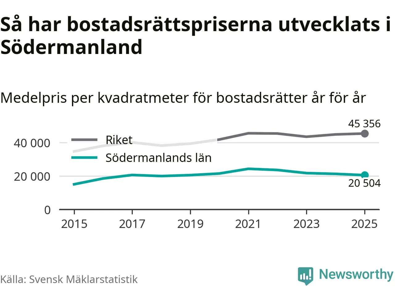 Det såldes totalt 1 996 bostadsrätter i Södermanlands län under året. Det är färre än något annat år sedan 2015. Genomsnittspriset per kvadratmeter landade på 20 504 kronor. Det är en minskning med fyra procent i länet på ett år.