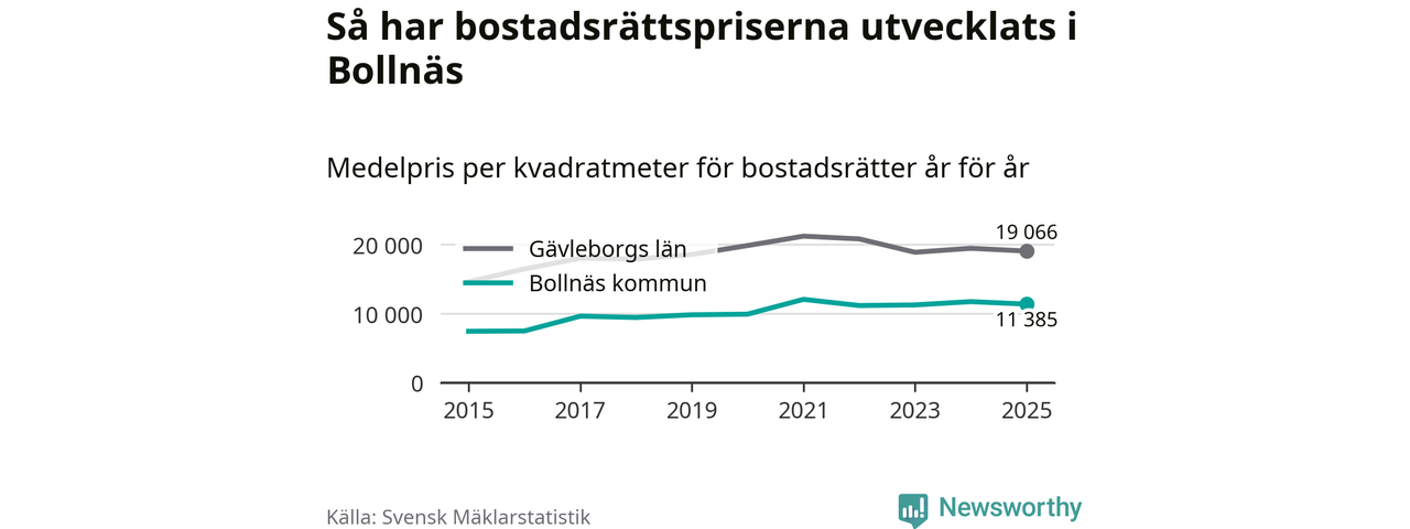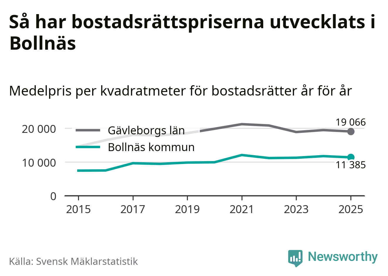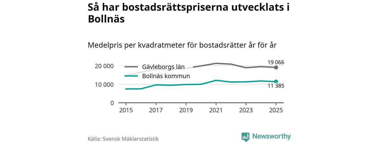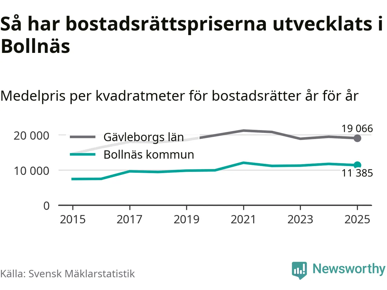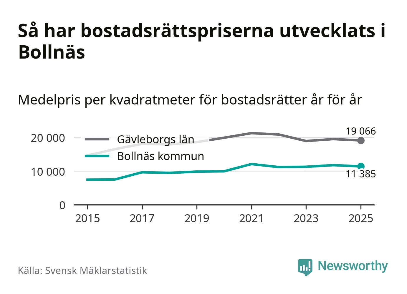 Det såldes totalt 65 bostadsrätter i Bollnäs kommun under året. Det är färre än något annat år sedan 2015. Genomsnittspriset per kvadratmeter landade på 11 385 kronor. Det är en minskning med tre procent i kommunen på ett år.
