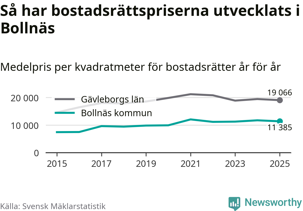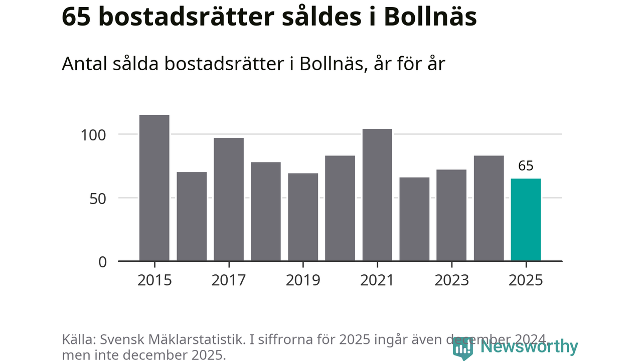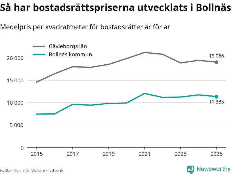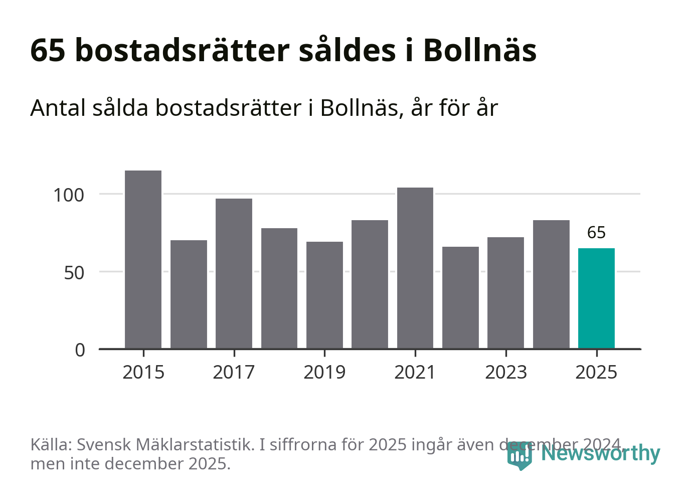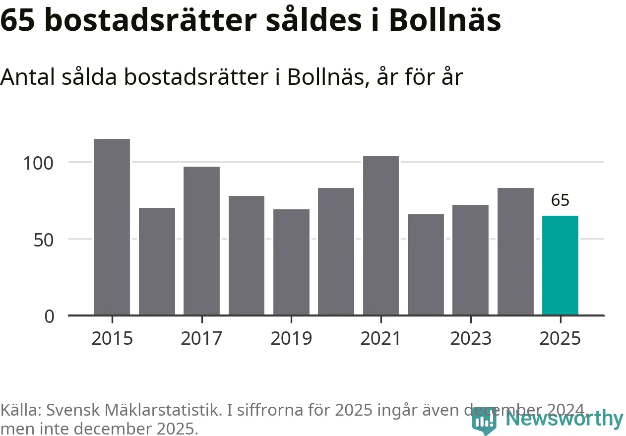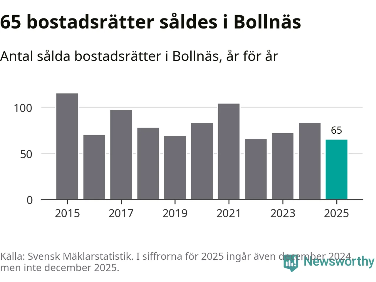 Det såldes totalt 65 bostadsrätter i Bollnäs kommun under året. Det är färre än något annat år sedan 2015. Genomsnittspriset per kvadratmeter landade på 11 385 kronor. Det är en minskning med tre procent i kommunen på ett år.