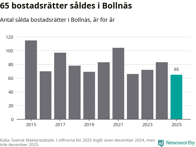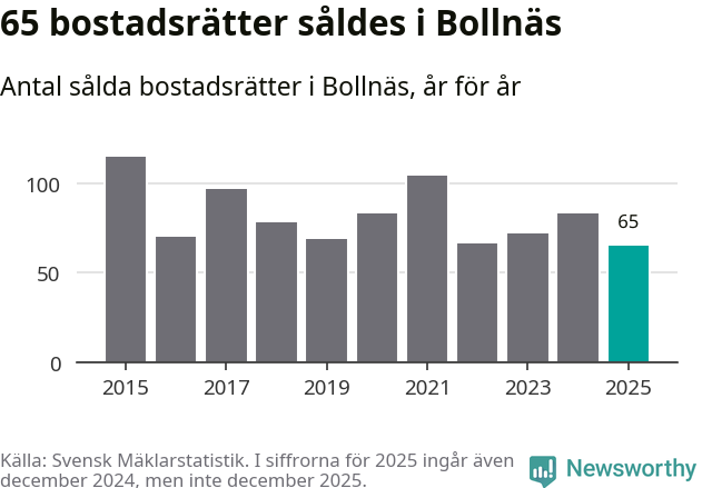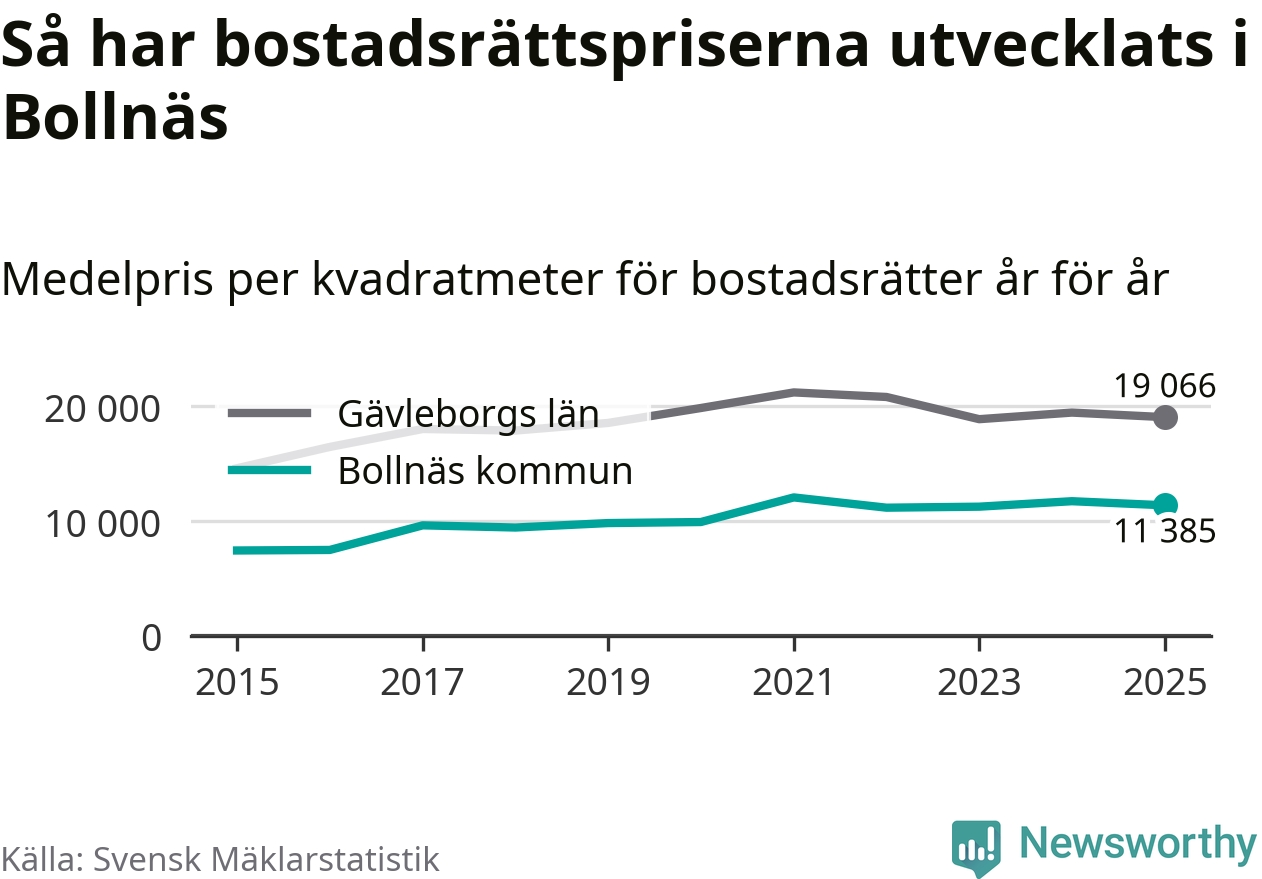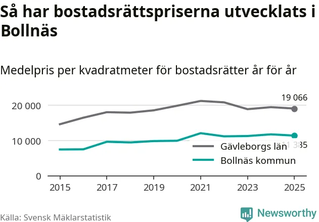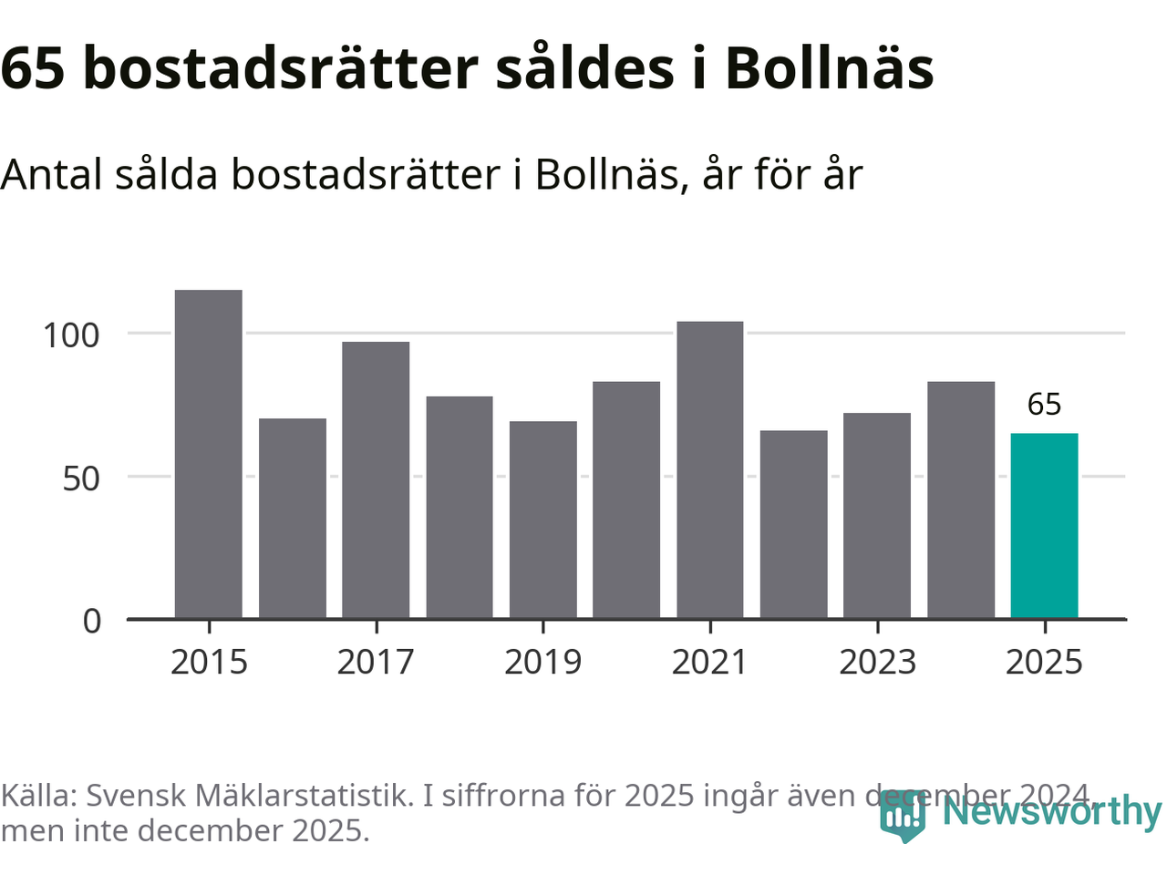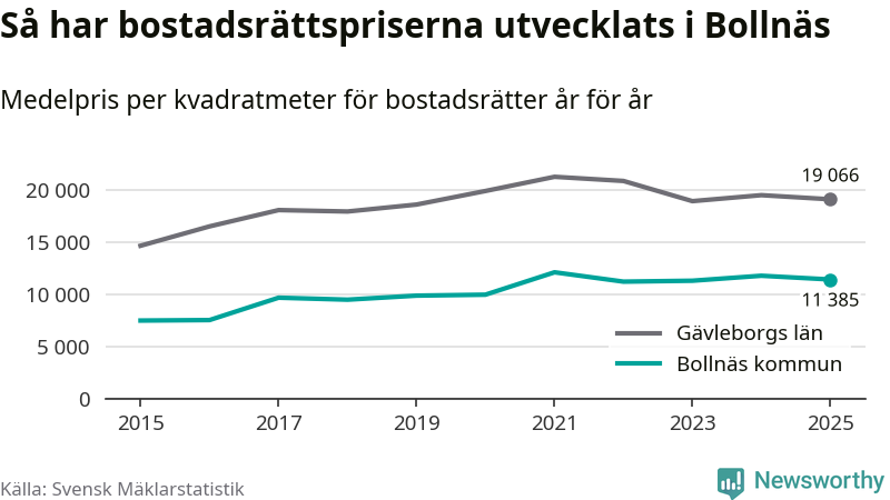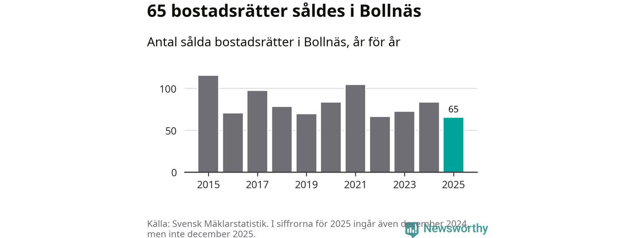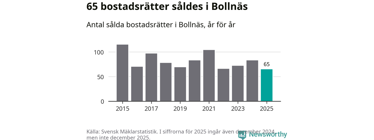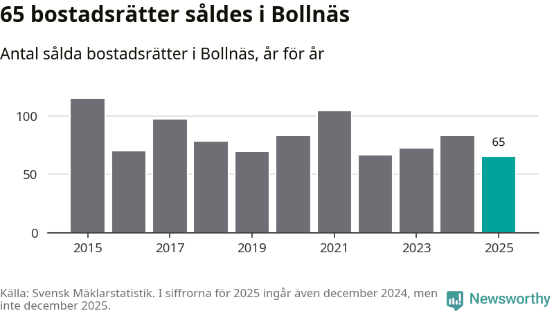 Det såldes totalt 65 bostadsrätter i Bollnäs kommun under året. Det är färre än något annat år sedan 2015. Genomsnittspriset per kvadratmeter landade på 11 385 kronor. Det är en minskning med tre procent i kommunen på ett år.