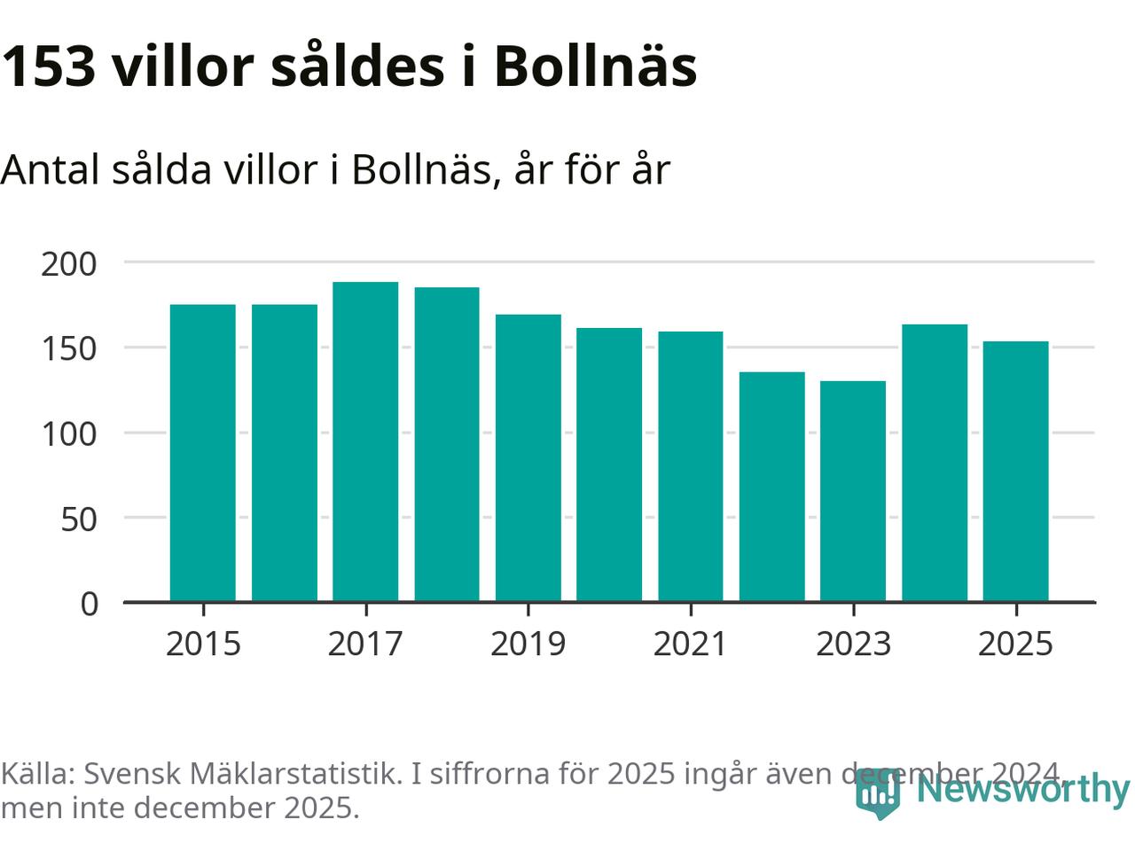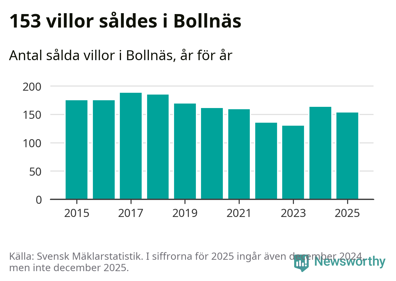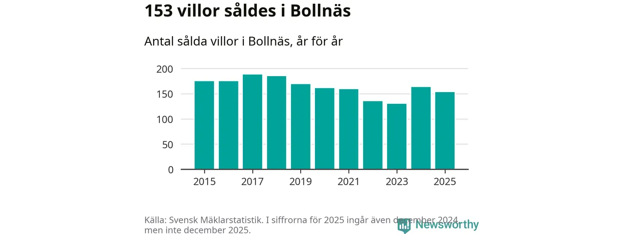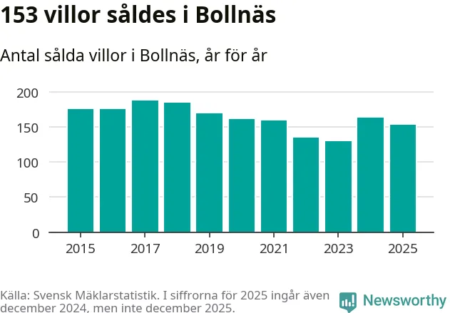 Däremot minskade antalet sålda villor. Totalt såldes 153 villor, att jämföra med 163 under 2024.