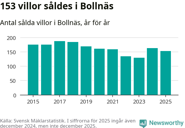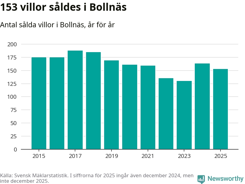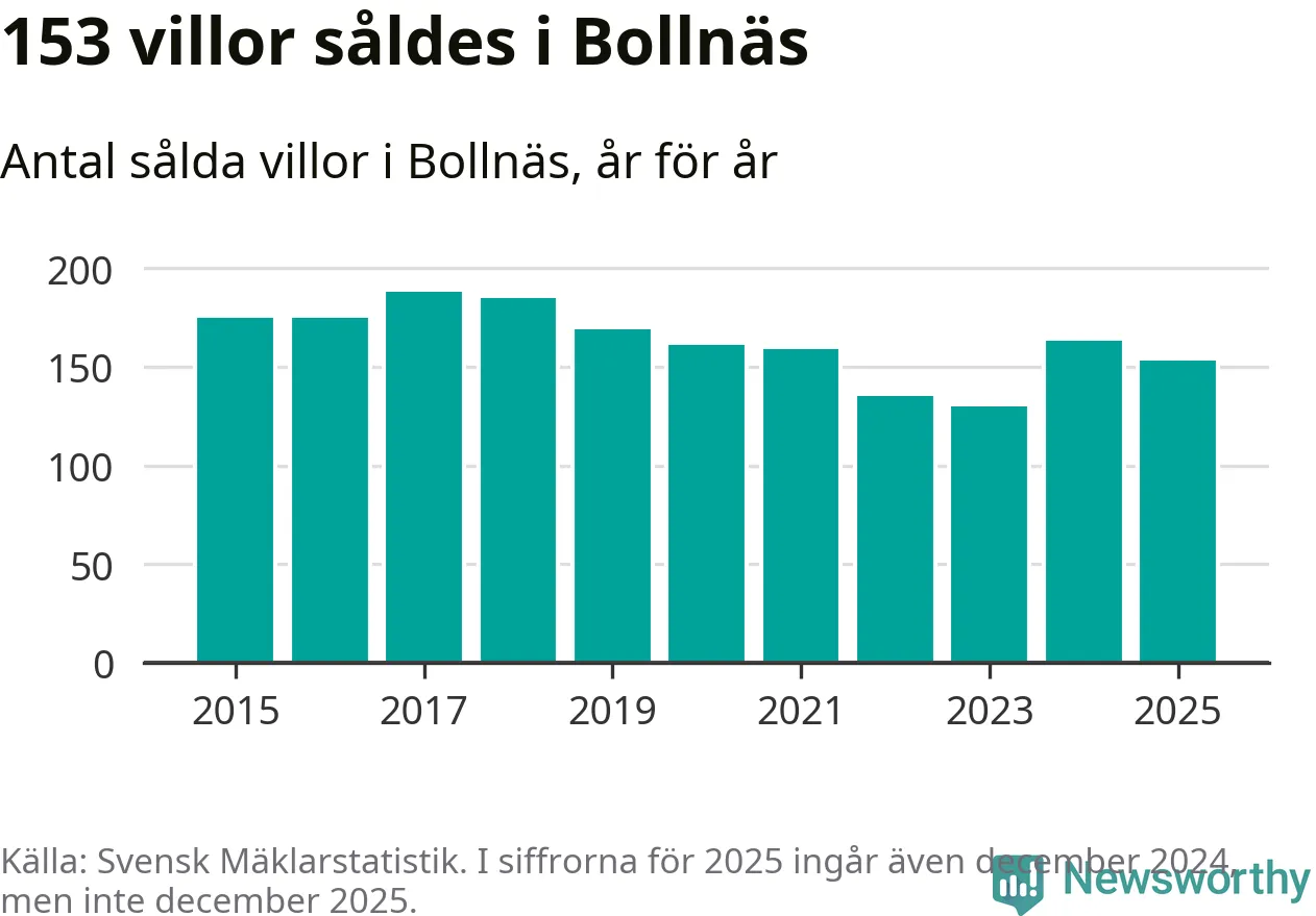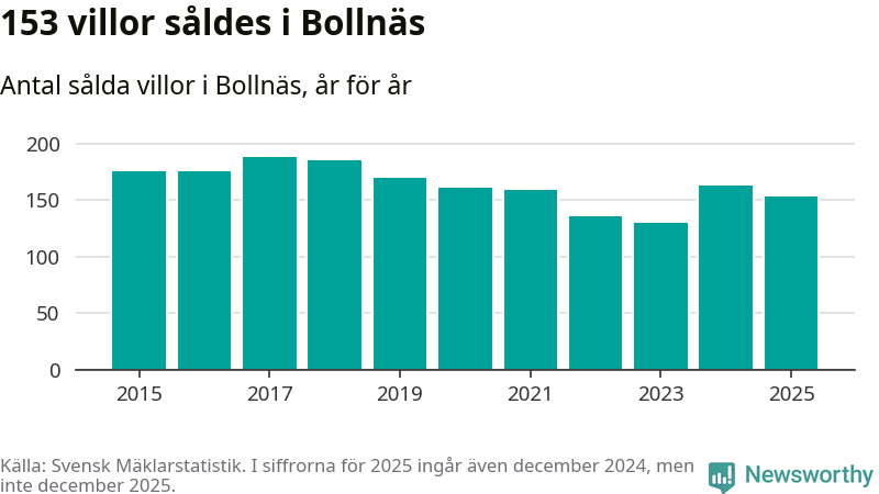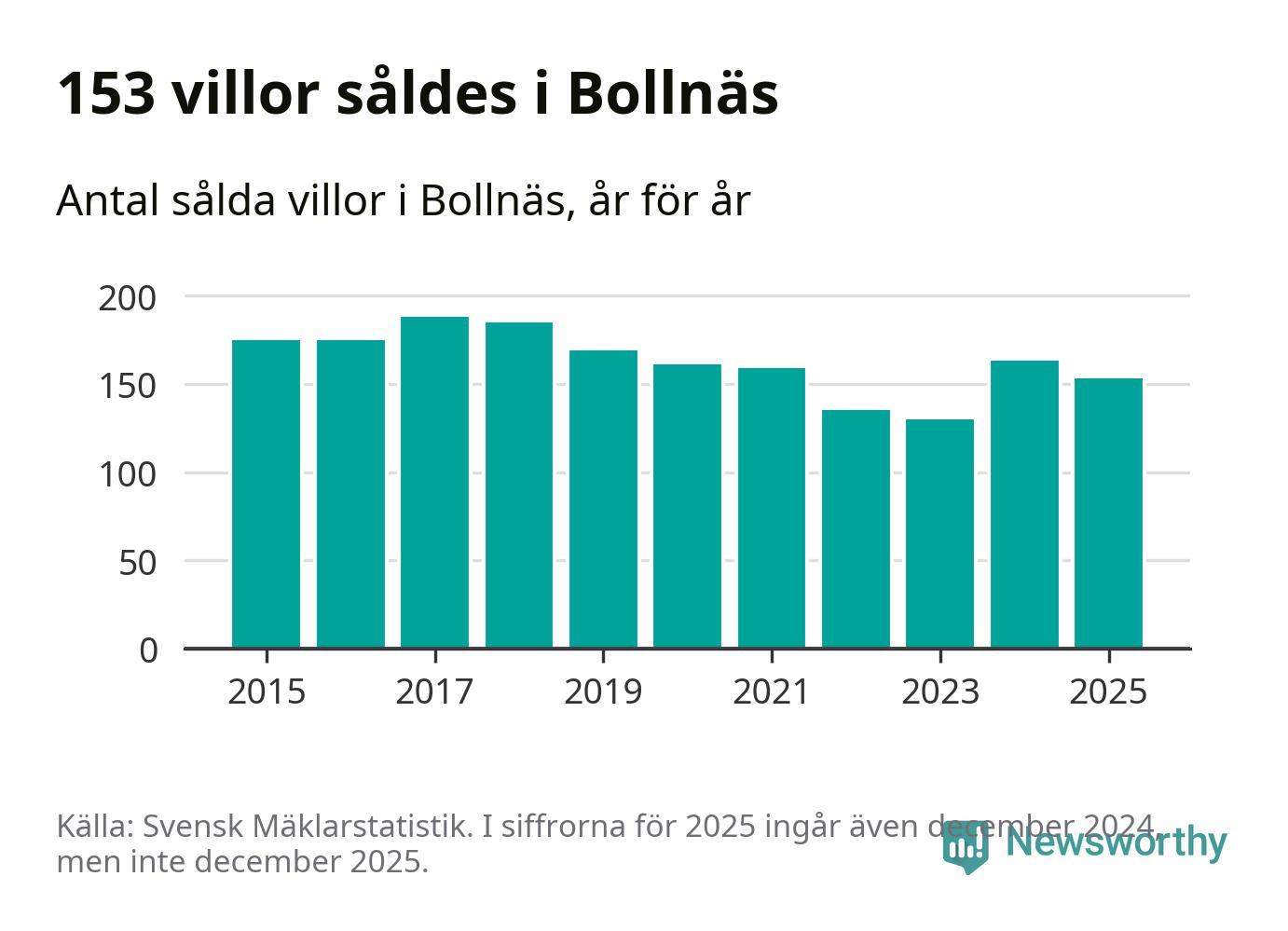 Däremot minskade antalet sålda villor. Totalt såldes 153 villor, att jämföra med 163 under 2024.