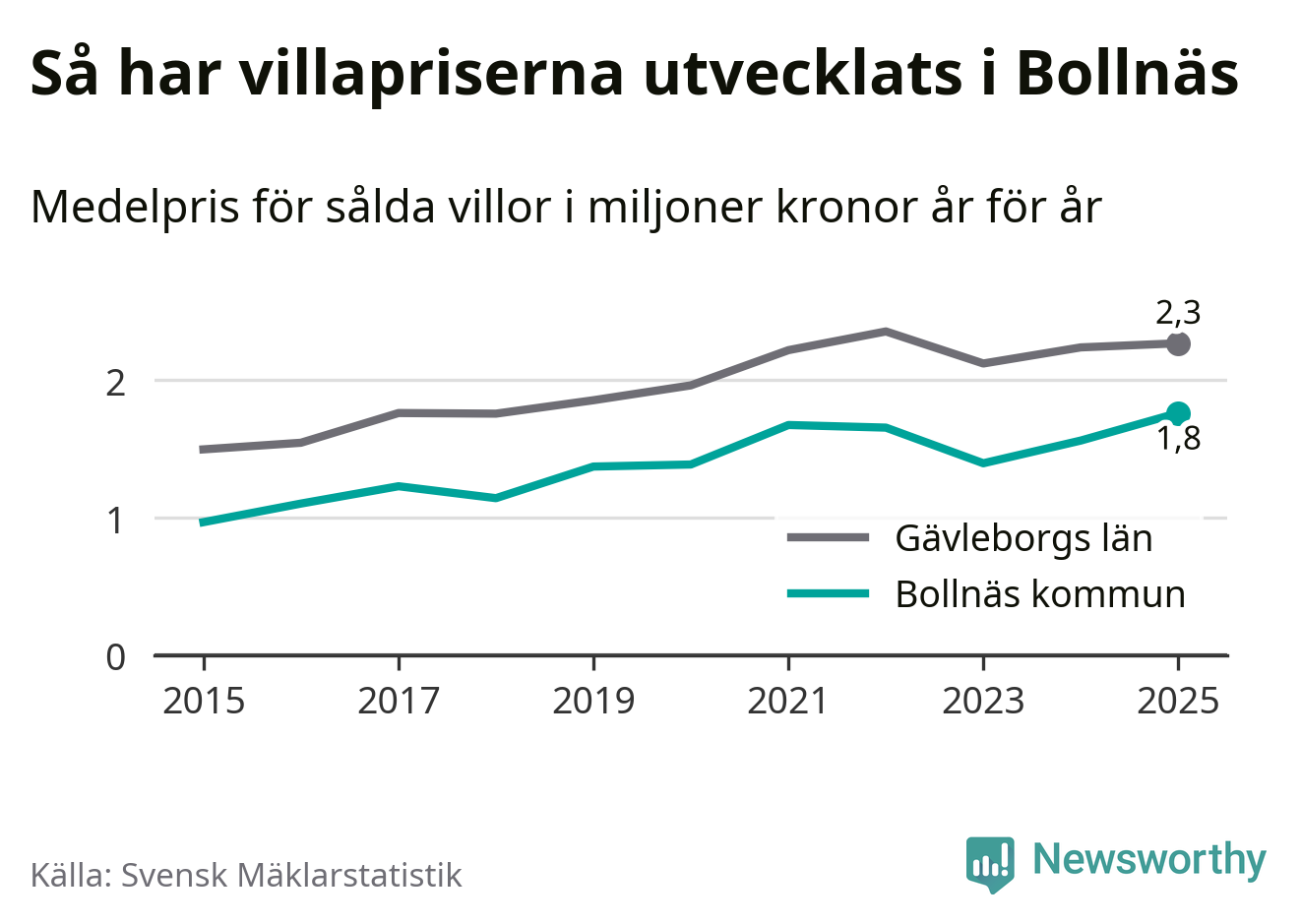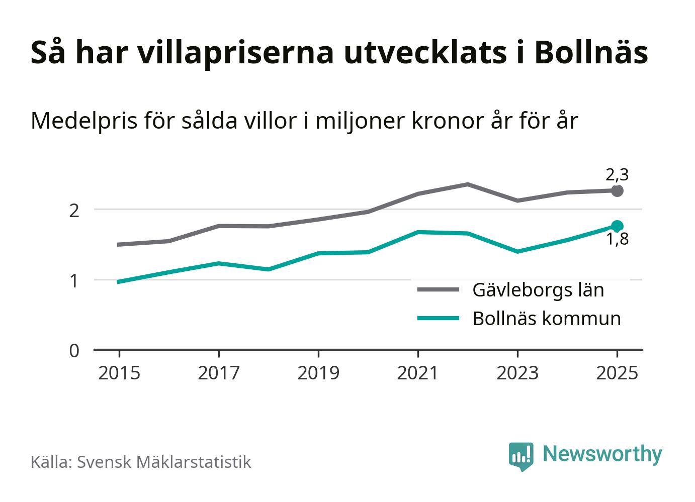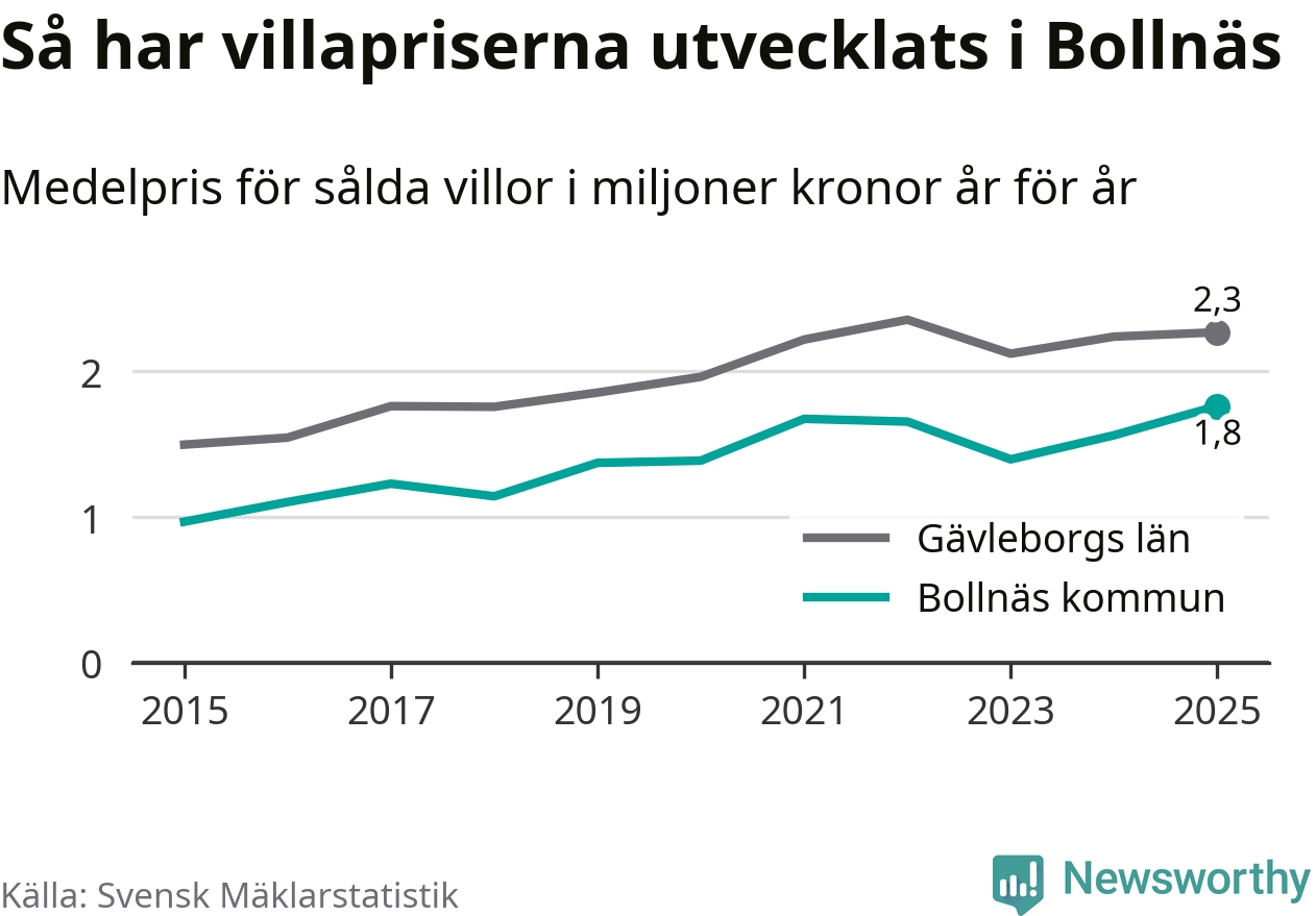 1,8 miljoner kronor är medelpriset för de villor som såldes i Bollnäs kommun under året, eller 15 954 kronor per kvadratmeter. Det innebär en prisökning med 13 procent på ett år. Det är det högsta årssnittet på åtminstone tio år.