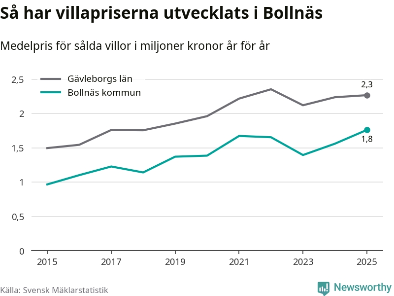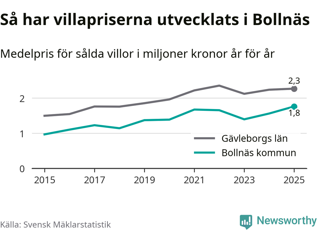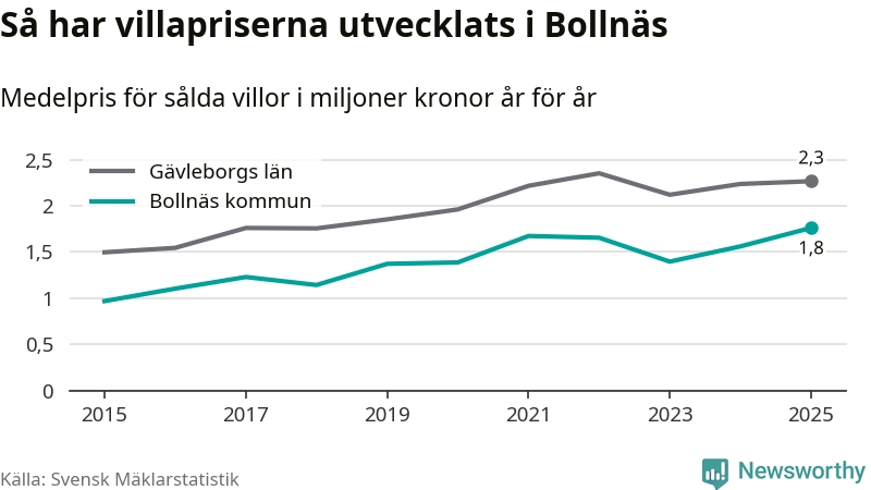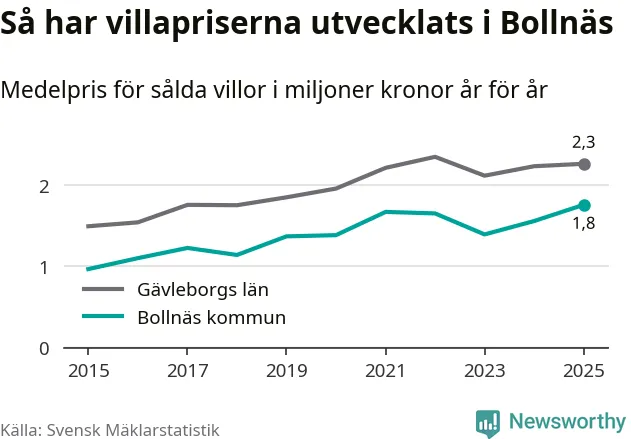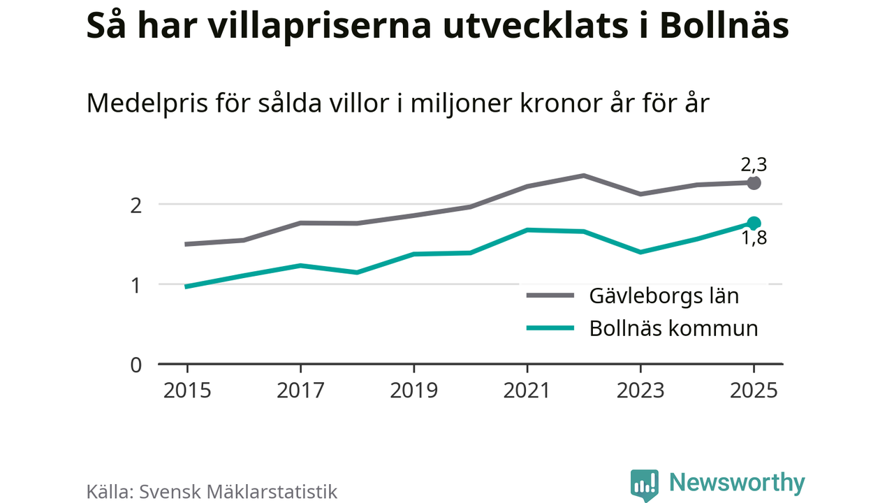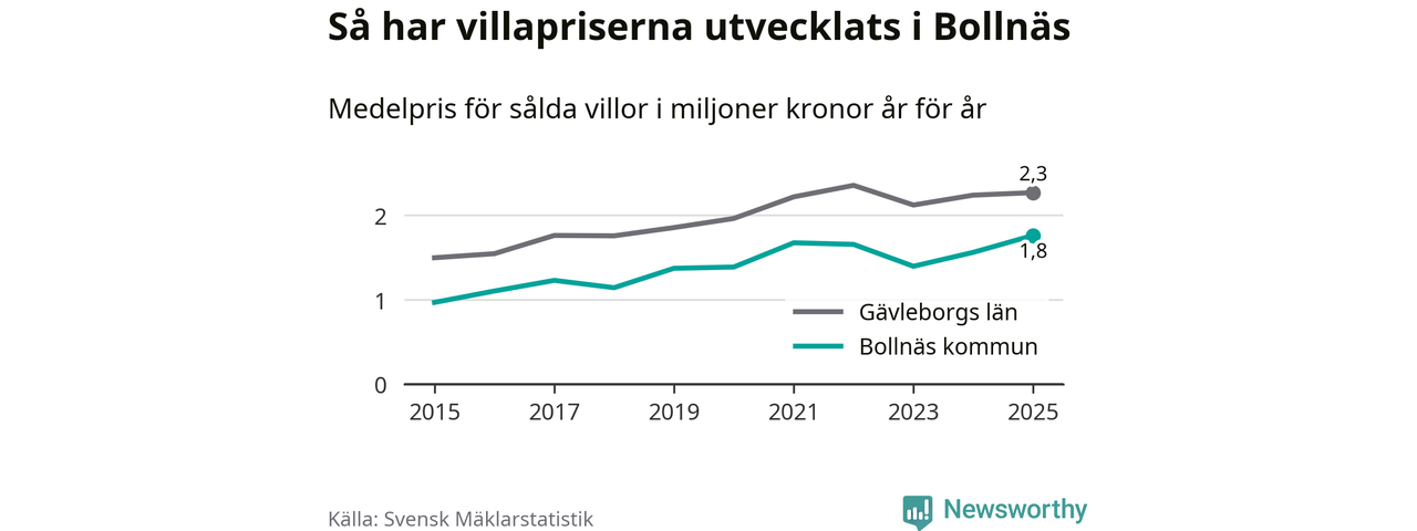 1,8 miljoner kronor är medelpriset för de villor som såldes i Bollnäs kommun under året, eller 15 954 kronor per kvadratmeter. Det innebär en prisökning med 13 procent på ett år. Det är det högsta årssnittet på åtminstone tio år.