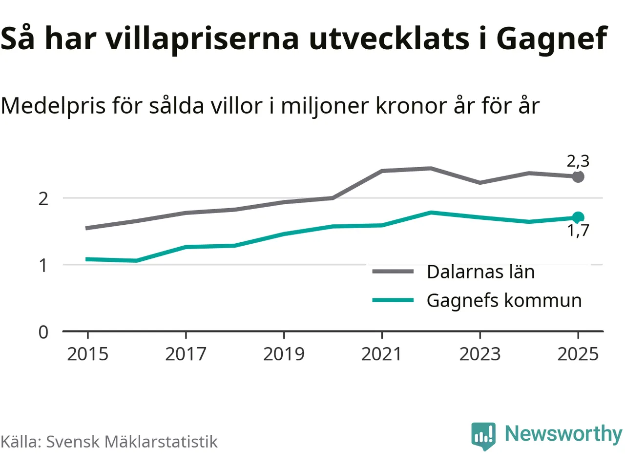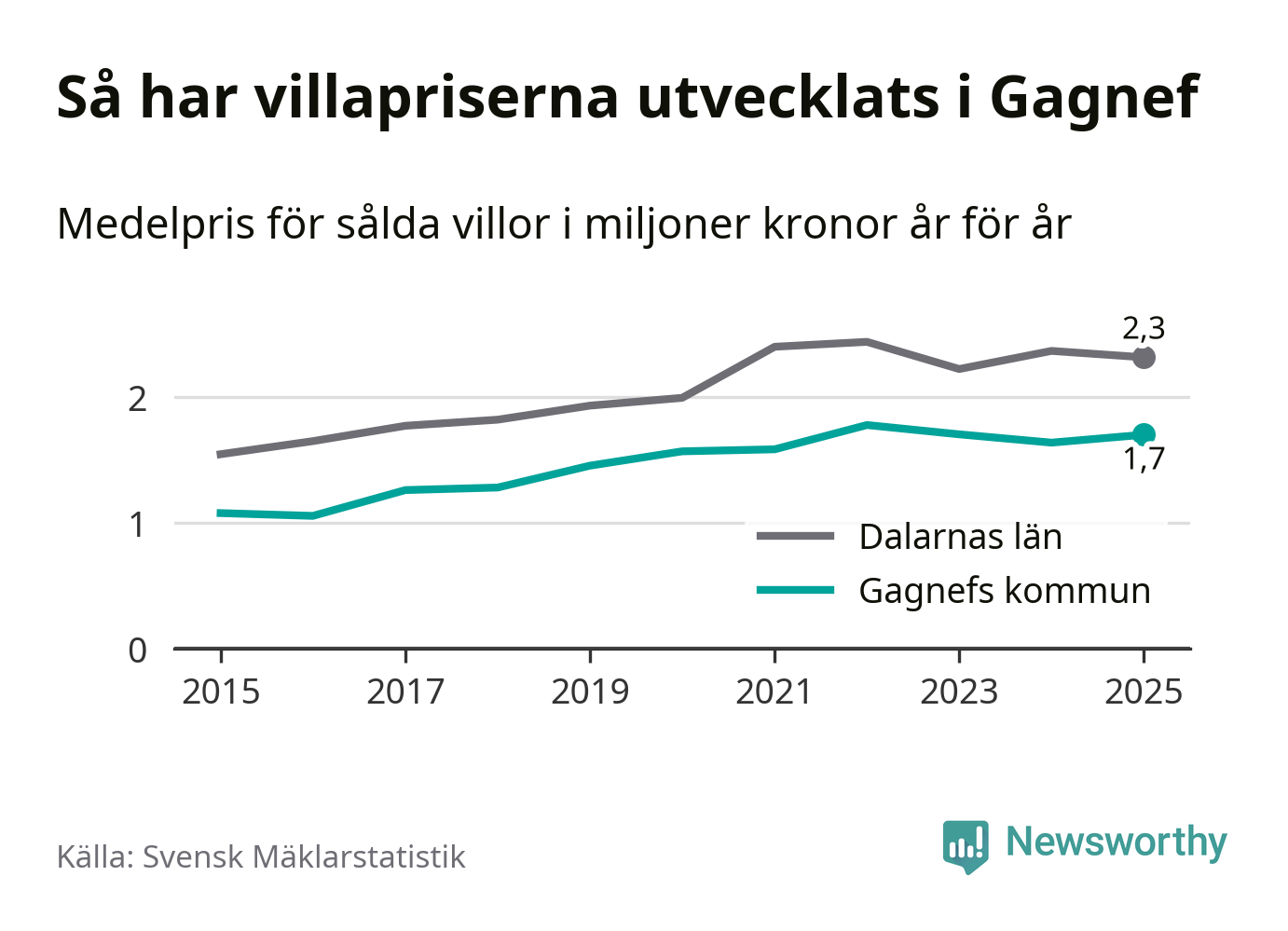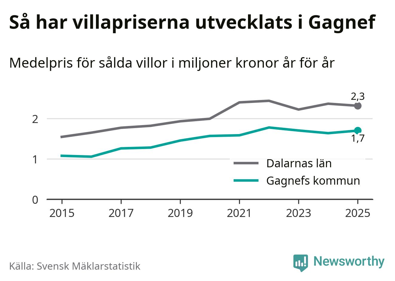 1,7 miljoner kronor är medelpriset för de villor som såldes i Gagnefs kommun under året, eller 15 766 kronor per kvadratmeter. Det innebär en prisökning med fyra procent på ett år.
