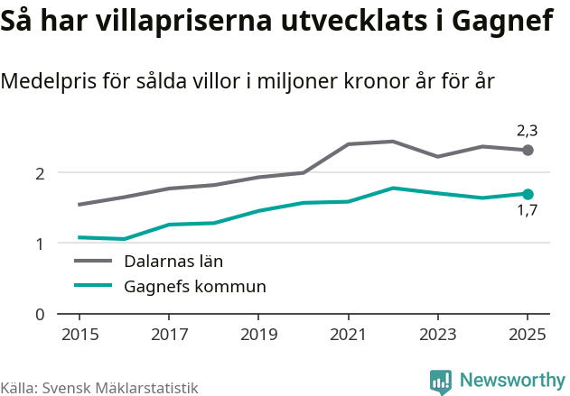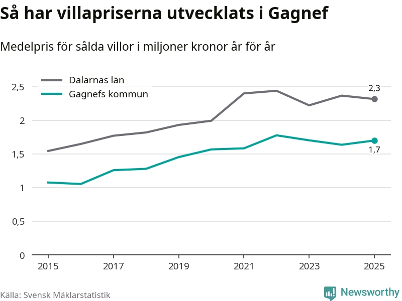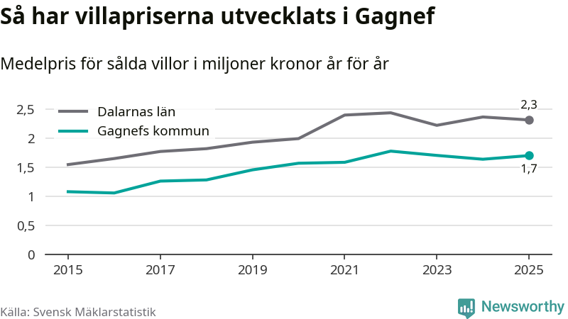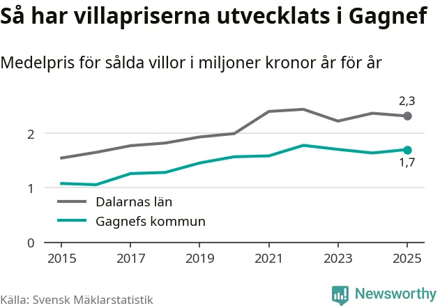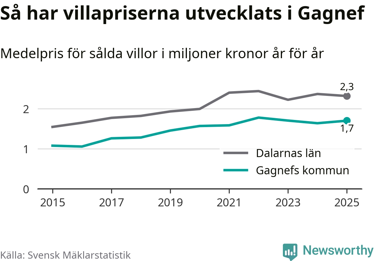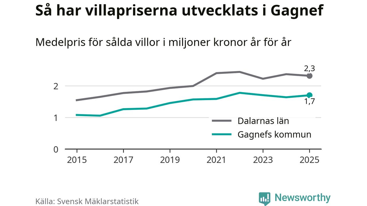 1,7 miljoner kronor är medelpriset för de villor som såldes i Gagnefs kommun under året, eller 15 766 kronor per kvadratmeter. Det innebär en prisökning med fyra procent på ett år.