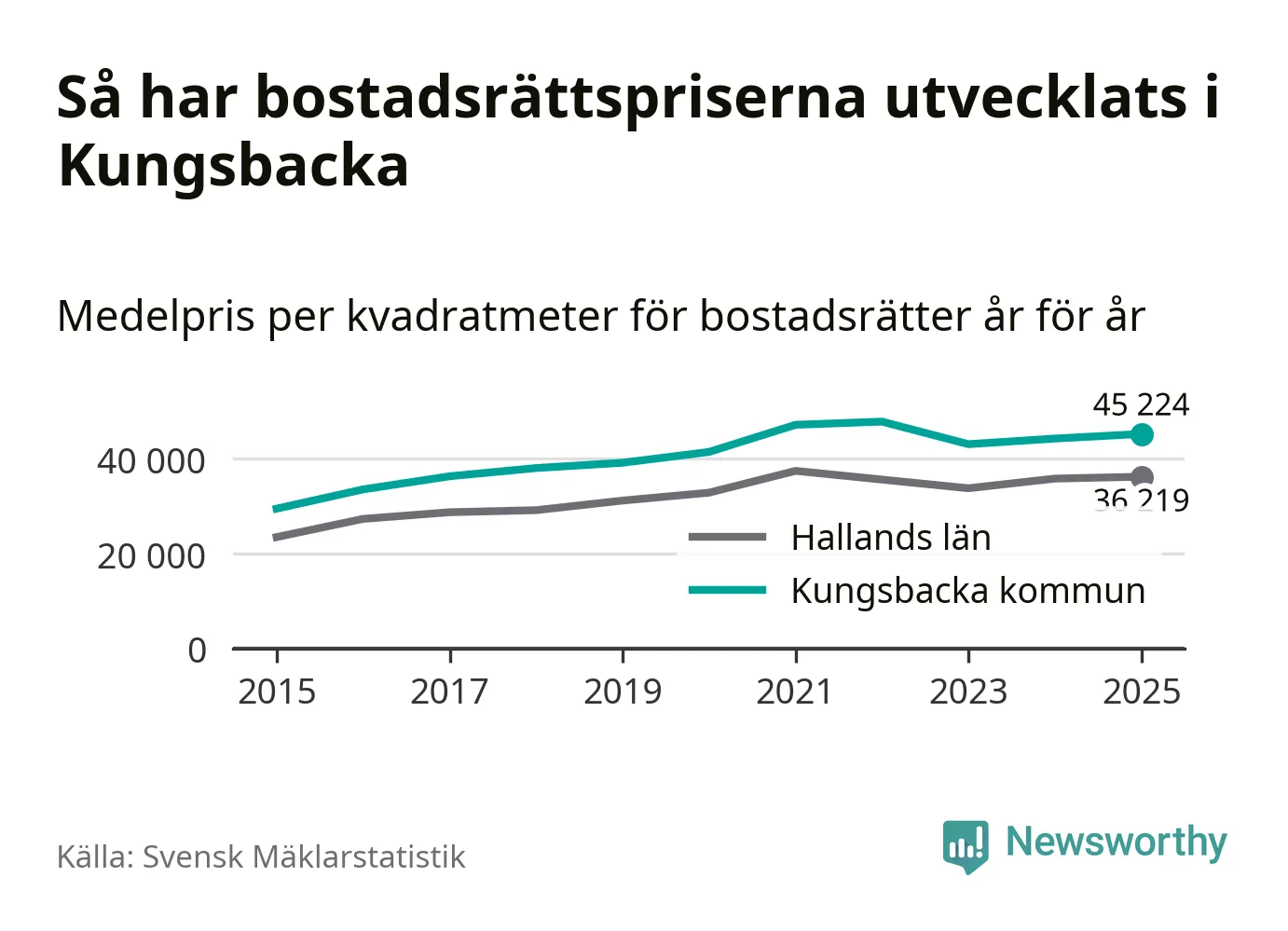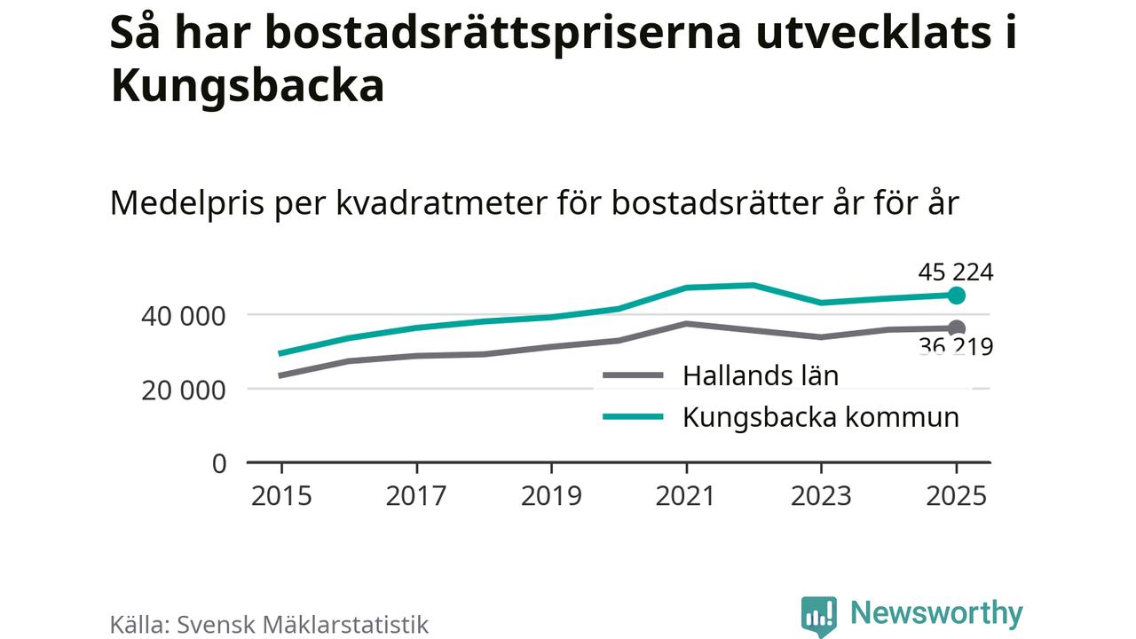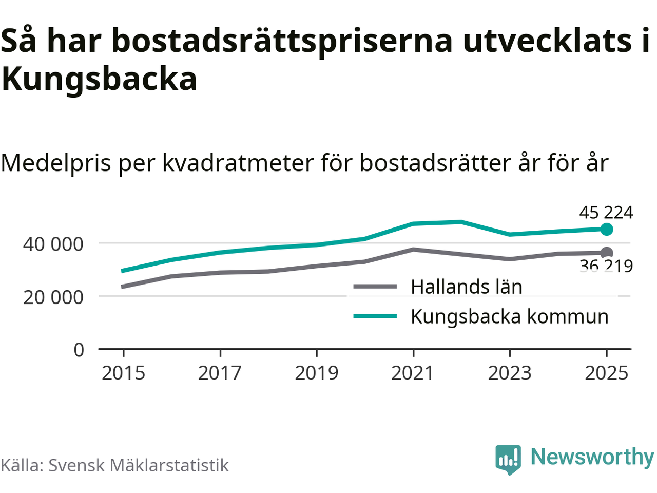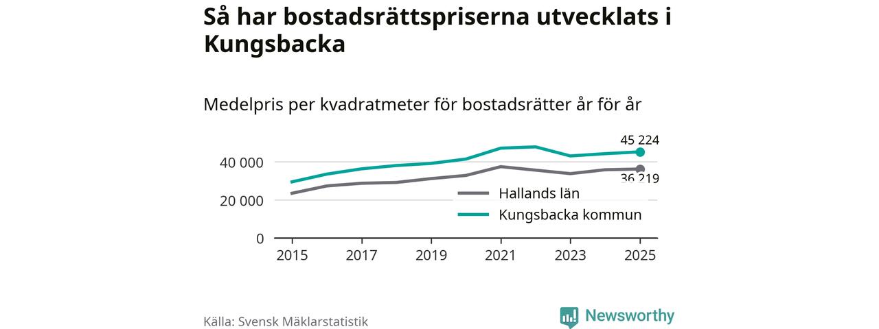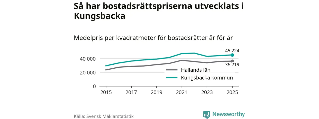 Det såldes totalt 467 bostadsrätter i Kungsbacka kommun under året. Genomsnittspriset per kvadratmeter landade på 45 224 kronor. Det är en ökning med två procent i kommunen på ett år.