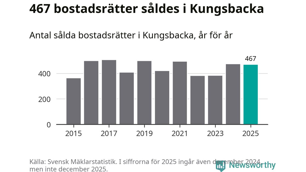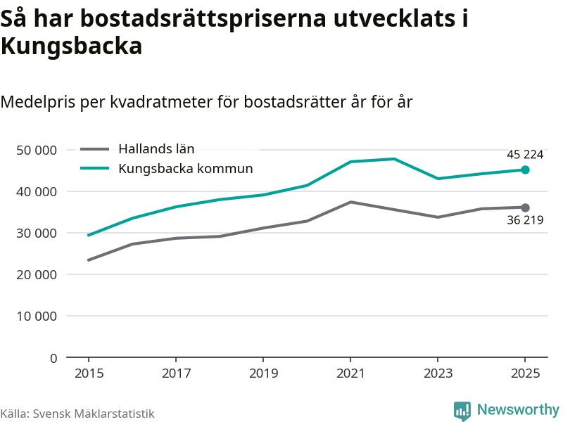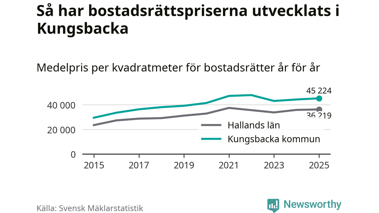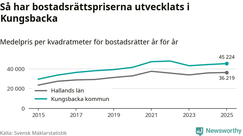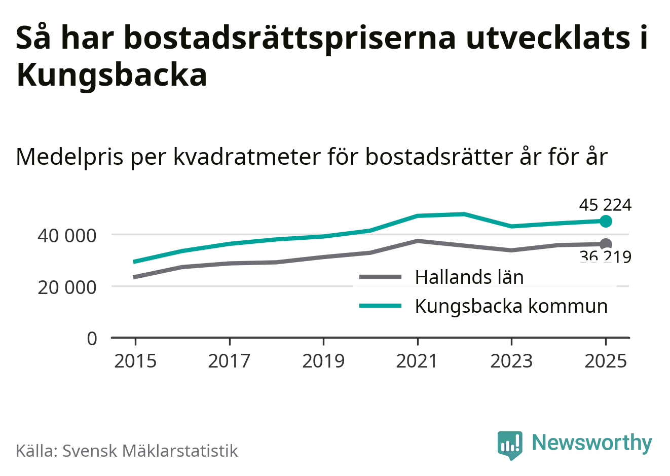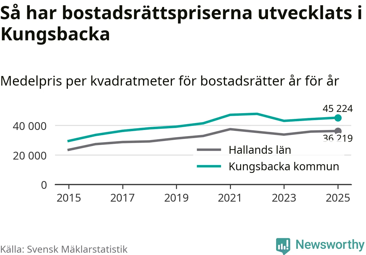 Det såldes totalt 467 bostadsrätter i Kungsbacka kommun under året. Genomsnittspriset per kvadratmeter landade på 45 224 kronor. Det är en ökning med två procent i kommunen på ett år.