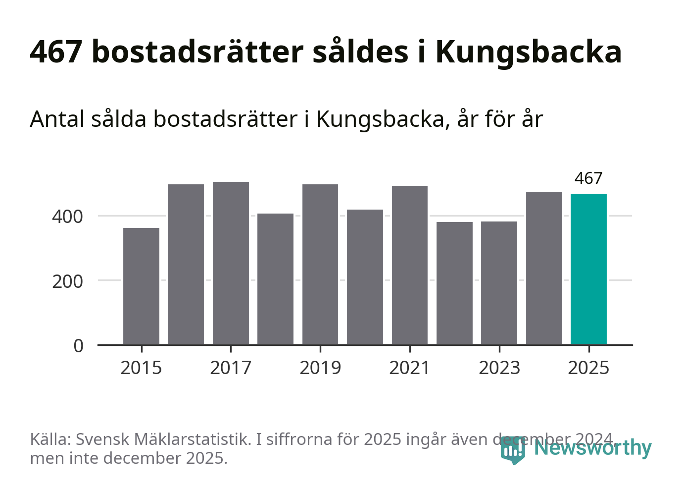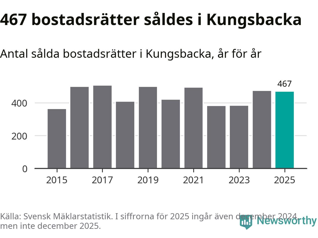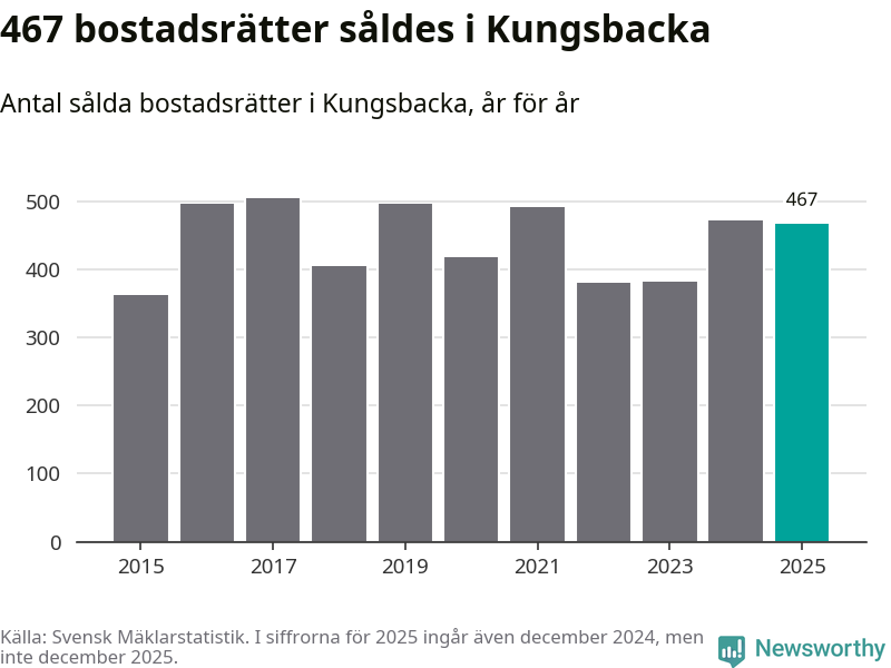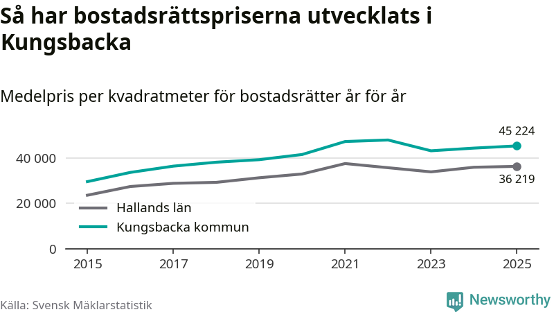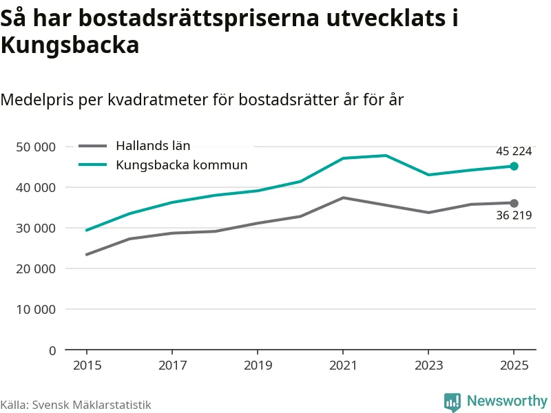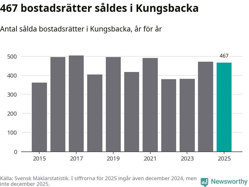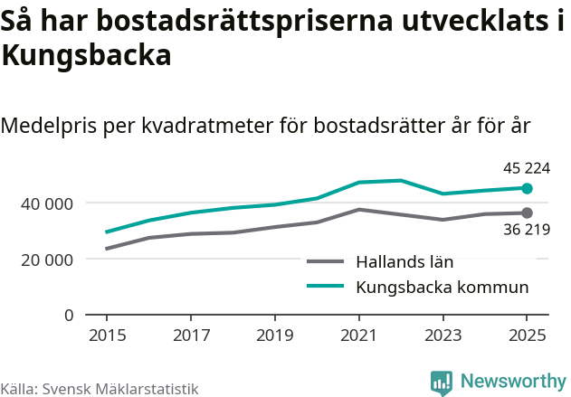 Det såldes totalt 467 bostadsrätter i Kungsbacka kommun under året. Genomsnittspriset per kvadratmeter landade på 45 224 kronor. Det är en ökning med två procent i kommunen på ett år.