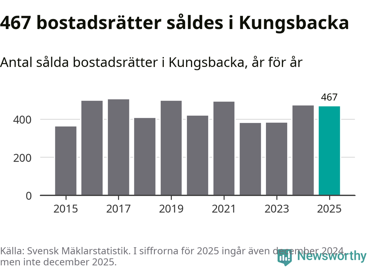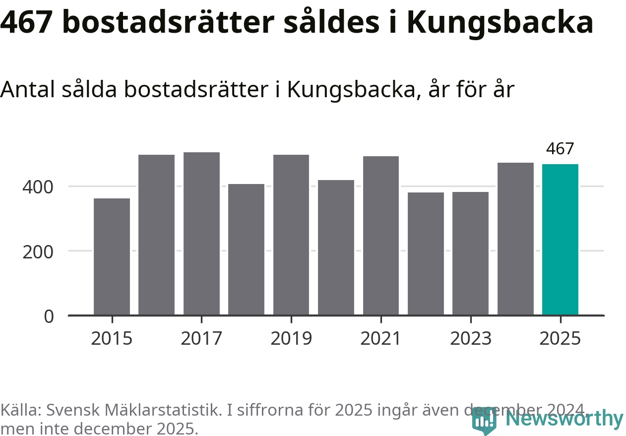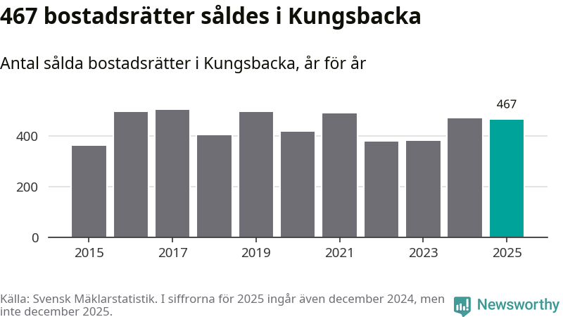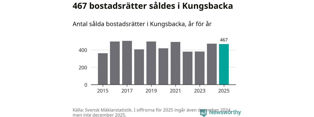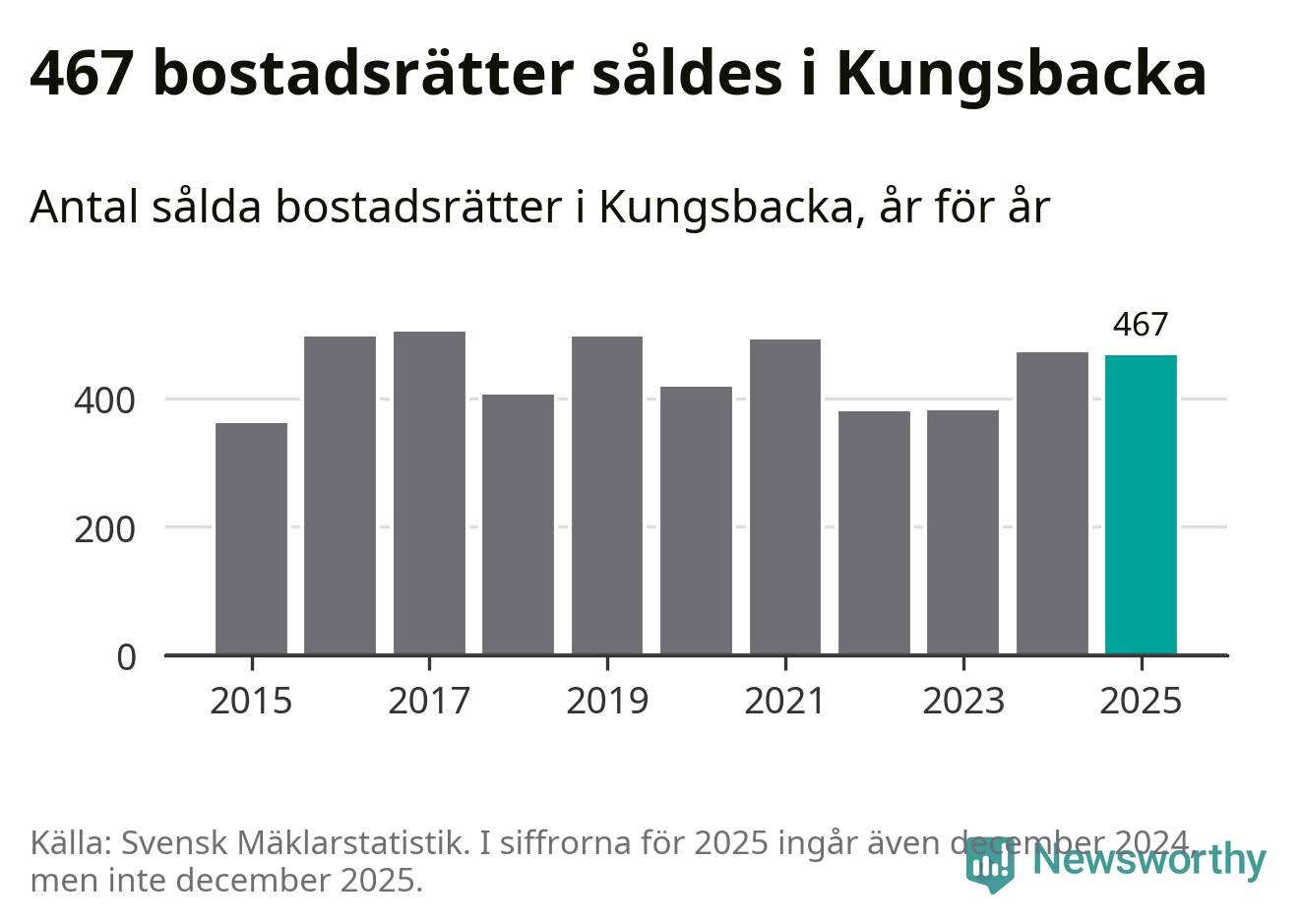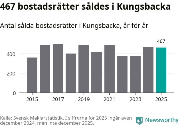 Det såldes totalt 467 bostadsrätter i Kungsbacka kommun under året. Genomsnittspriset per kvadratmeter landade på 45 224 kronor. Det är en ökning med två procent i kommunen på ett år.