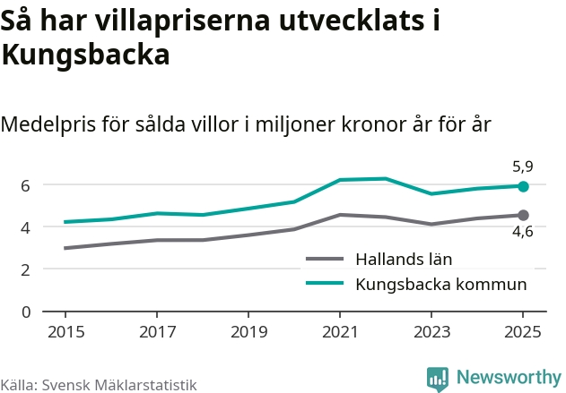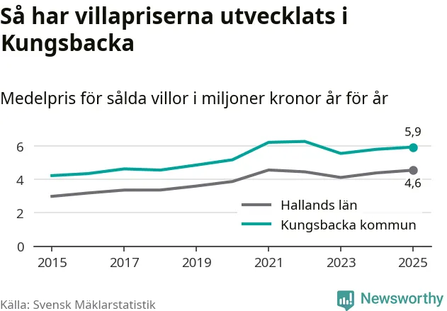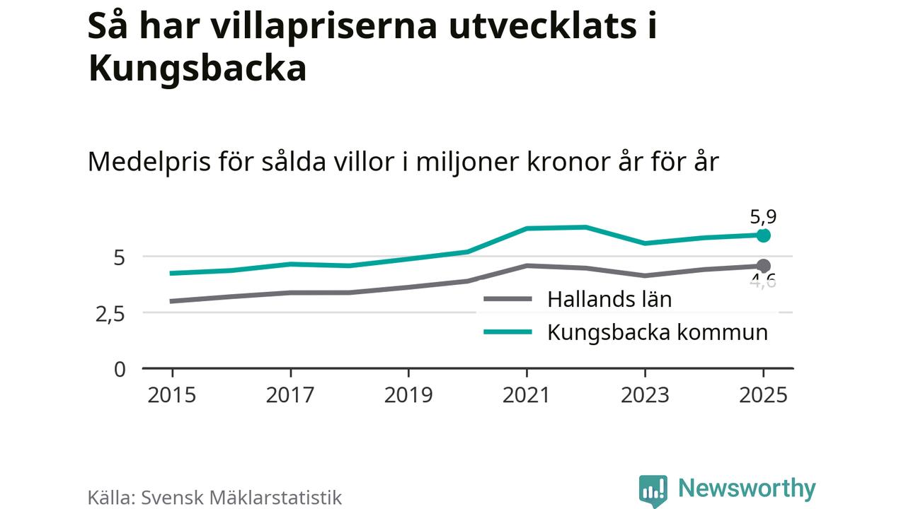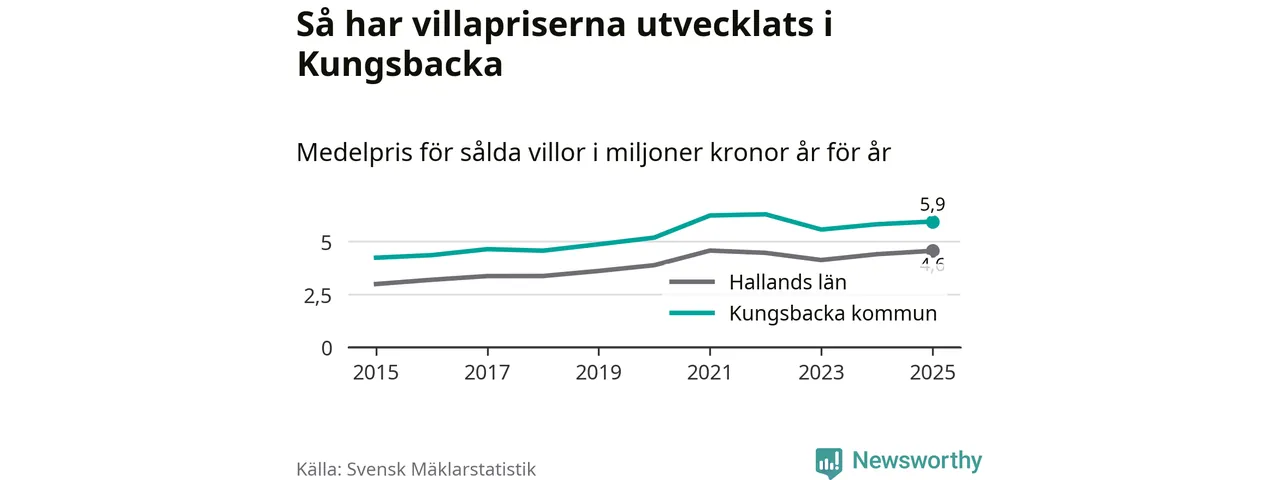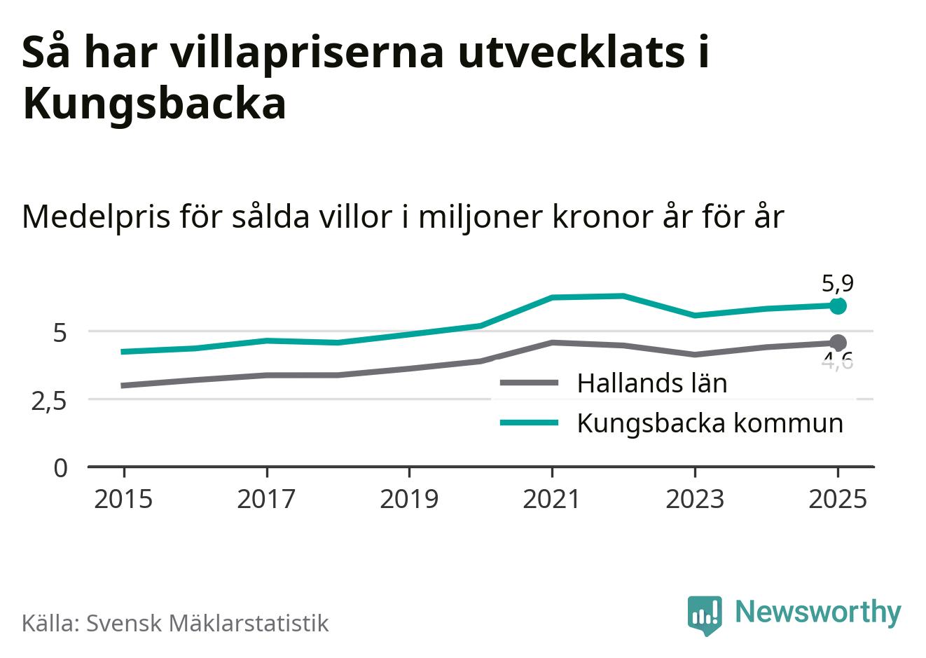 5,9 miljoner kronor är medelpriset för de villor som såldes i Kungsbacka kommun under året, eller 44 708 kronor per kvadratmeter. Det innebär en prisökning med två procent på ett år och är andra året i rad som priserna ökar i kommunen.