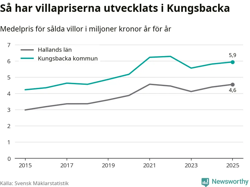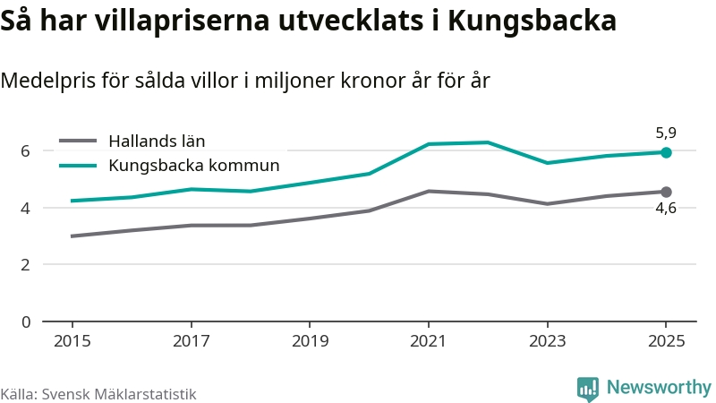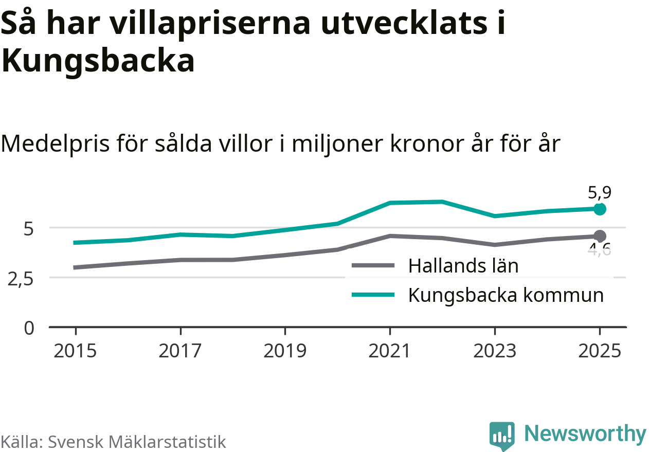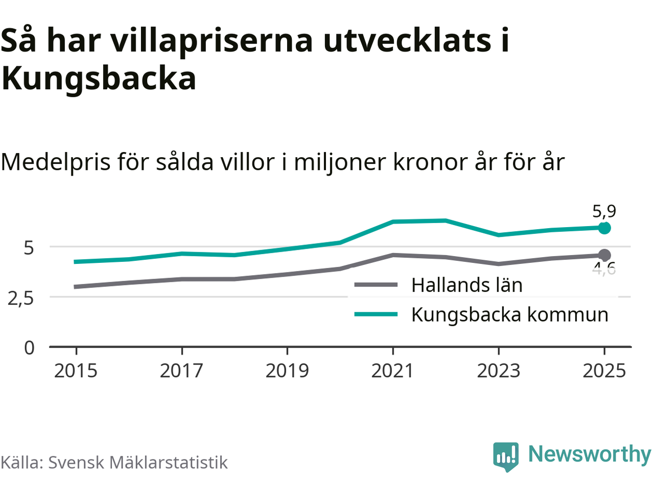 5,9 miljoner kronor är medelpriset för de villor som såldes i Kungsbacka kommun under året, eller 44 708 kronor per kvadratmeter. Det innebär en prisökning med två procent på ett år och är andra året i rad som priserna ökar i kommunen.