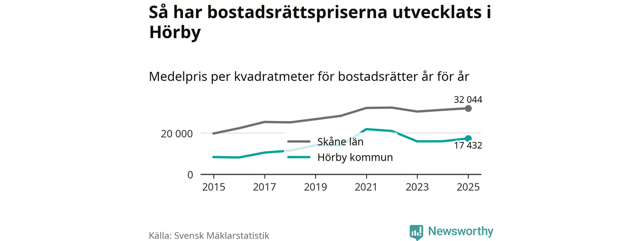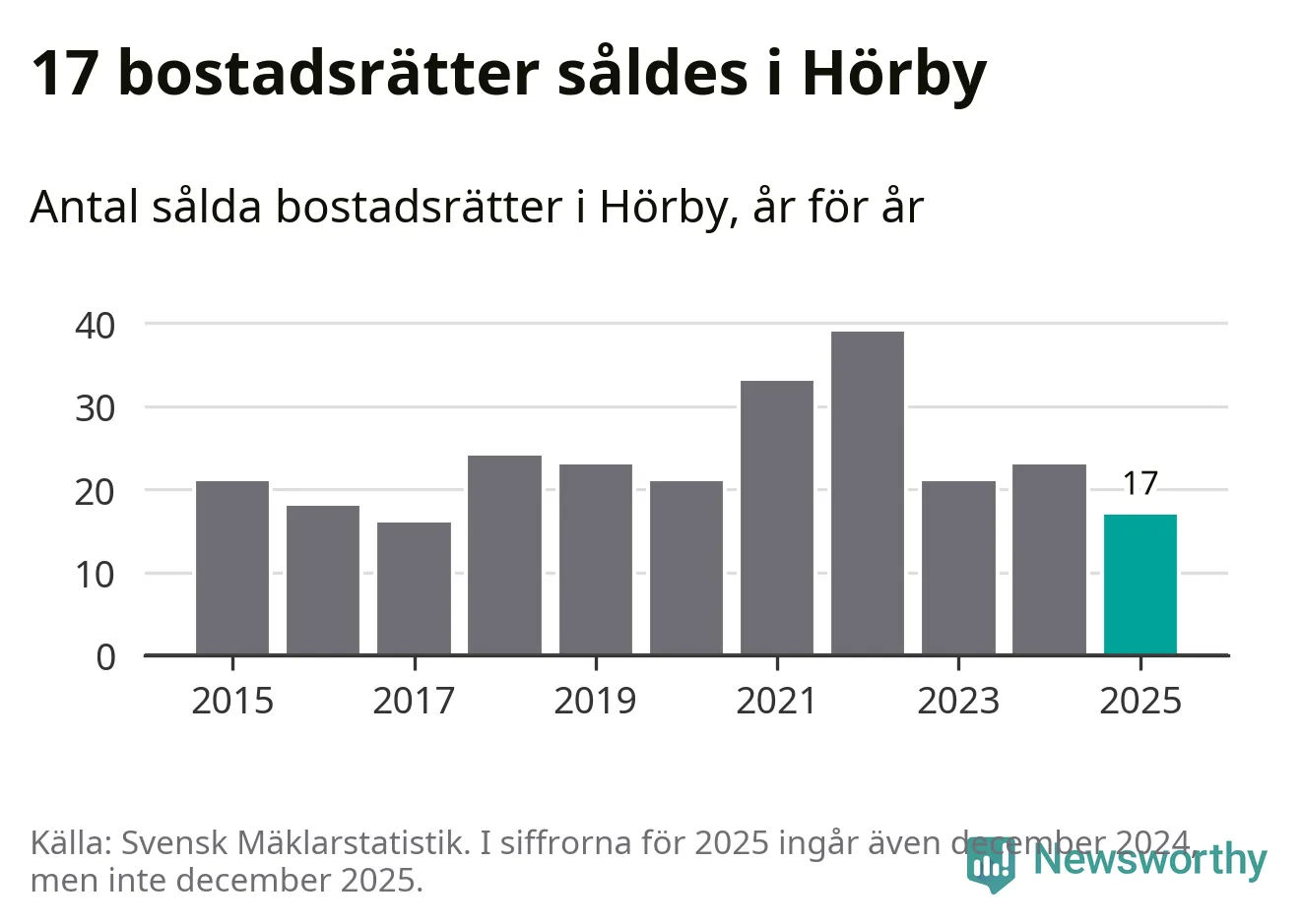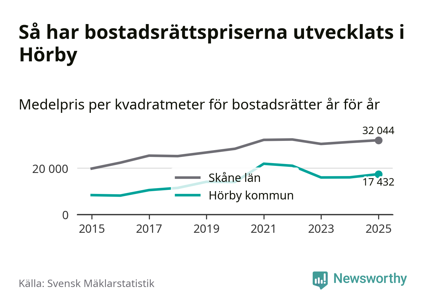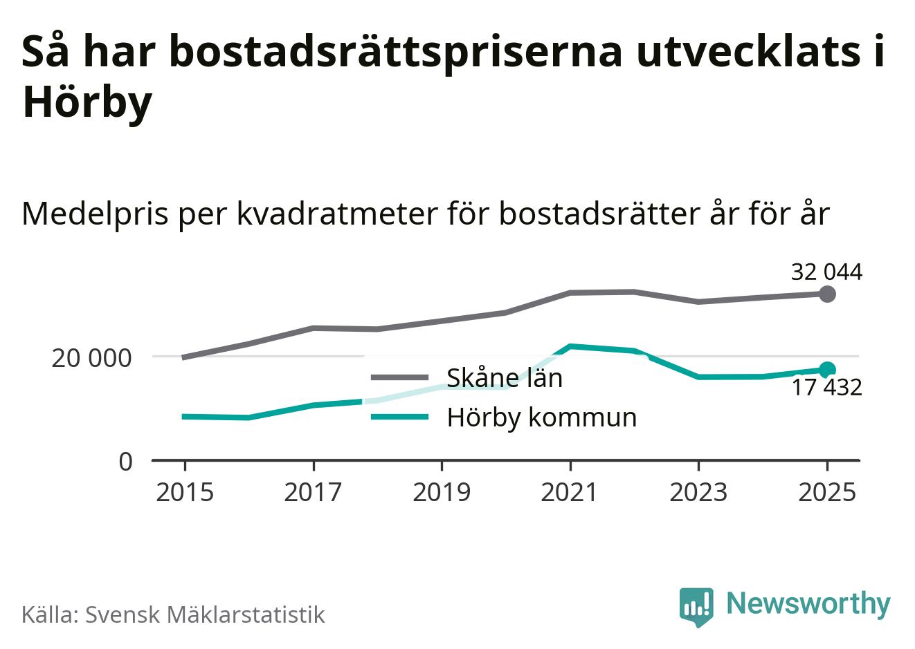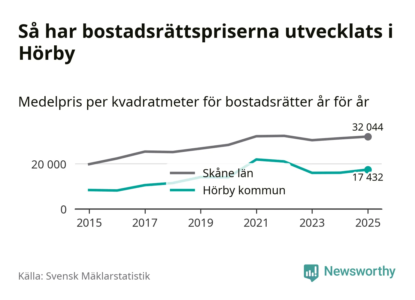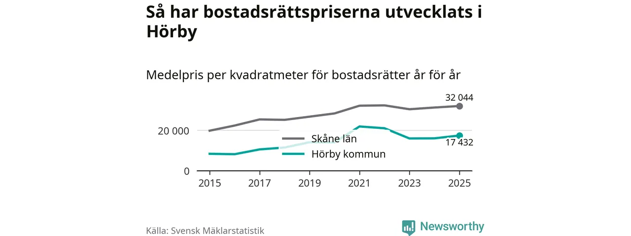 När det gäller bostadsrätter i Hörby kommun såldes 17 under året. Snittet per kvadratmeter landade på omkring 17 400 kronor. Det är en ökning jämfört med förra året.