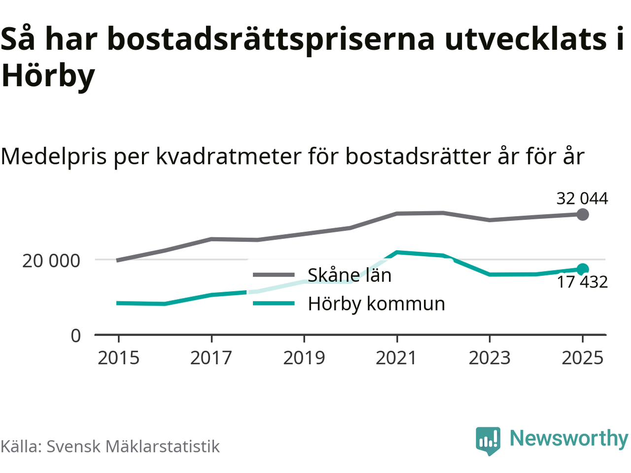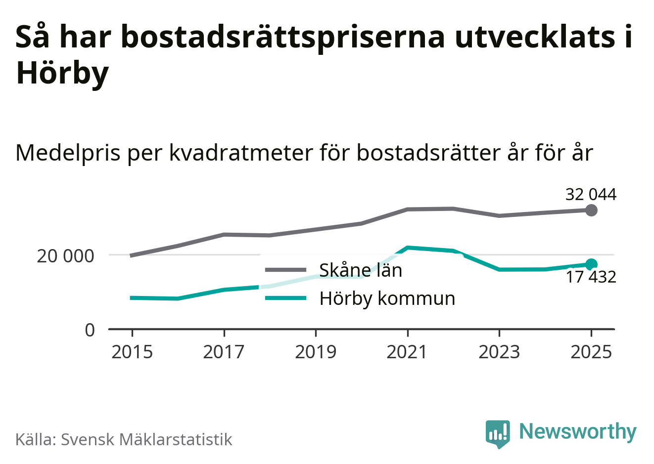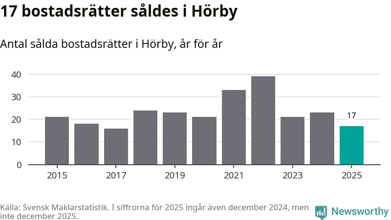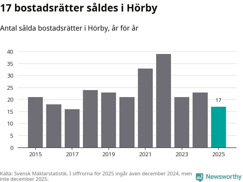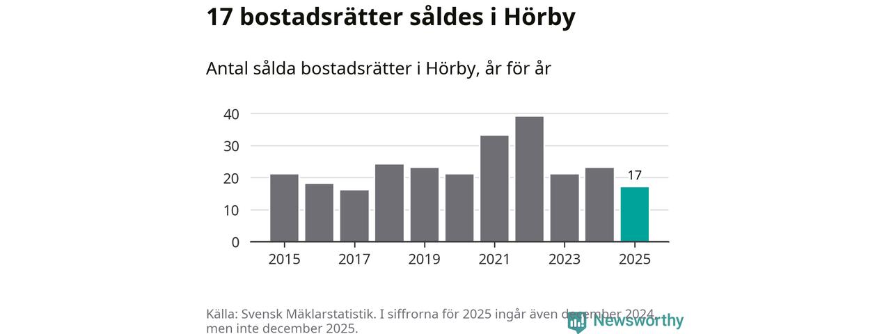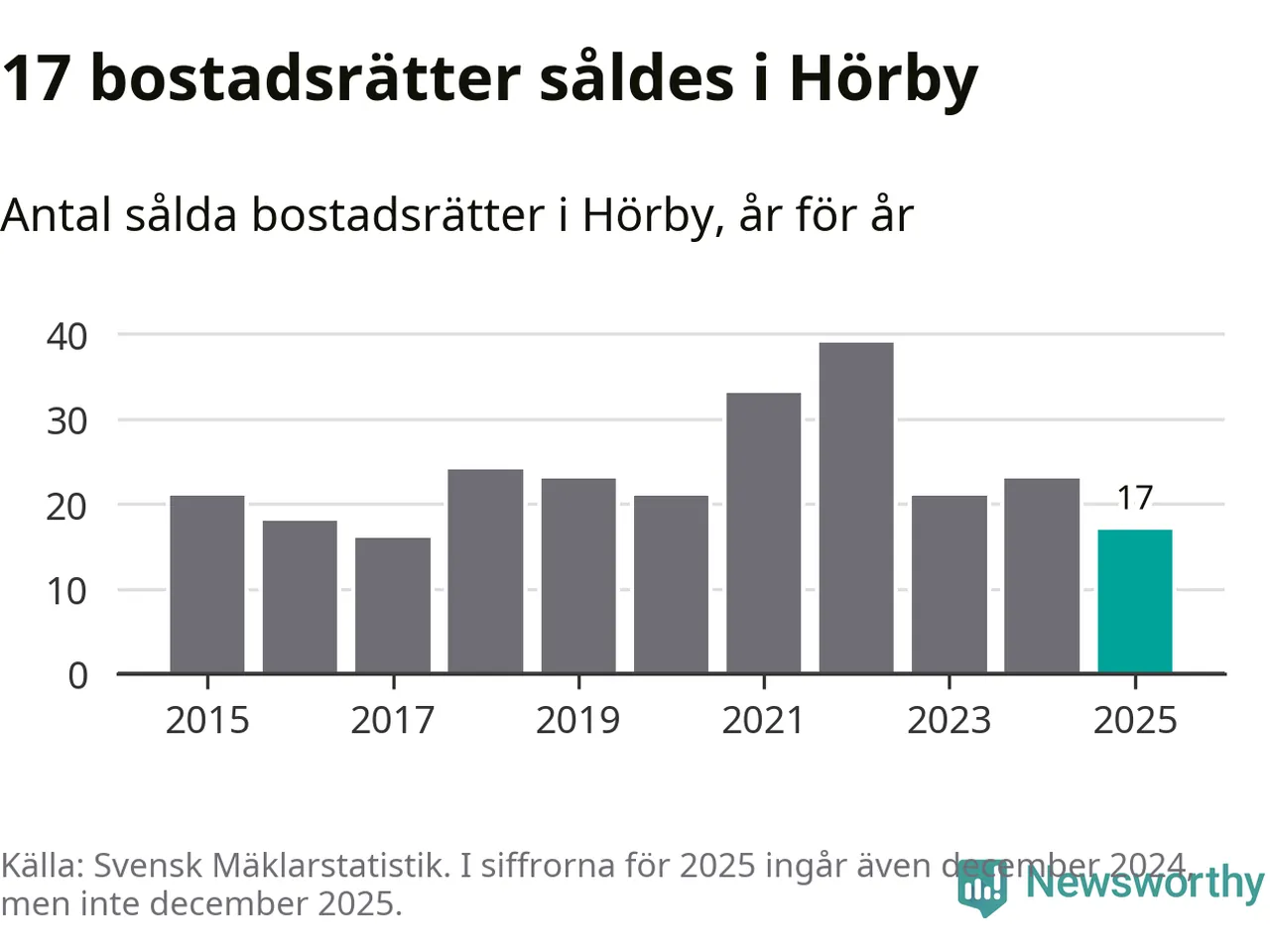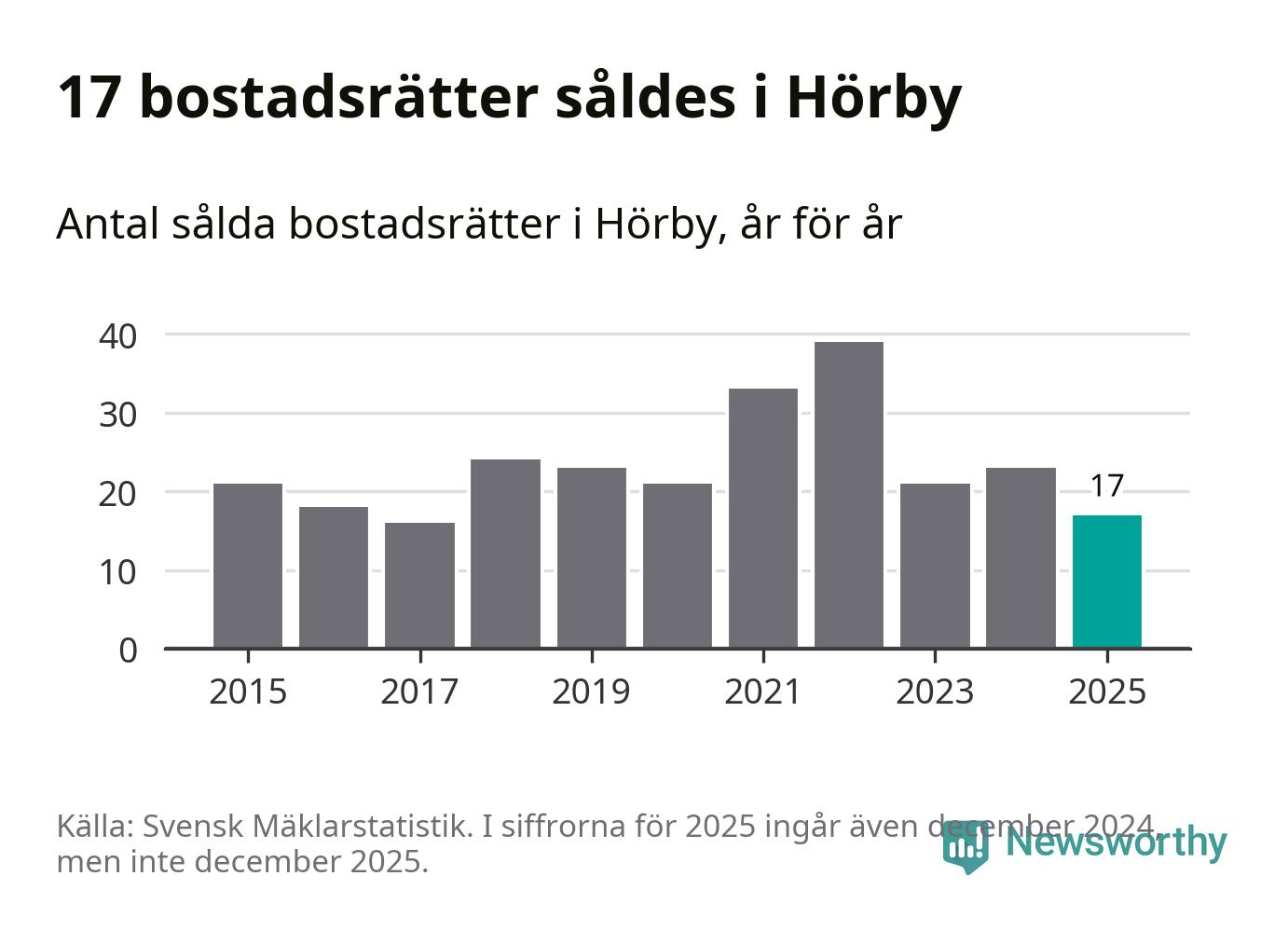 När det gäller bostadsrätter i Hörby kommun såldes 17 under året. Snittet per kvadratmeter landade på omkring 17 400 kronor. Det är en ökning jämfört med förra året.